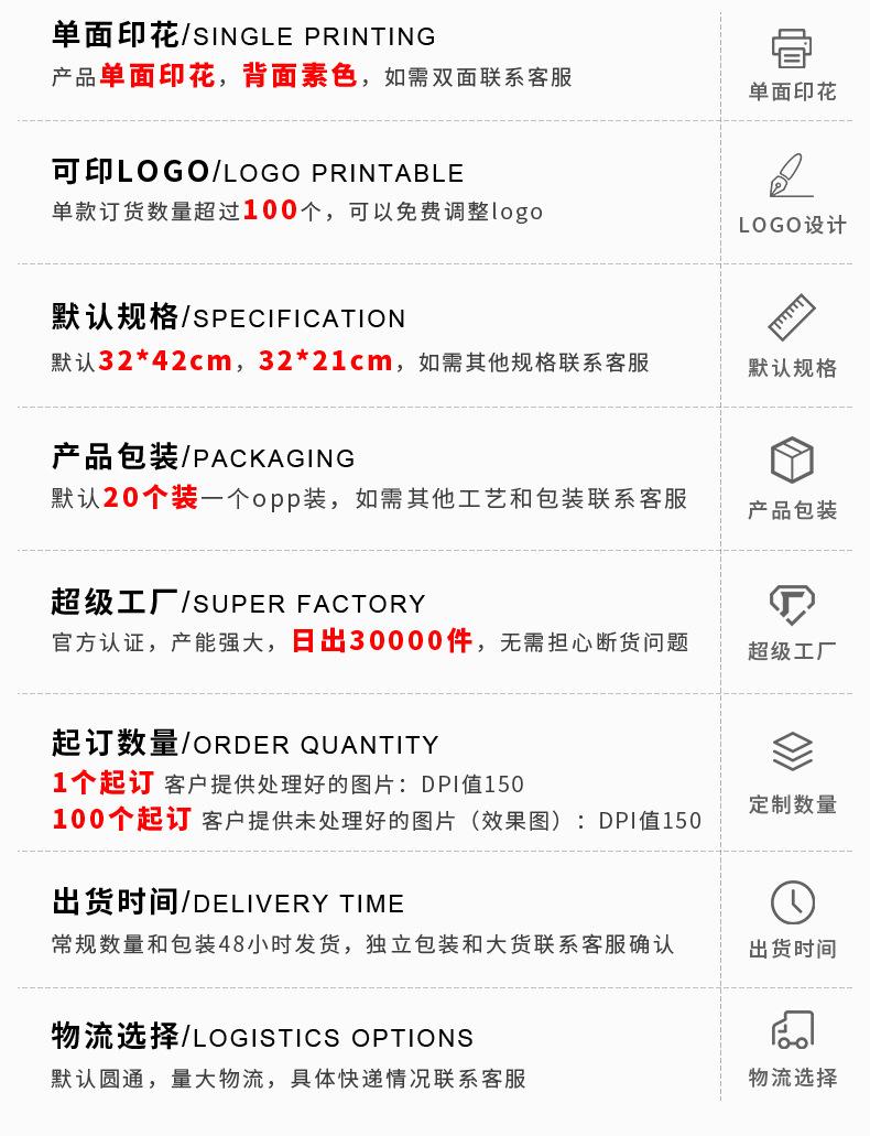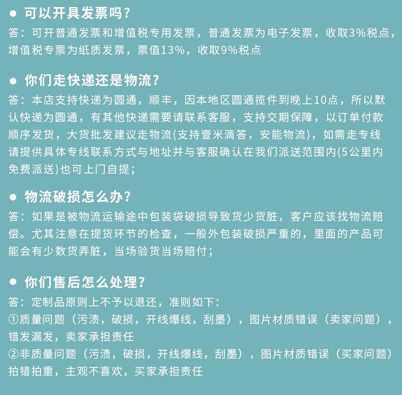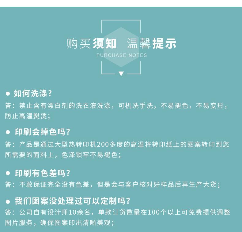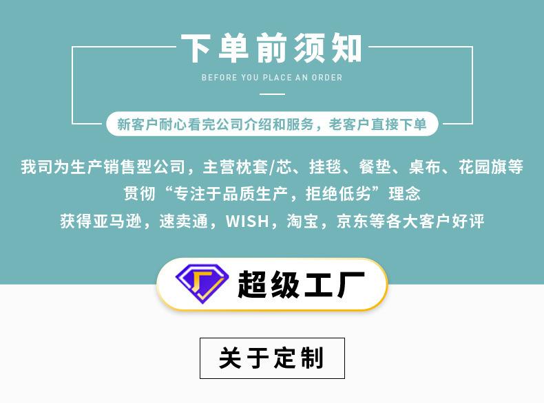 2. Los productos impresos (fundas de almohada, caminos de mesa, banderas de jardín, manteles, manteles individuales y tapices) se producen temporalmente bajo pedido. Si no hay ningún problema de calidad, no se aceptan devoluciones ni cambios. ¡Por favor, comprenda!