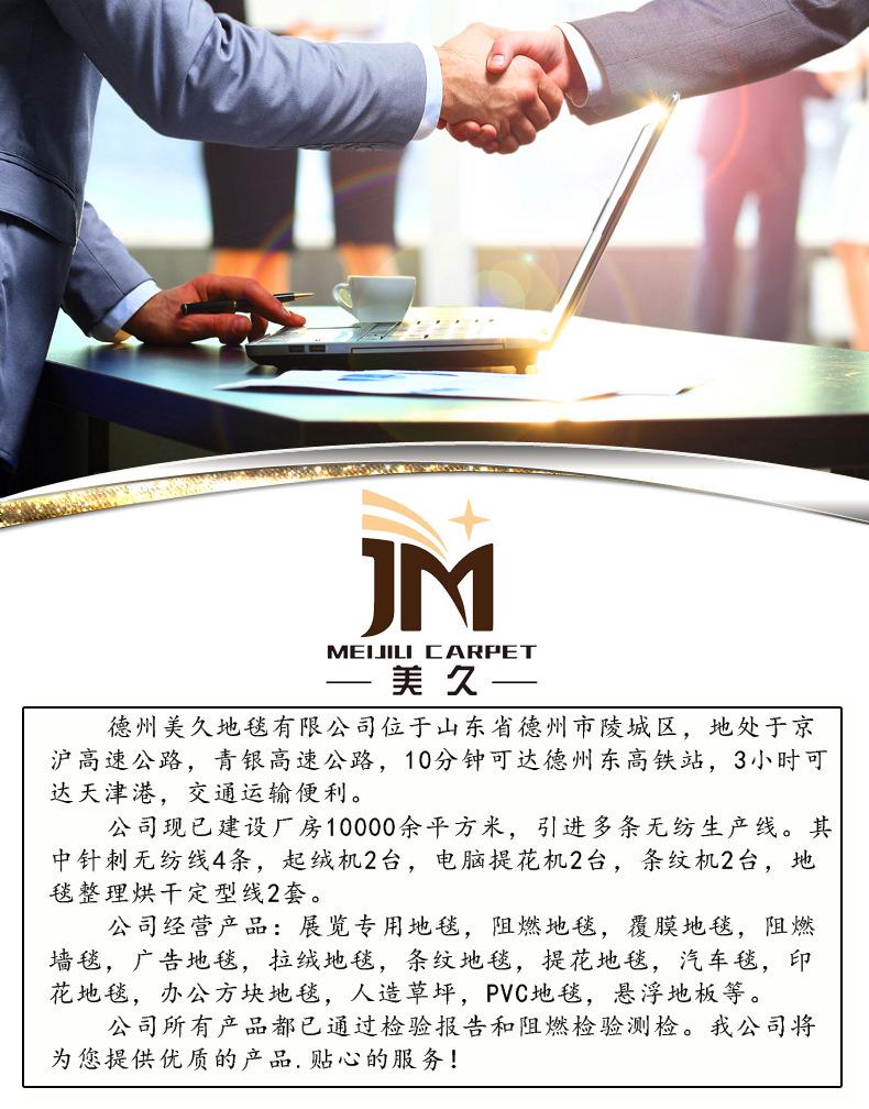 Dezhou Meijiu Carpet Co., Ltd. se dedica principalmente a alfombras para exposiciones, alfombras de pared completa, alfombras ignífugas, alfombras jacquard, alfombras cepilladas, alfombras a rayas, alfombras publicitarias, alfombras estampadas, alfombras cuadradas para oficina, alfombras empalmadas, alfombras de PVC, tapetes antideslizantes, césped artificial, pisos elevados, tapetes y otros productos. La empresa también acepta muestras de clientes para personalizar el procesamiento de alfombras con patrones de logotipo.