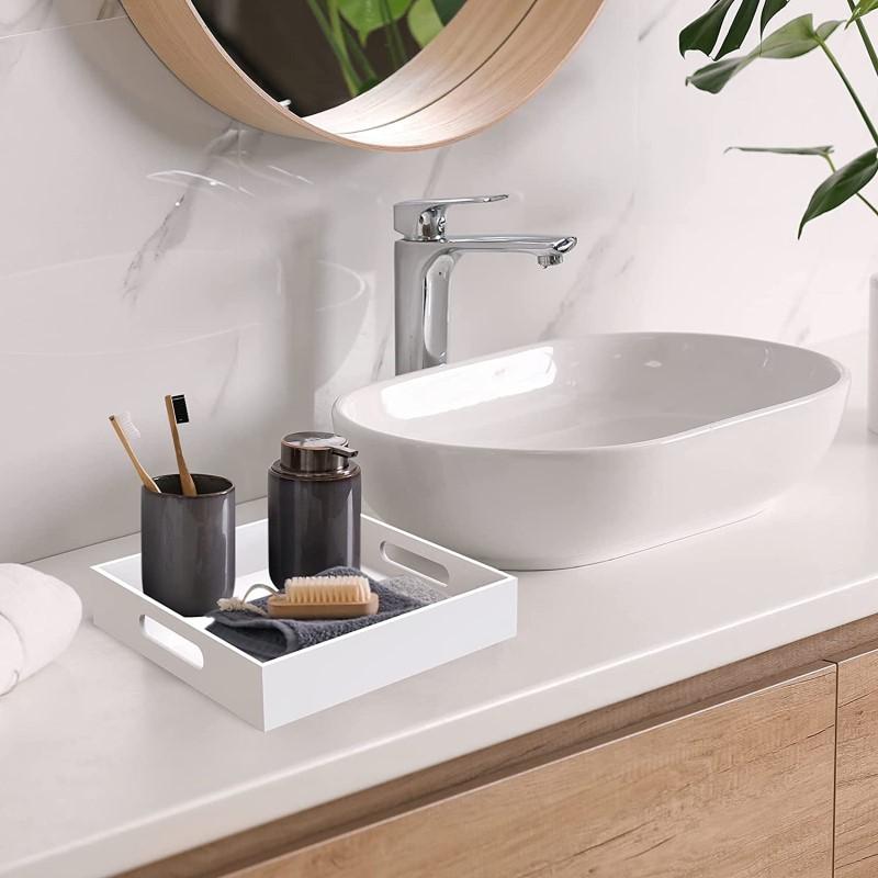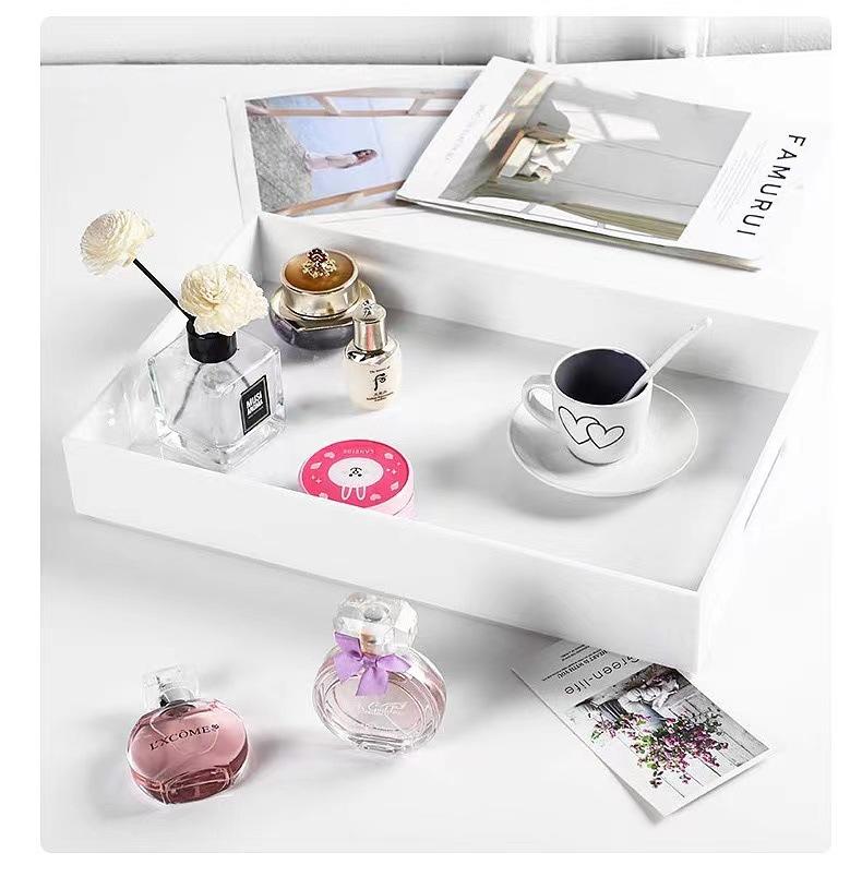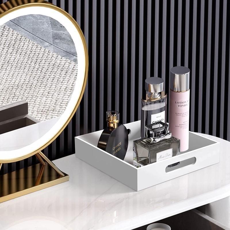 Bandeja de almacenamiento de hotel de acrílico al por mayor, bandeja antifugas con espejo, caja de almacenamiento rectangular con asa