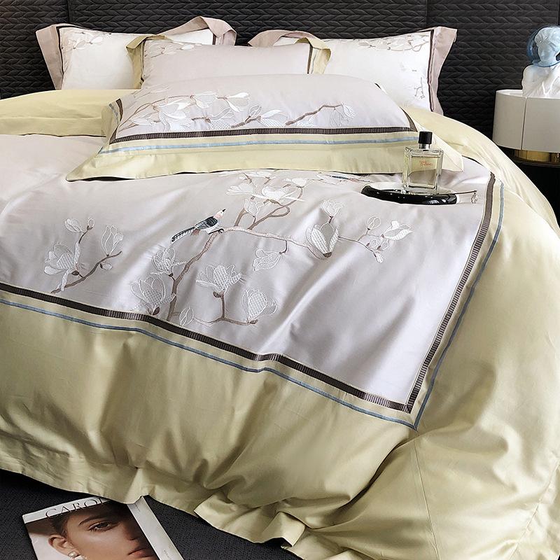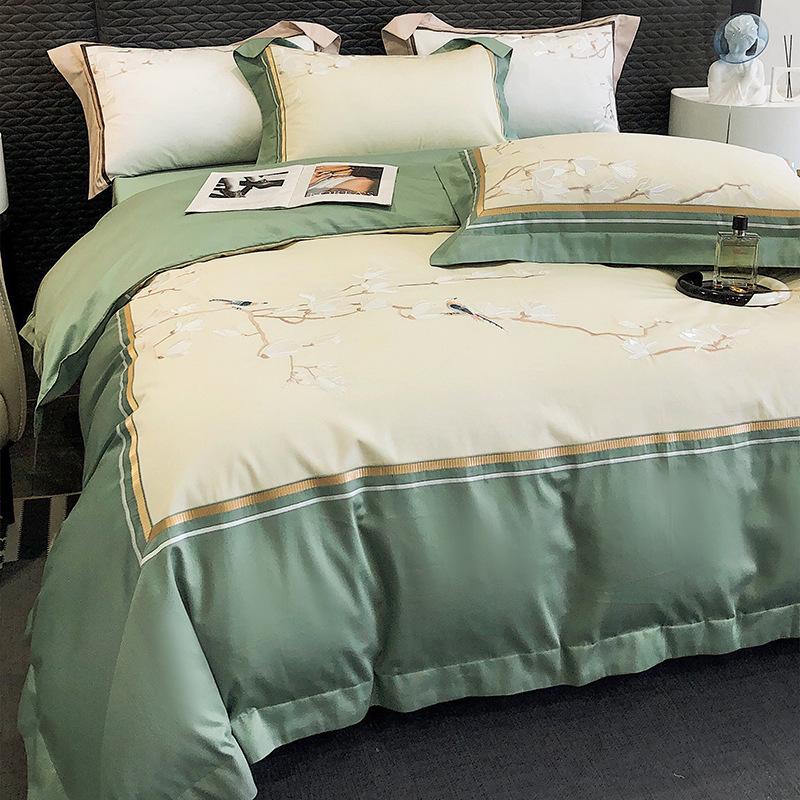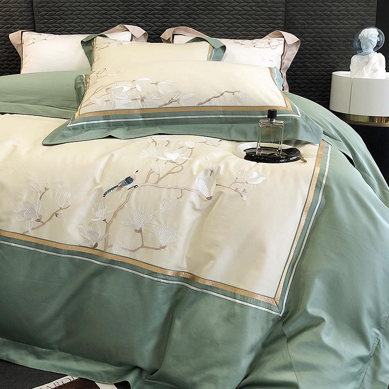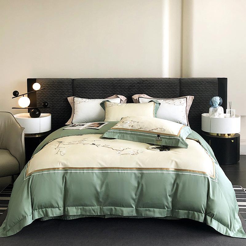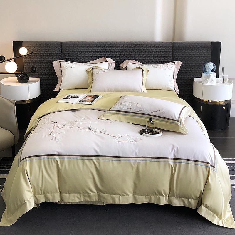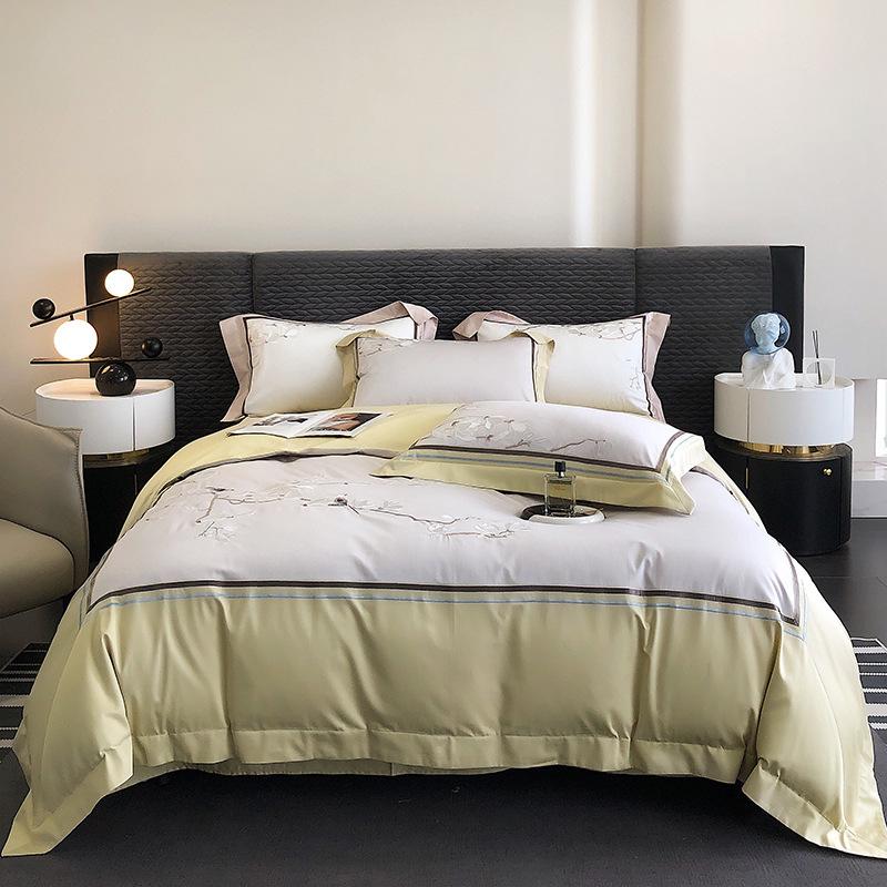 Edredón de jacquard ligero de lujo de cuatro piezas de algodón puro de fibra larga 100% estilo francés, funda de cama, sábana ajustable