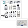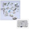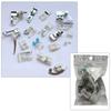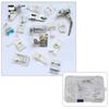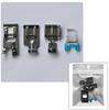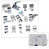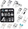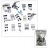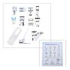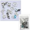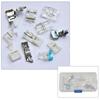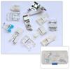 Juego de 11 piezas en bolsa de polipropileno: 7308A (prensatelas para dobladillo invisible), 7310C (prensatelas de bloqueo), 7307 (prensatelas para rizar), 7306 (prensatelas para cremalleras), 702 (prensatelas para plisados), 7306A (prensatelas para cremalleras invisibles), 722 (prensatelas con rodillo para cuero), 9909 (prensatelas para apliques), 601 (prensatelas para cremalleras invisibles), 7305 (prensatelas para botones), 9910 (prensatelas para abalorios).