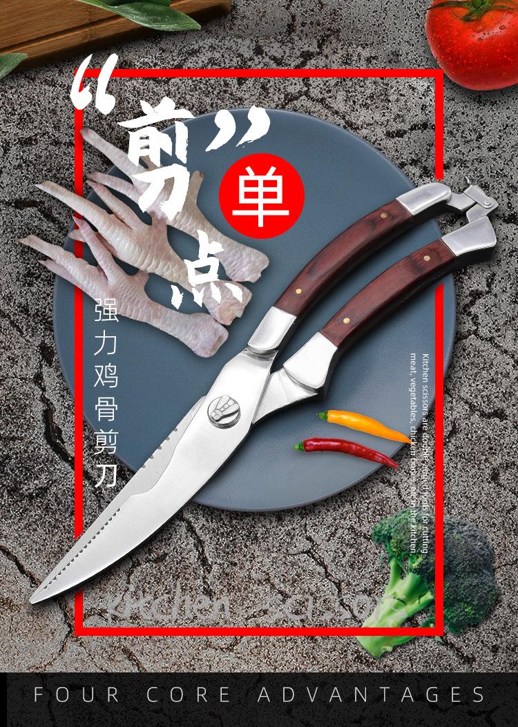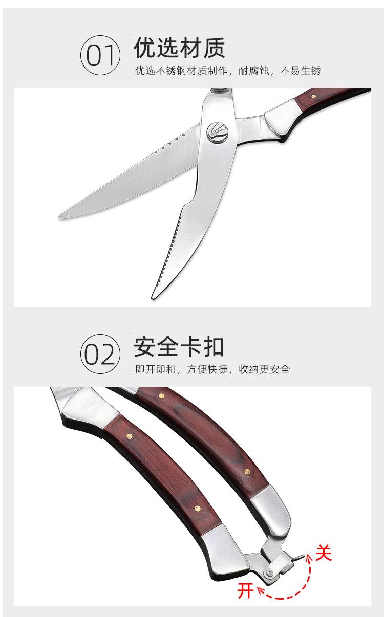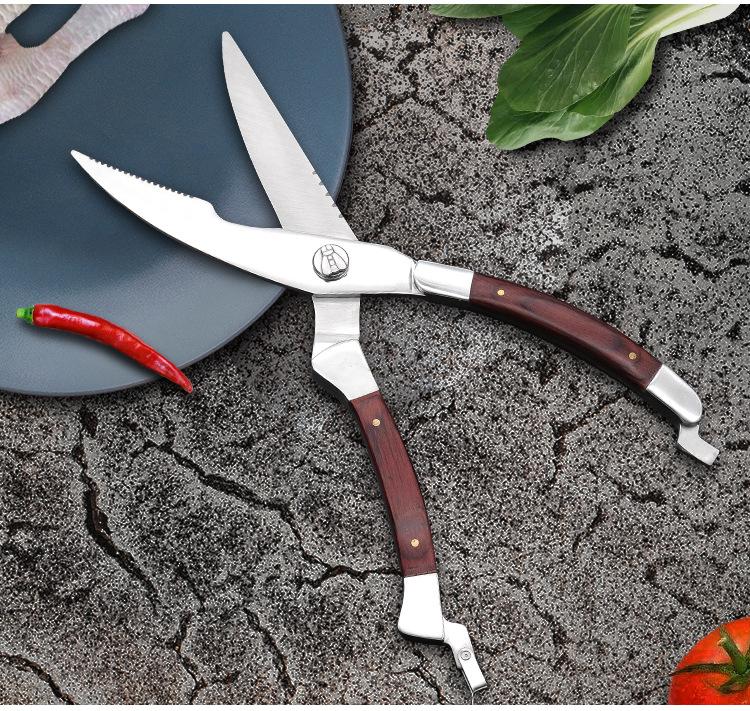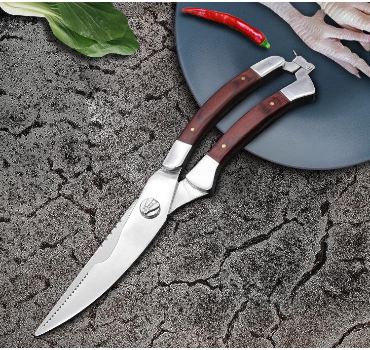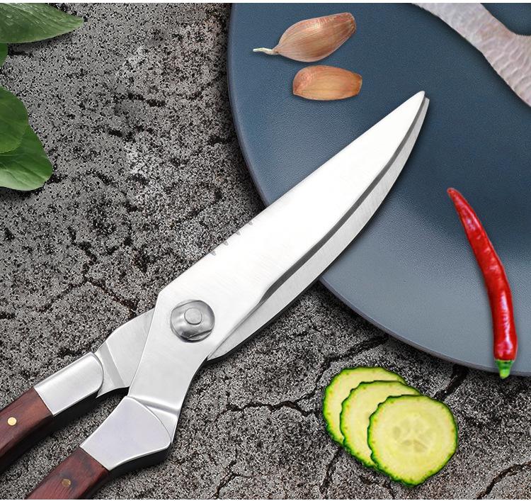 Tijeras de acero inoxidable para hueso de pollo, de madera y color, venta al por mayor de fábrica, tijeras de cocina de acero inoxidable, tijeras de cocina multiusos para el hogar.