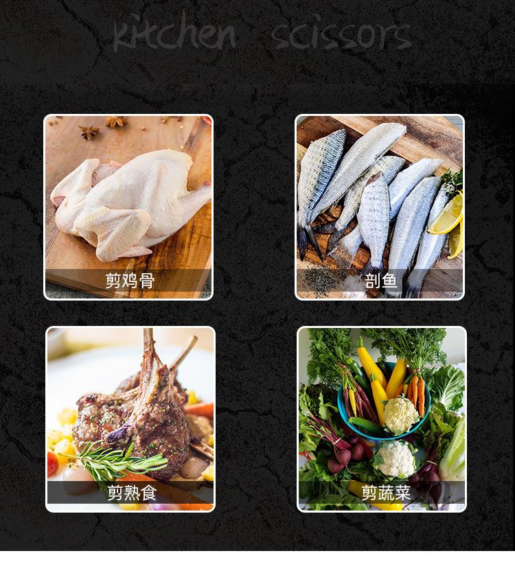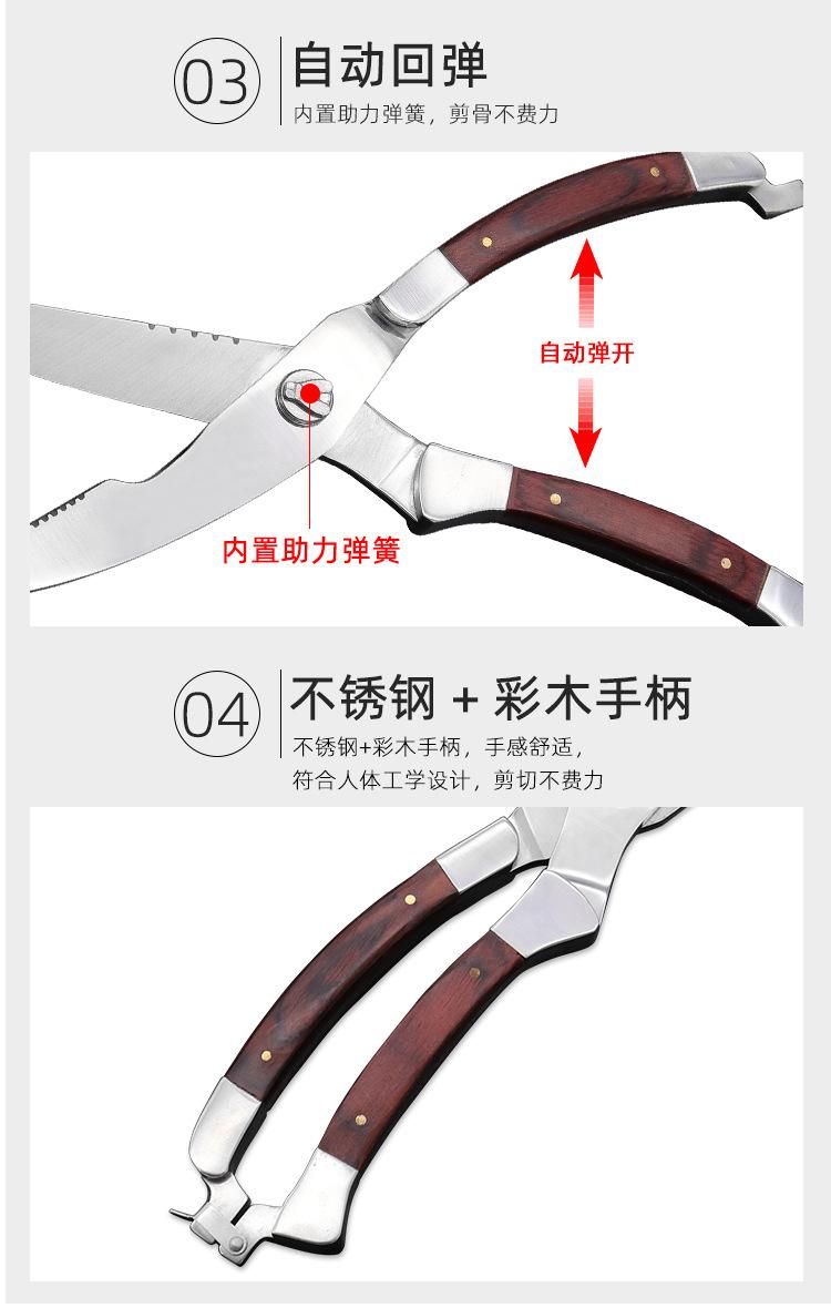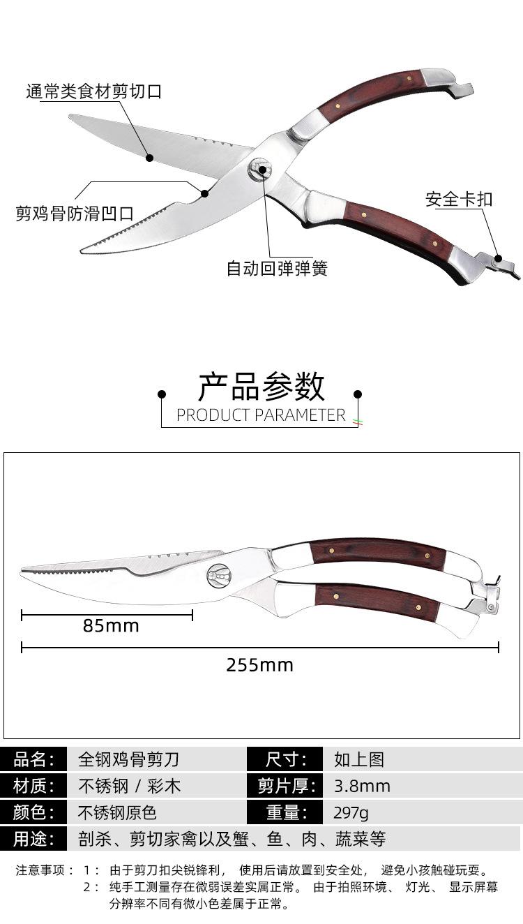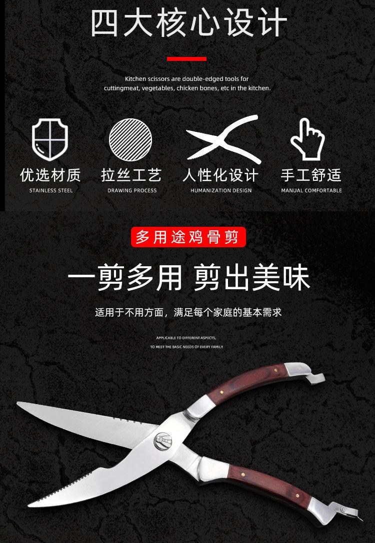 Tijeras de acero inoxidable para hueso de pollo, de madera y color, venta al por mayor de fábrica, tijeras de cocina de acero inoxidable, tijeras de cocina multiusos para el hogar.