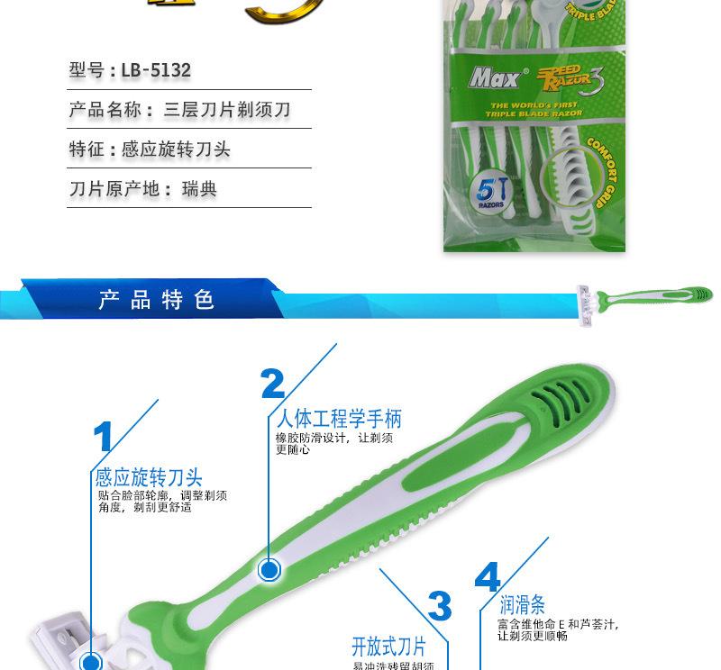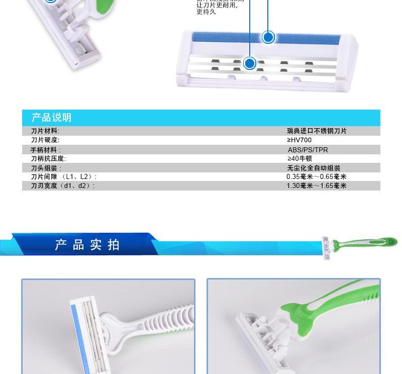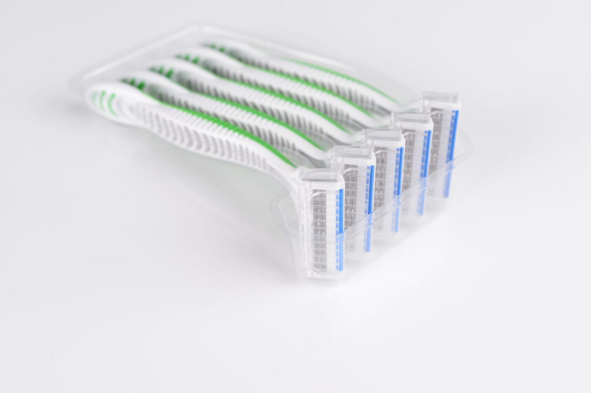 | Material del mango: TPR+PP | Material de la hoja: acero inoxidable sueco | Ingredientes de la tira lubricante: rico en vitamina E y extracto de aloe vera |