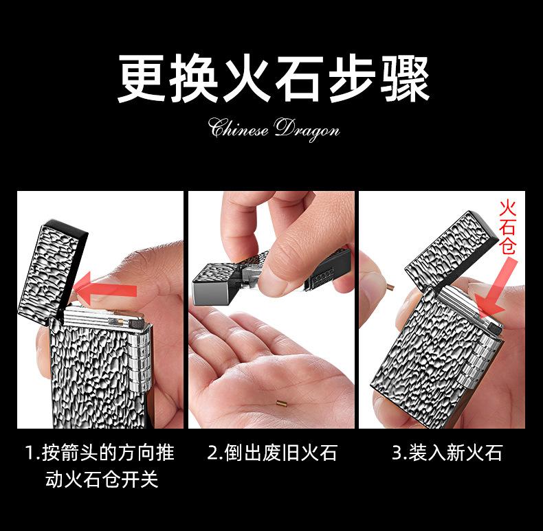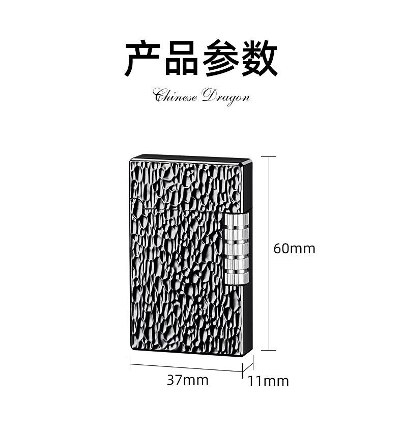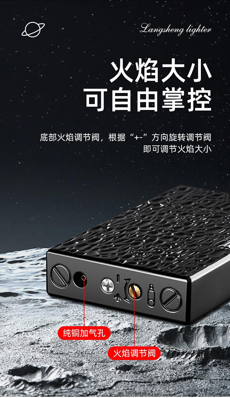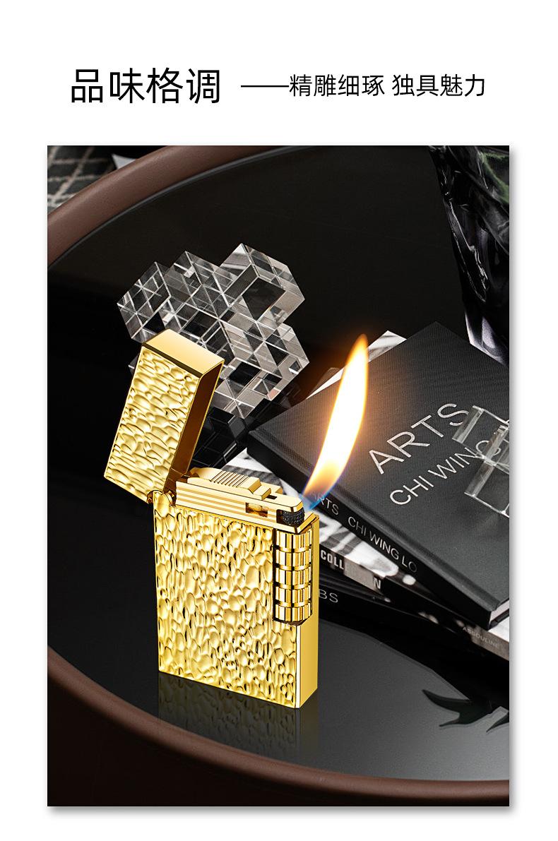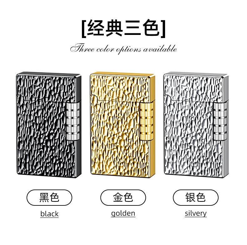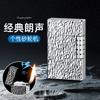 Encendedor de alta calidad con textura de cuerpo de metal tallado y rueda de molienda de fuego lateral de lang sheng de cráter creativo