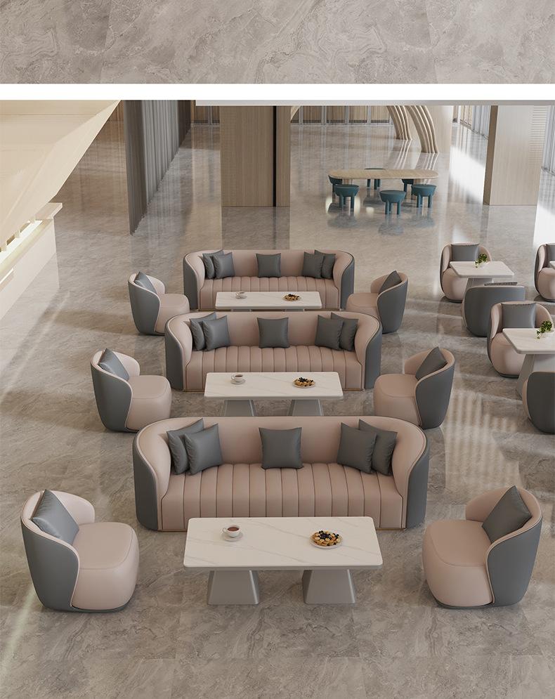 Sala de exposiciones de negocios nórdica, recepción, sofá, mesa de centro, combinación, moderno vestíbulo de hotel, recepción, oficina, mesa de negociación y silla