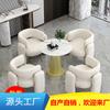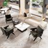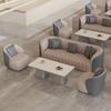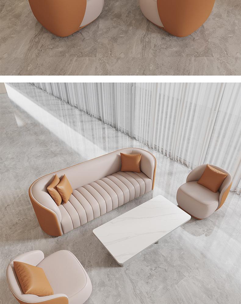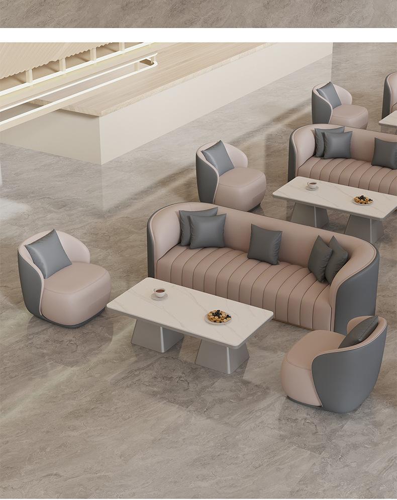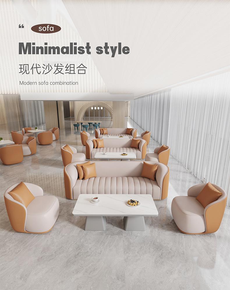 Sala de exposiciones de negocios nórdicos, sofá de recepción, mesa de centro moderna, mesas y sillas de negociación combinadas, vestíbulo de hotel, recepción, oficina