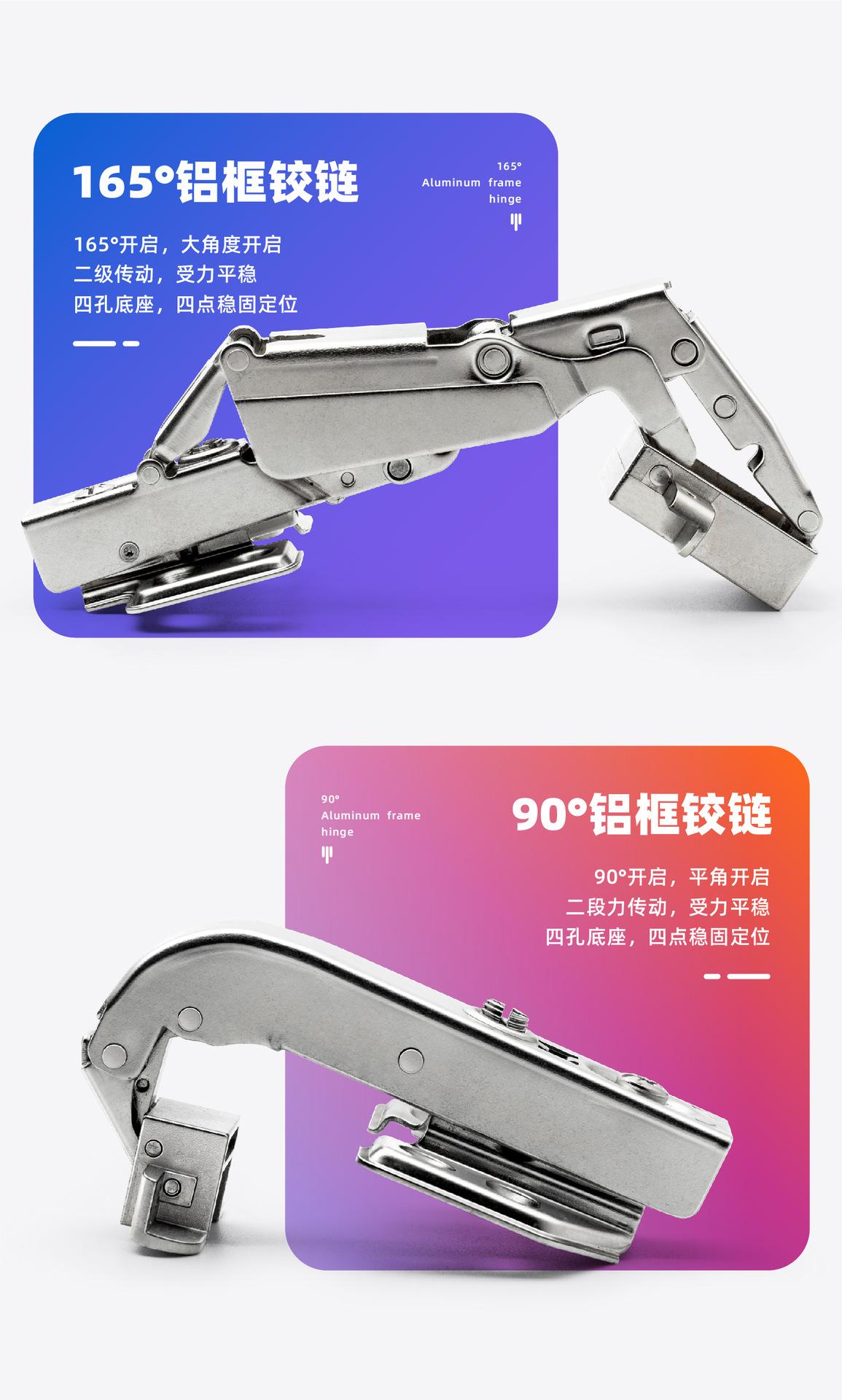 Bisagra de amortiguación para marco de aluminio de 90 grados al por mayor de fábrica, puerta de gabinete, bisagra de gran ángulo de 165 grados, bisagra para puerta de vidrio de marco de aluminio