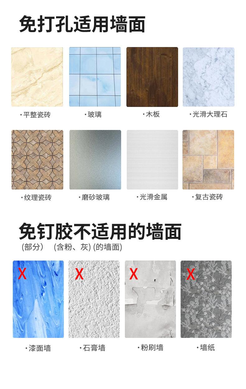 (2) Para una instalación sin perforaciones, tenga en cuenta que la superficie de la pared debe ser plana y sólida, como baldosas de vidrio.No disponible enEn paredes irregulares e inestables como paredes pintadas, papel tapiz, paredes de cal, etc. Después de aplicar el pegamento en la pared, debe esperar de 3 a 5 días para que el pegamento sin clavos se seque completamente antes de usarlo.