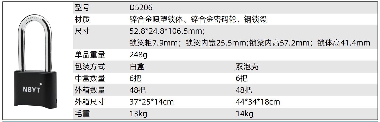 [Fábrica de origen] Candado de aleación de zinc NBYT con contraseña de viga larga, candado grande para puerta de 50 mm, disponible en stock D5206
