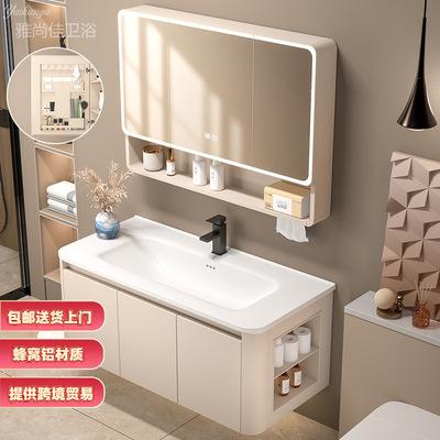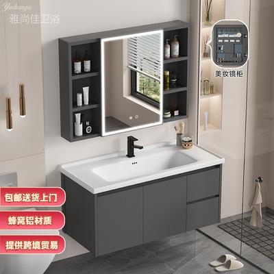 Vanidad de baño de aluminio espacial con panal de arco y gabinete lateral, combinación de lavabo, lavabo de baño, tocador de cerámica integrada