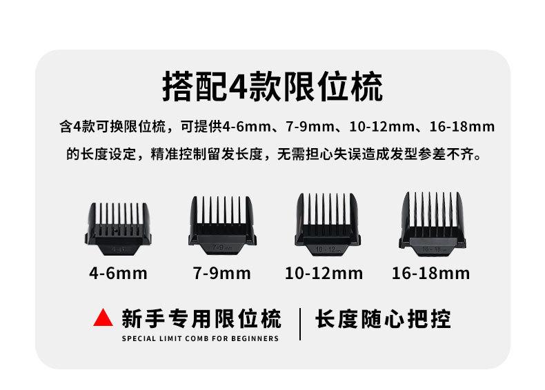 1. El juego completo incluye: la máquina completa, cable de datos USB (cabeza B), cepillo, 4 peines guía negros (4-6MM, 7-9MM, 10-12MM, 16-18MM), una base, embalaje neutro, manual de instrucciones
