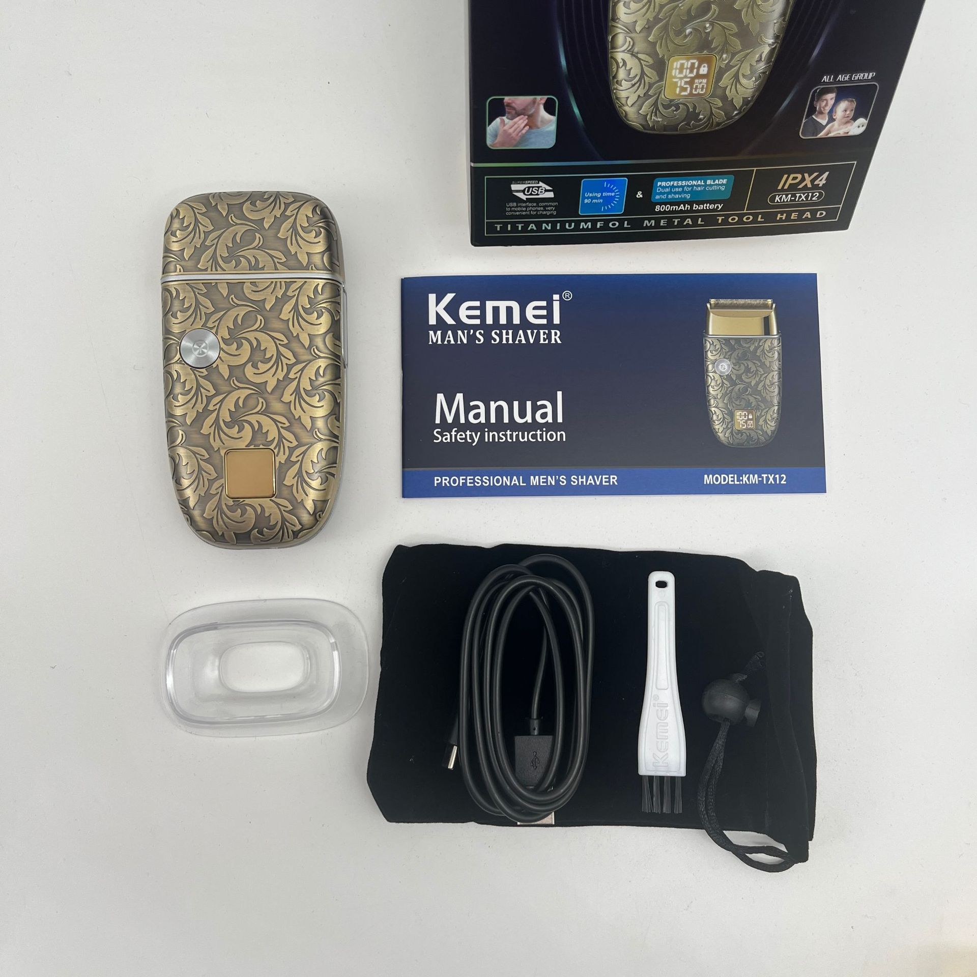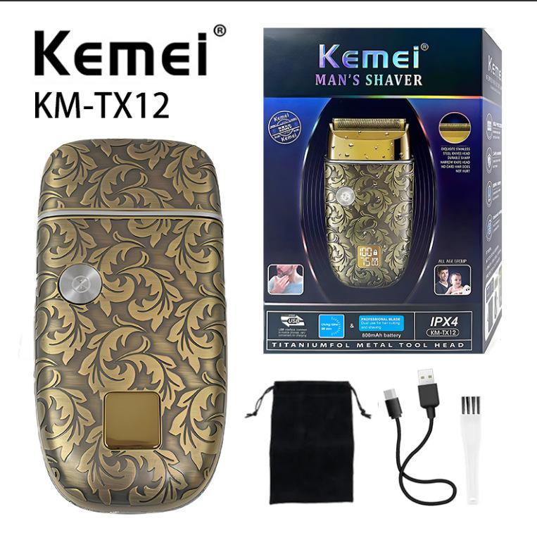 Afeitadora eléctrica KEMEI KM-TX12 con cuerpo de metal tallado y cabezal de afeitado alternativo.