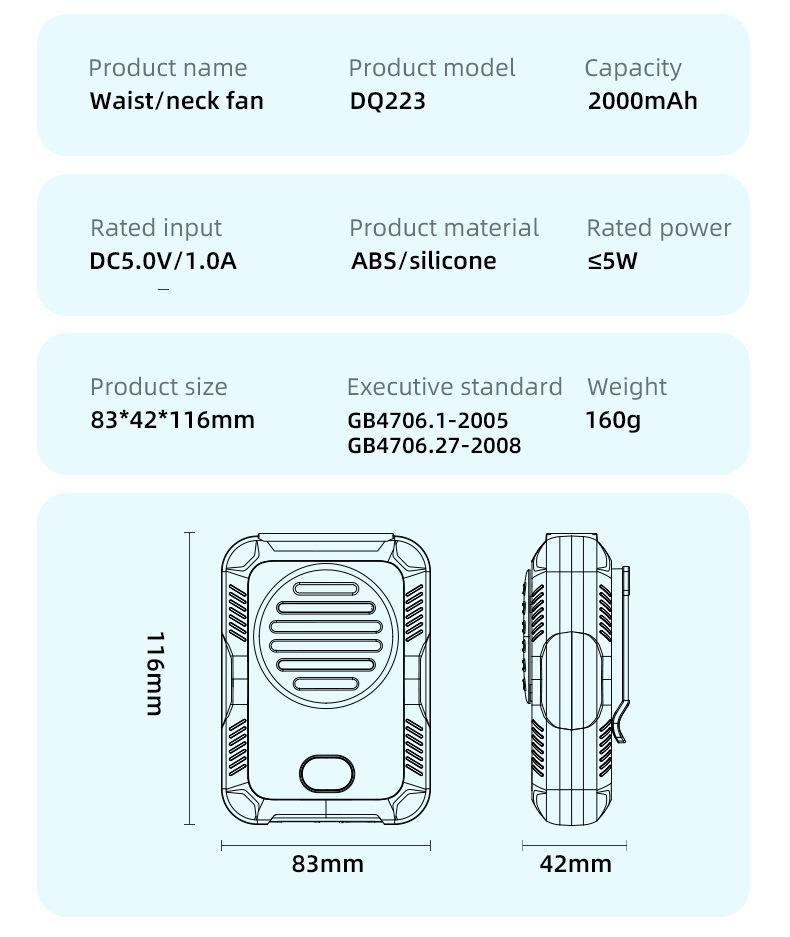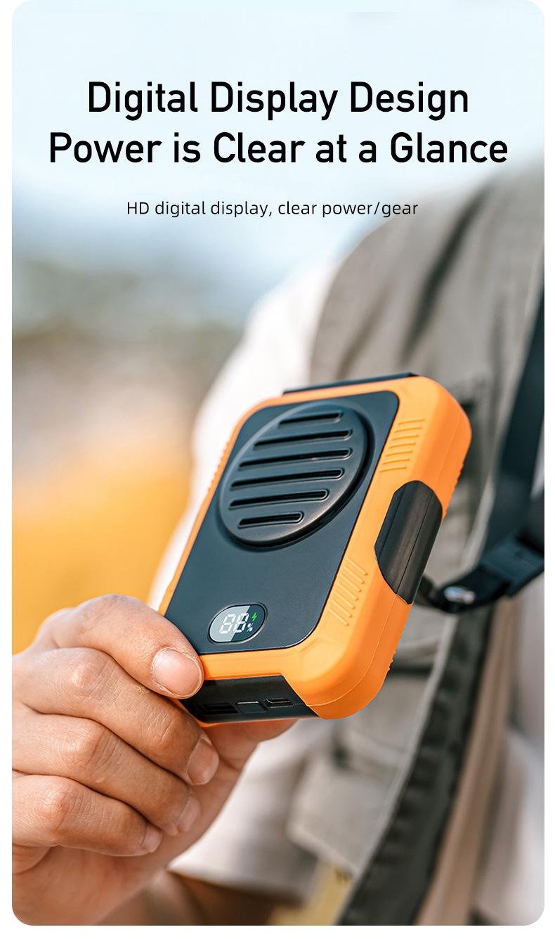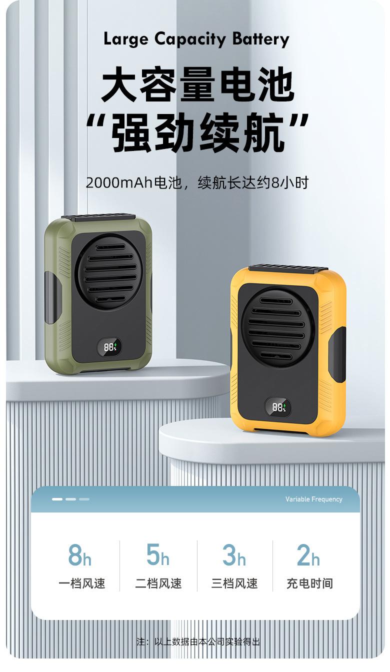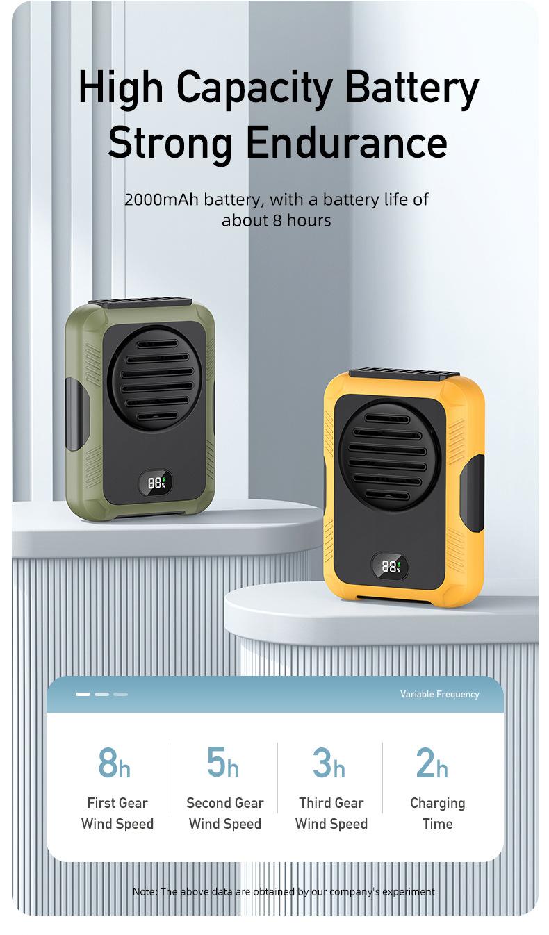 Duración de la batería: velocidad del viento de 1er nivel aproximadamente 8 horas, velocidad del viento de 2do nivel aproximadamente 5 horas, ventilador de 3er nivel aproximadamente 3 horas