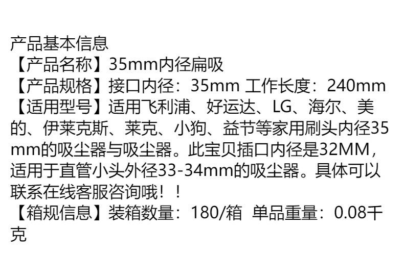 Adecuado para accesorios de aspiradora doméstica de belleza para cachorros, cabezal de succión plano, boquilla plana, cabezal plano, conector universal, diámetro interior de 35 mm