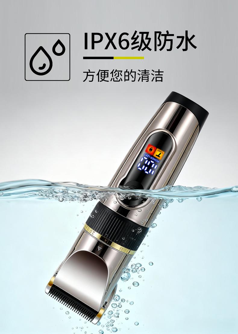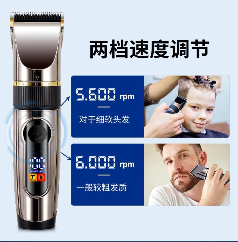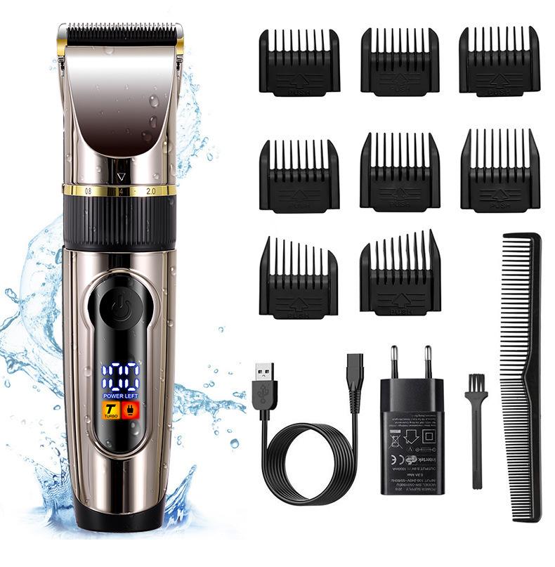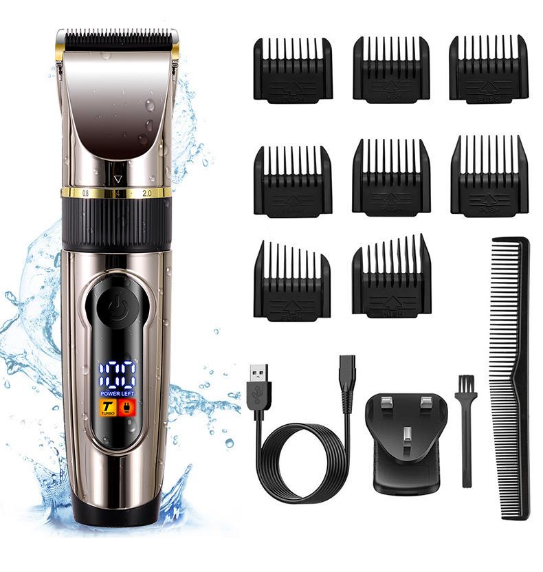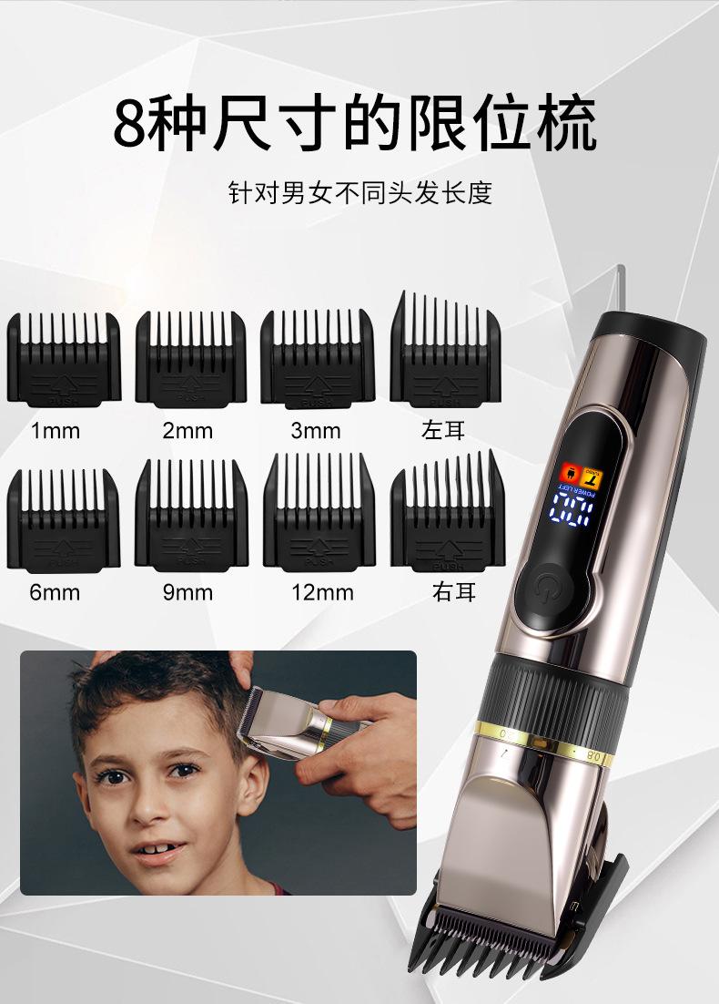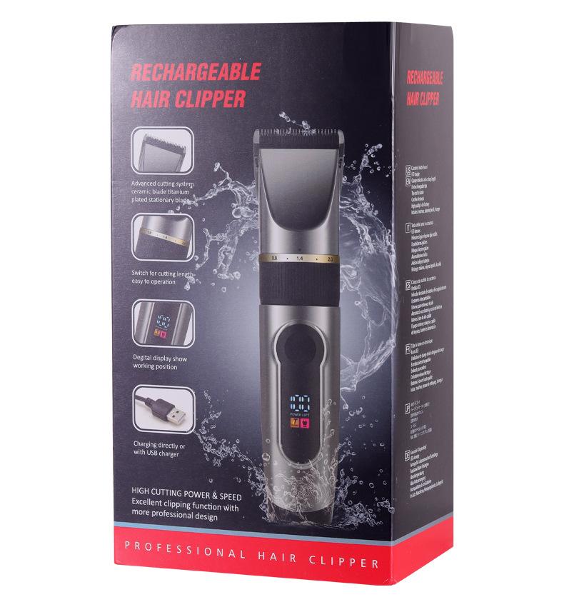 Puntos de venta del producto: Pantalla digital LED LCD, Lavado con agua IPX6, Batería de litio, Cortapelos de alta potencia, Función de aceleración de 2 velocidades, Carga y enchufe, Cabezal de corte de ajuste fino rotatorio de tres velocidades (0.8/1.4/2MM), Bajo ruido, Tipo RCuchillaDiseño de protección de esquinas redondeadas. Longitud del cable 1M
