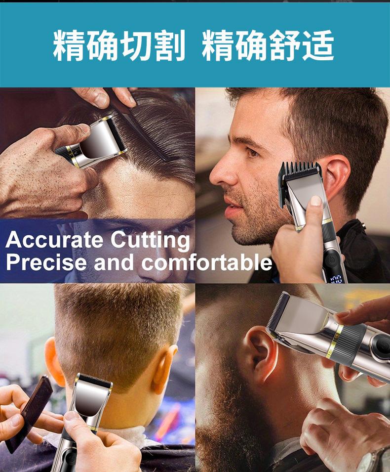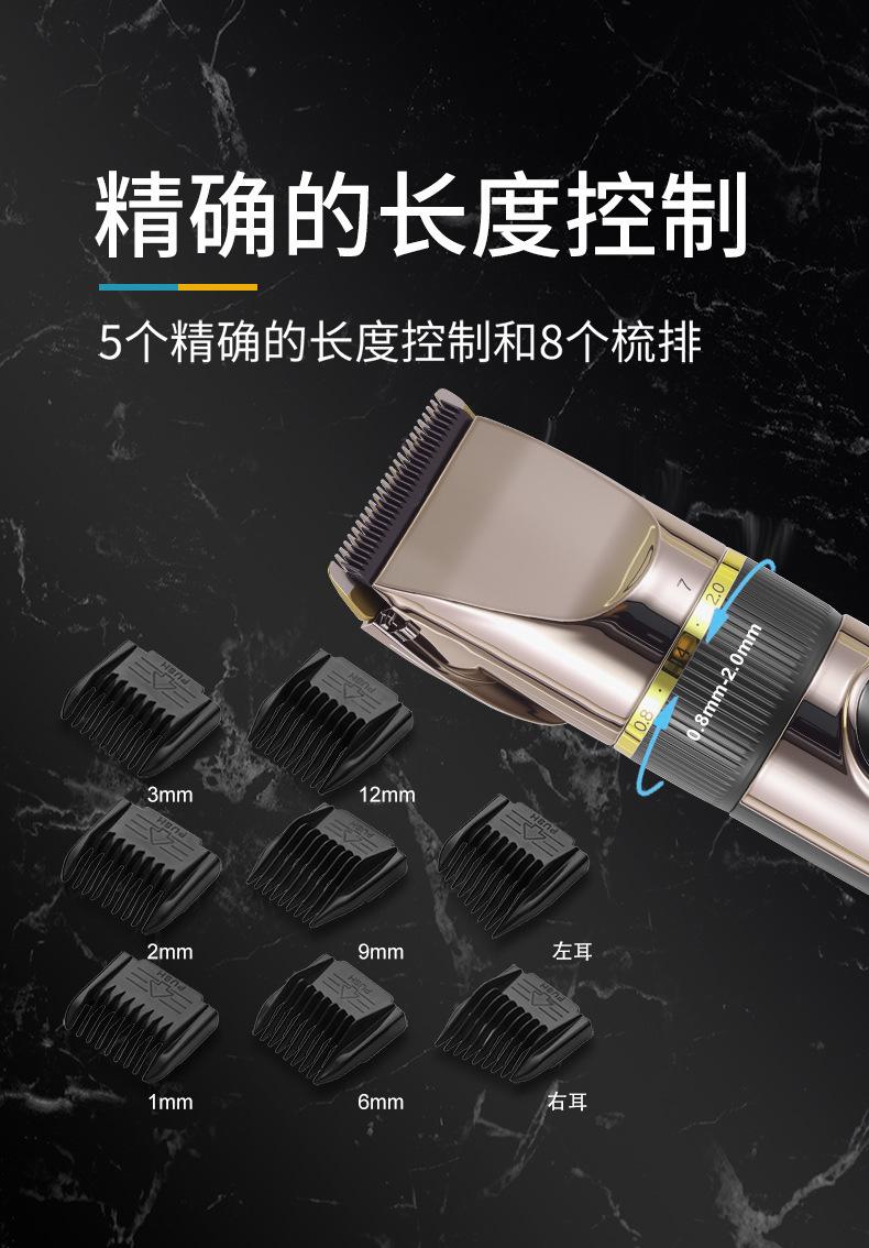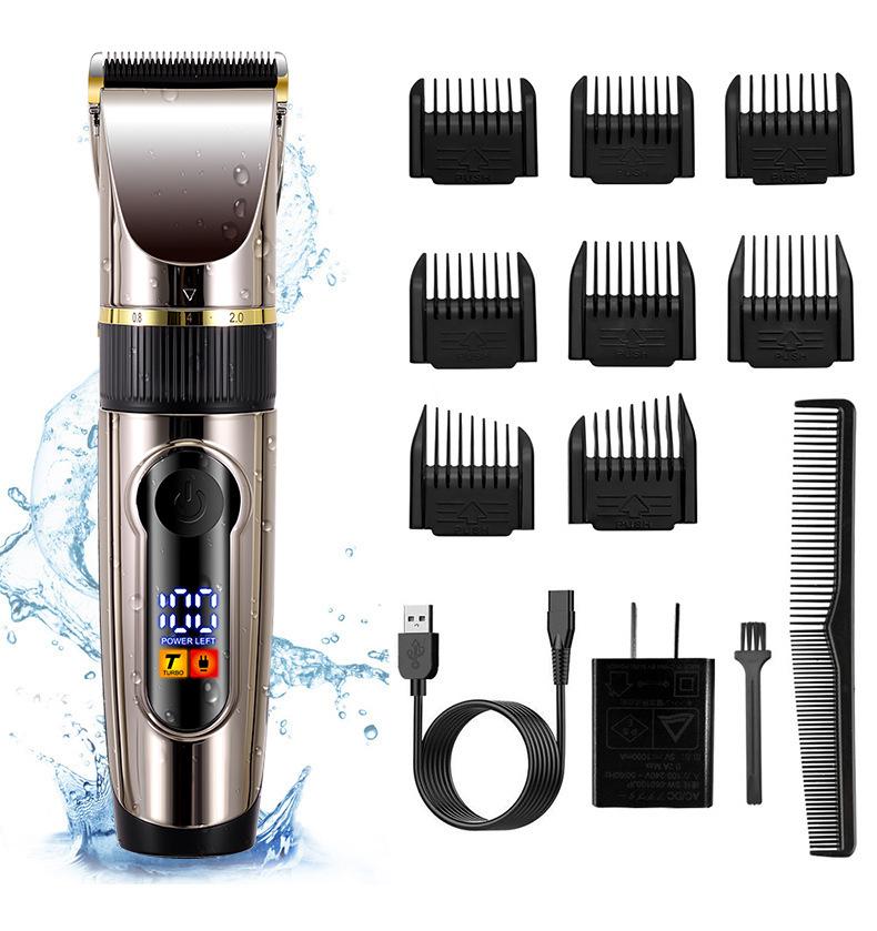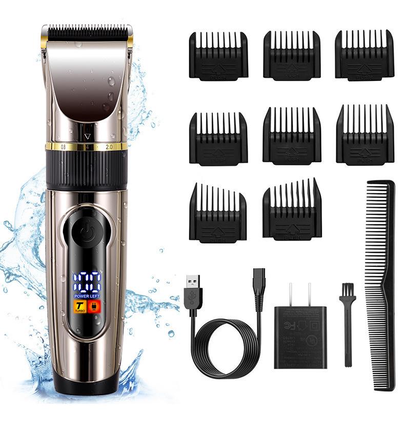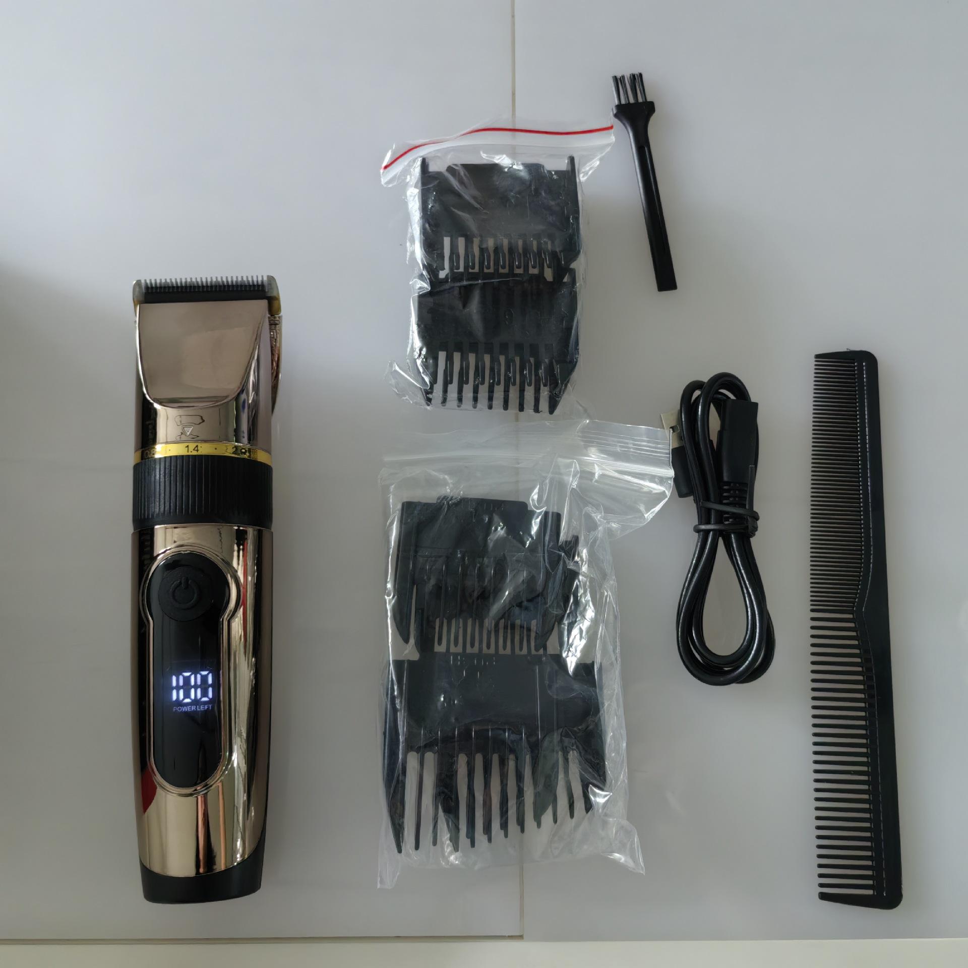 Puntos de venta del producto: Pantalla digital LED LCD, Lavado con agua IPX6, Batería de litio, Cortapelos de alta potencia, Función de aceleración de 2 velocidades, Carga y enchufe, Cabezal de corte de ajuste fino rotatorio de tres velocidades (0.8/1.4/2MM), Bajo ruido, Tipo RCuchillaDiseño de protección de esquinas redondeadas. Longitud del cable 1M