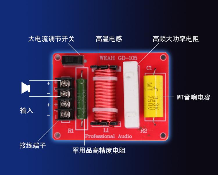 Altavoz coaxial profesional para audio de automóvil con crossover de realce de graves: utiliza resistencias profesionales de alta precisión verdes, resistencias de alta frecuencia y alta potencia, capacitores de audio MT, inductores de alta temperatura y terminales sin soldadura.Muy conveniente; con un gran interruptor de ajuste de corriente. Los expertos pueden notar a simple vista que el diseño del circuito es un típico diseño de alta a baja frecuencia para altavoces coaxiales de automóvil, que es muy adecuado para la modificación de audio de automóvil para mejorar la calidad del sonido. Es una fiebre raraDivisión de frecuencia pequeña, el DIY vale la pena intentarlo. El precio es uno.