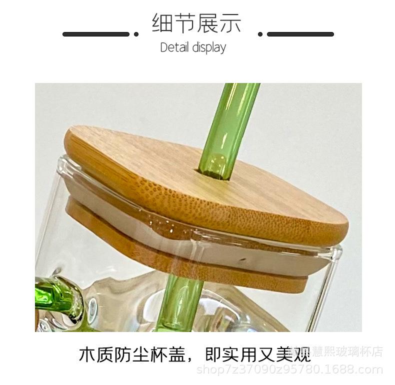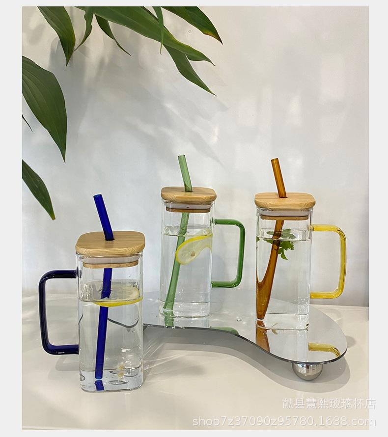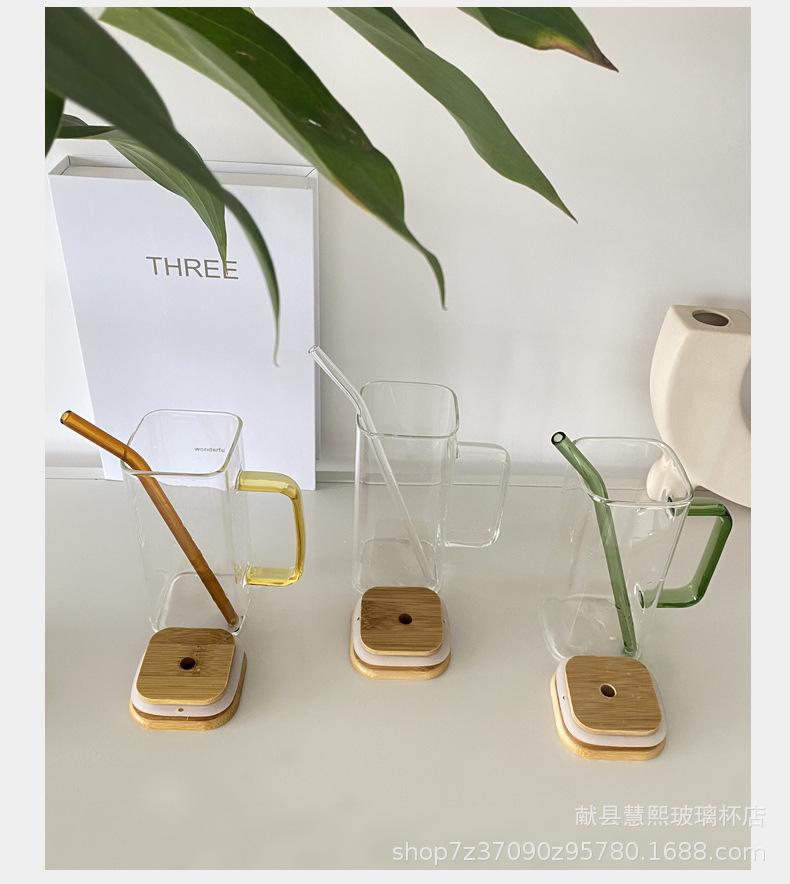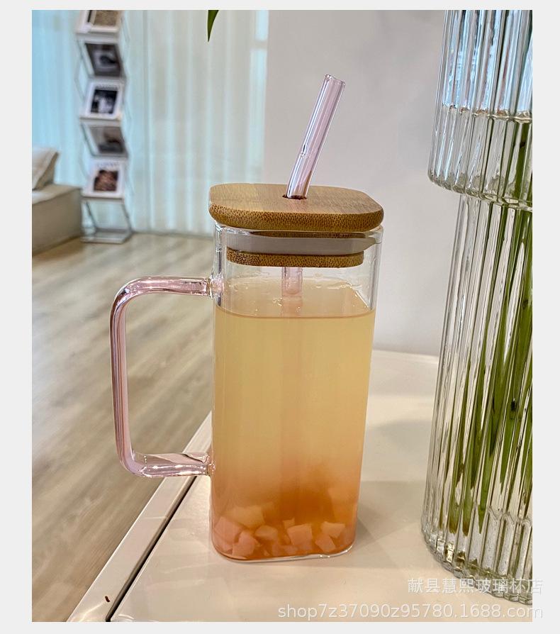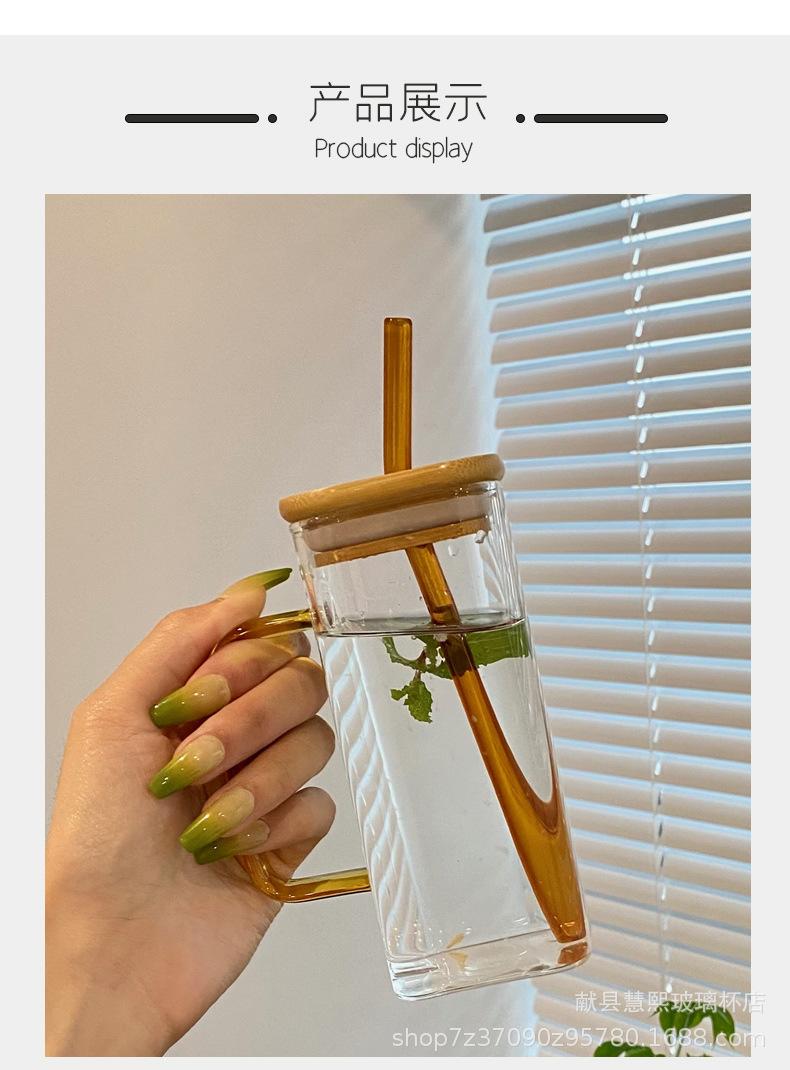 Taza de vidrio de borosilicato de una sola capa de color cuadrado con tapa de madera, tubo de succión de vidrio, taza simple de gran capacidad para jugo y leche.