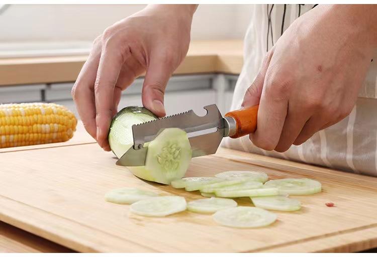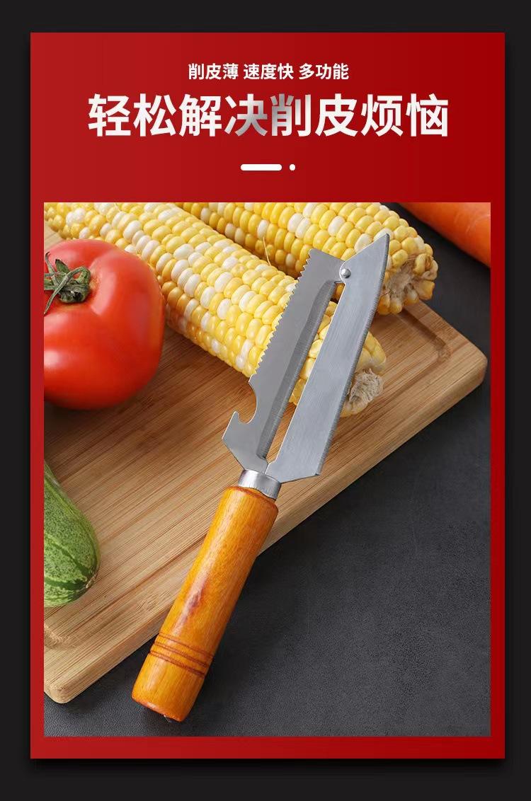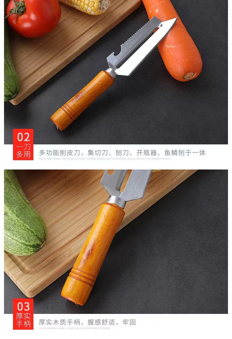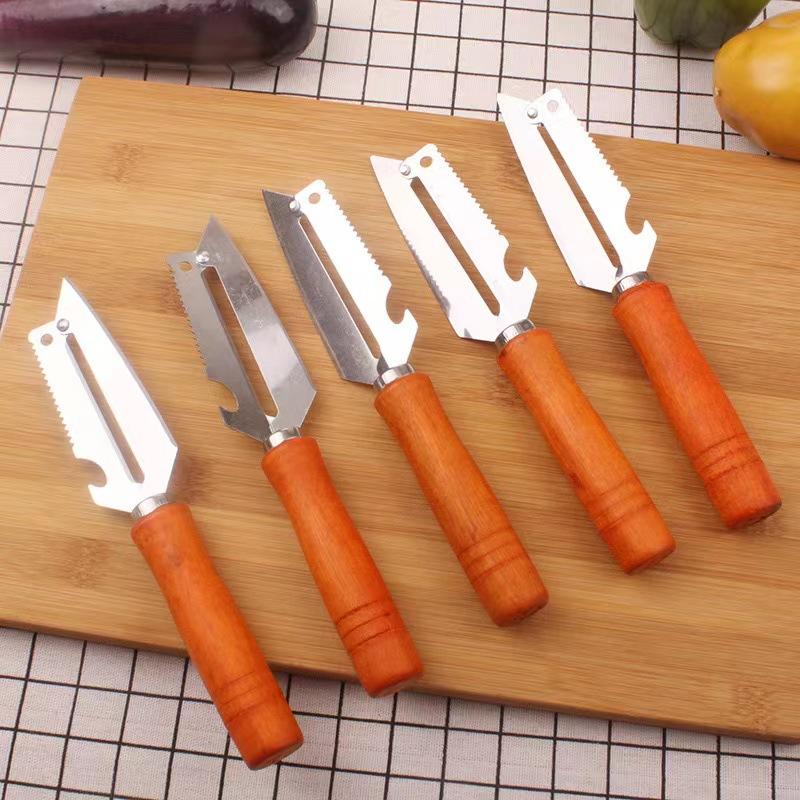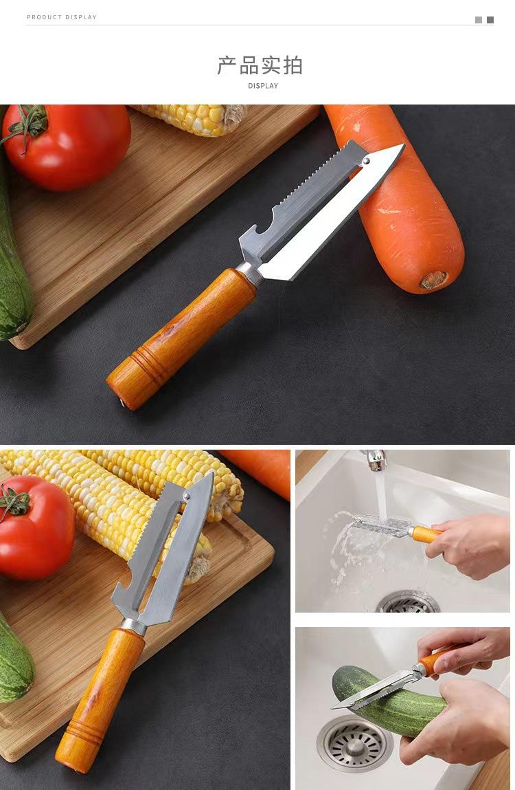 Pelador de manzanas multifuncional de cocina con mango de madera de acero inoxidable de cuatro usos, pelador de frutas, pelador doméstico.