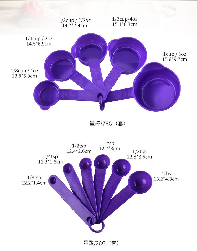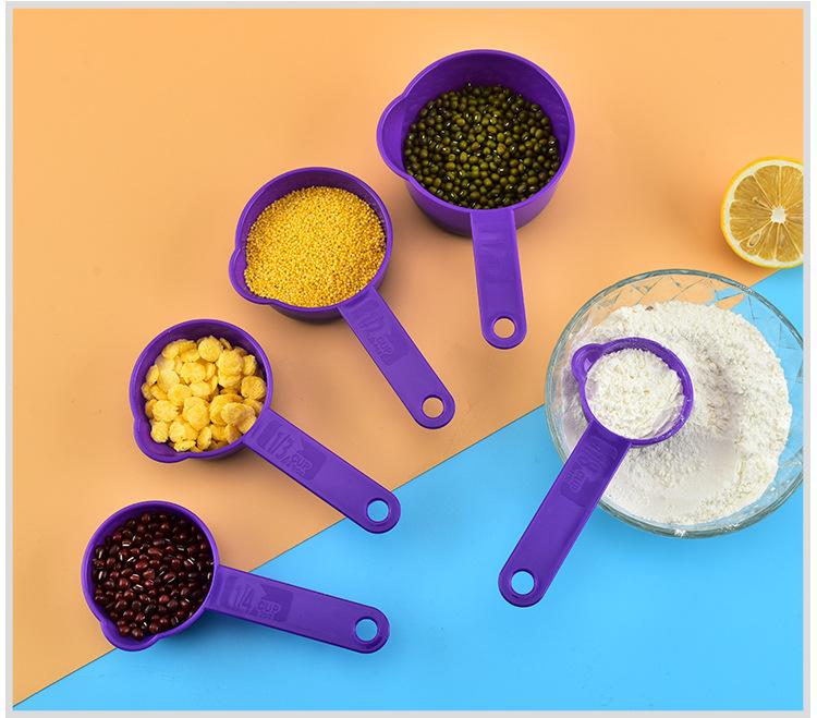 Purple measuring cup, Red measuring cup, Pink measuring cup, Blue measuring cup, Purple measuring spoon, Red m...