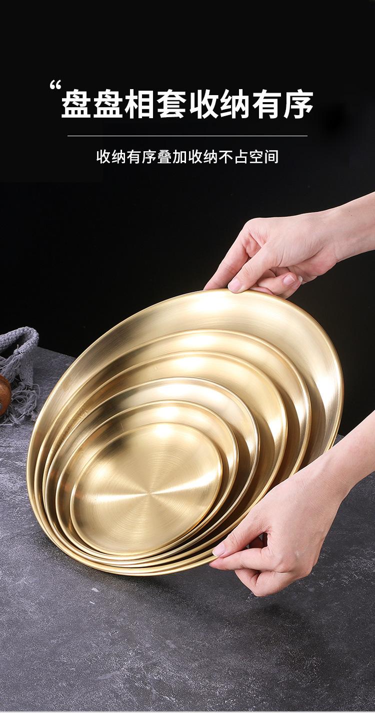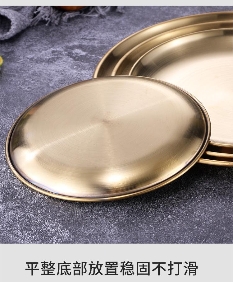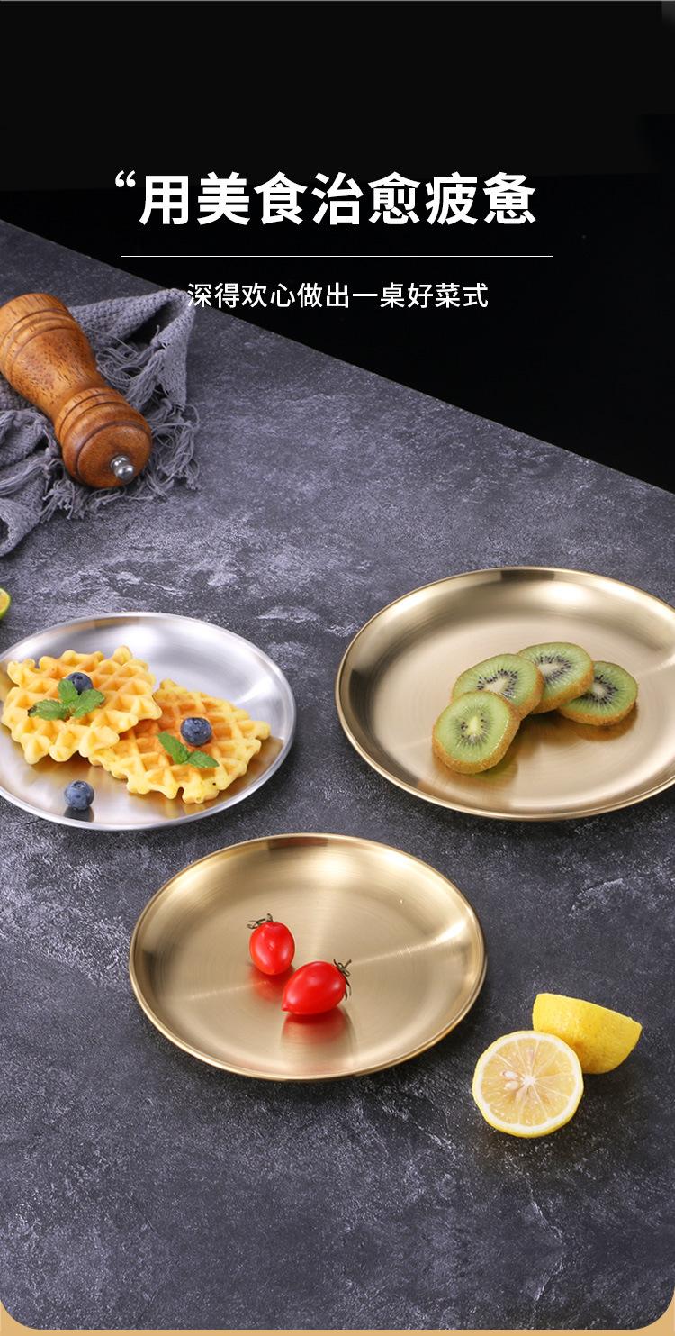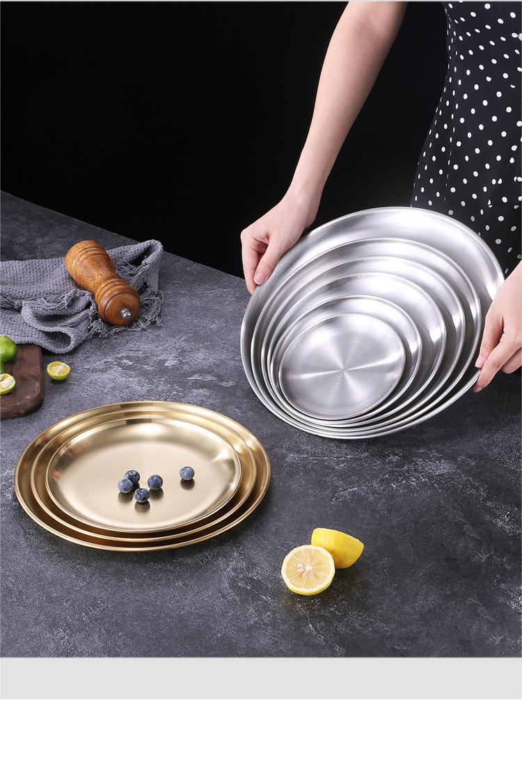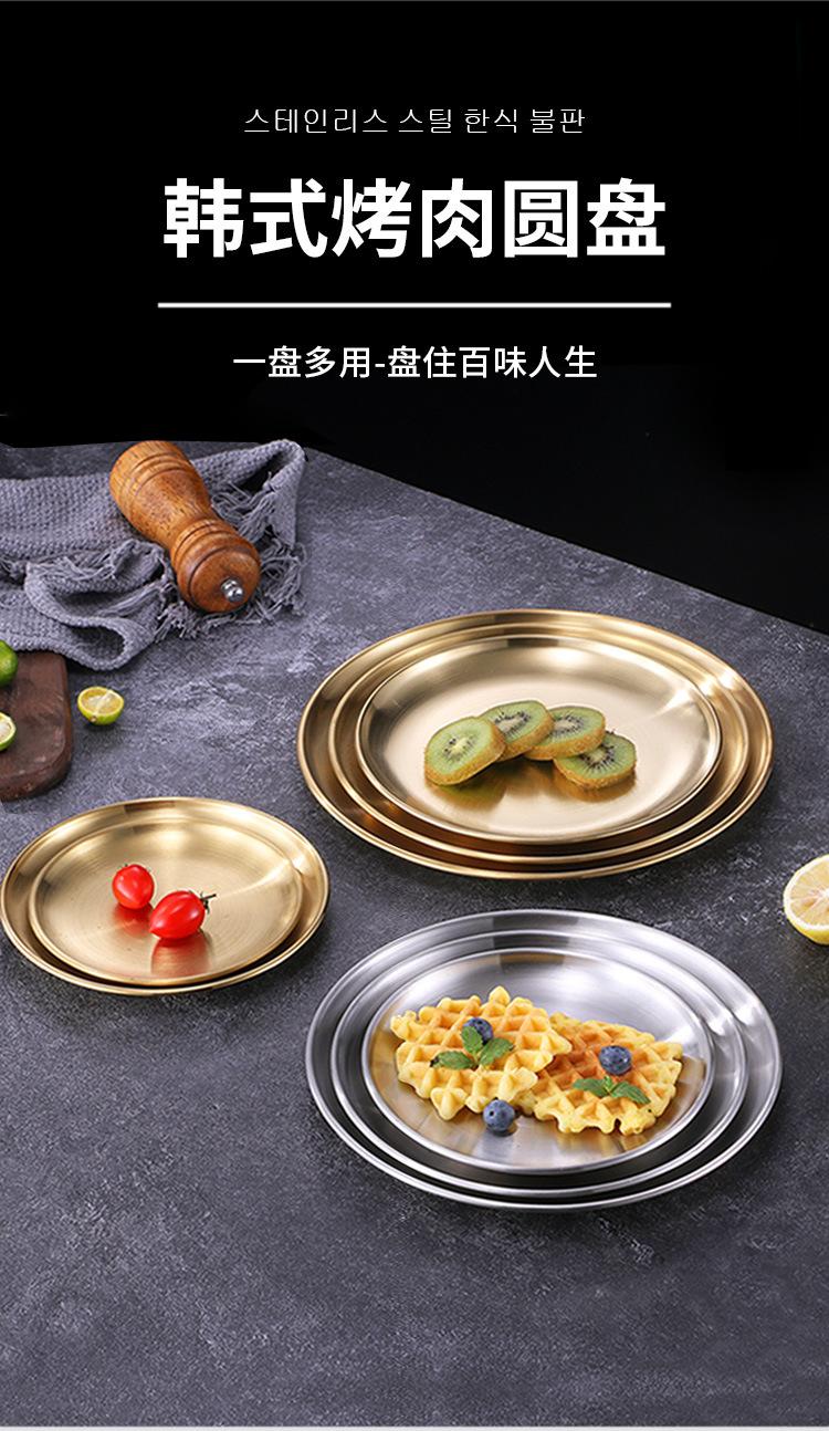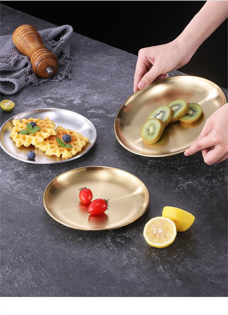 Plato redondo de acero inoxidable 304 para barbacoa, dorado, para uso doméstico, estilo coreano, para dim sum, pastel, fruta, estilo occidental, multiusos.