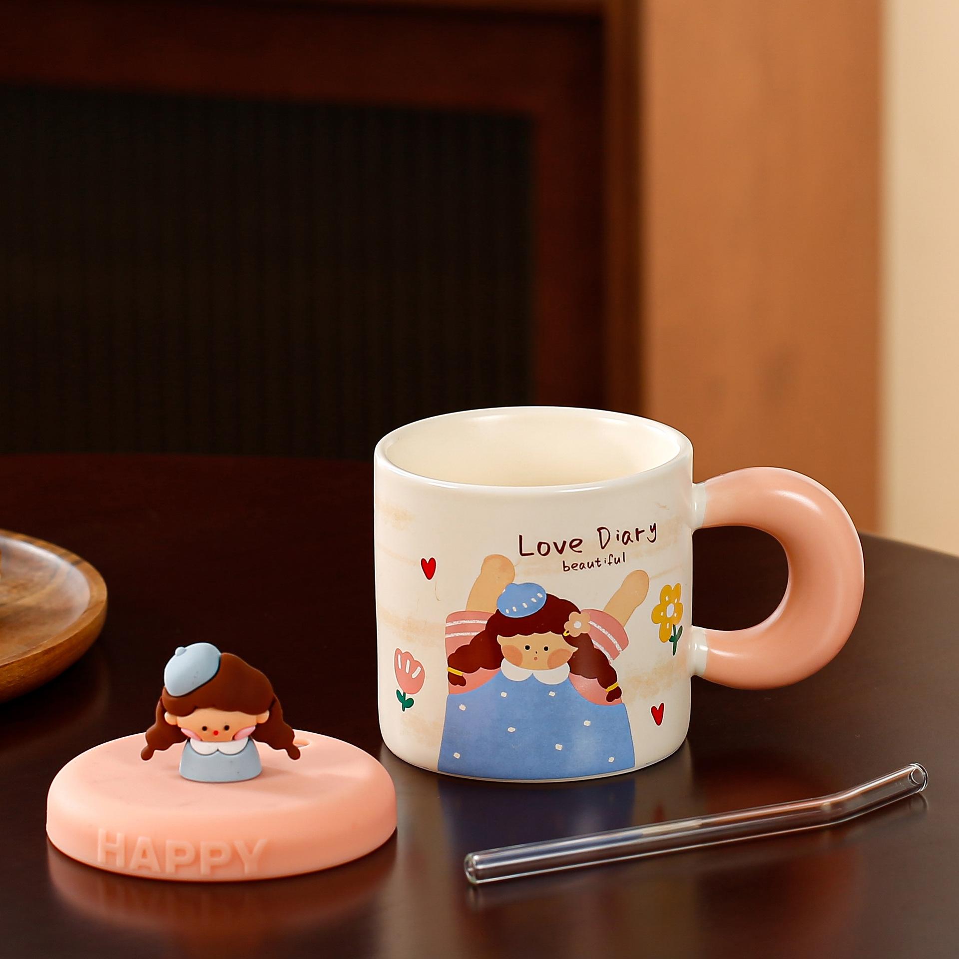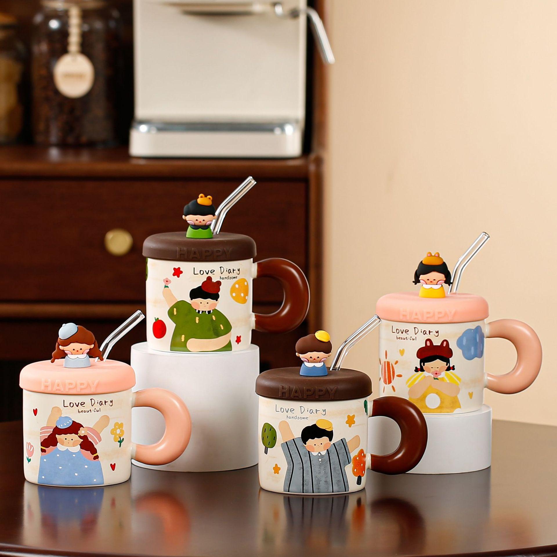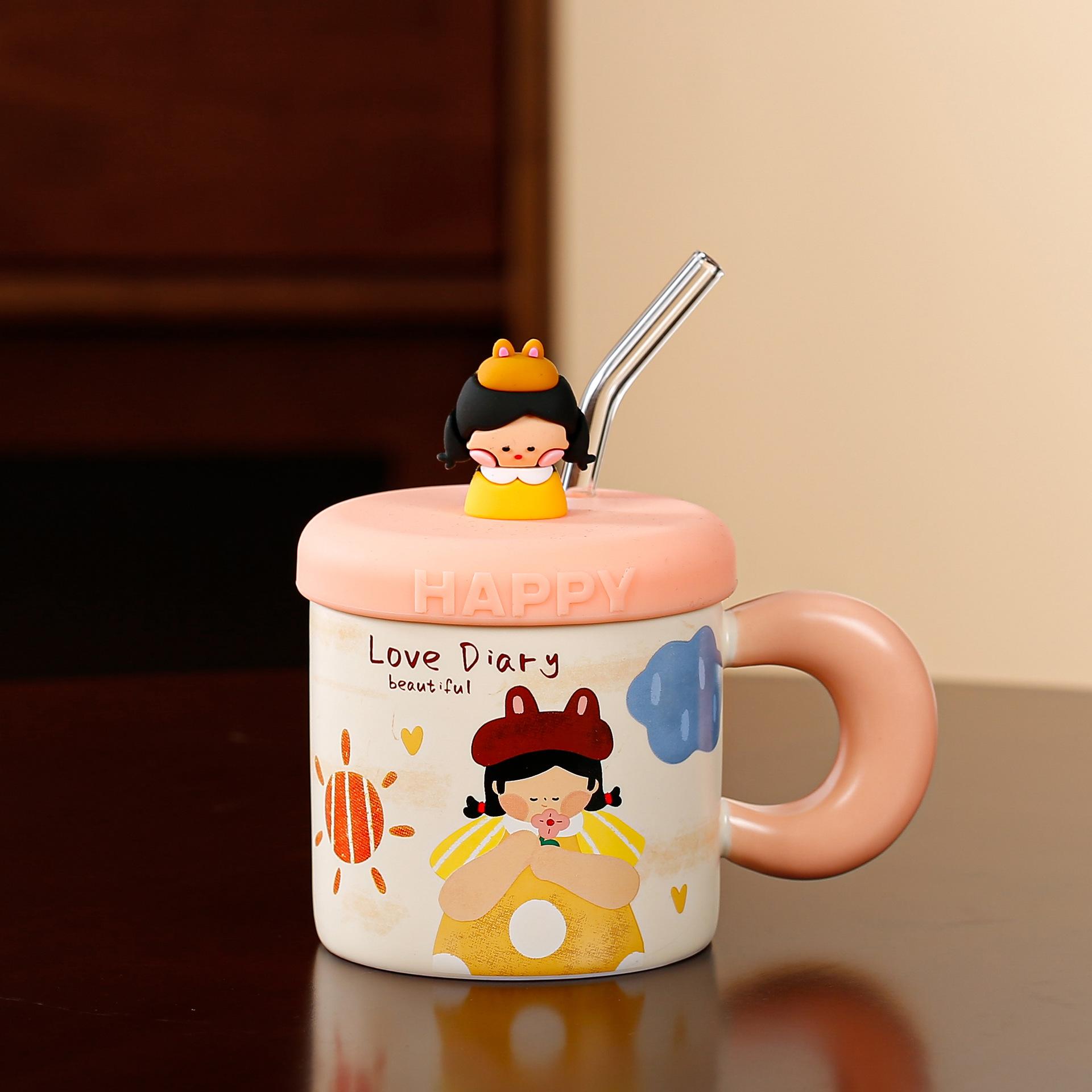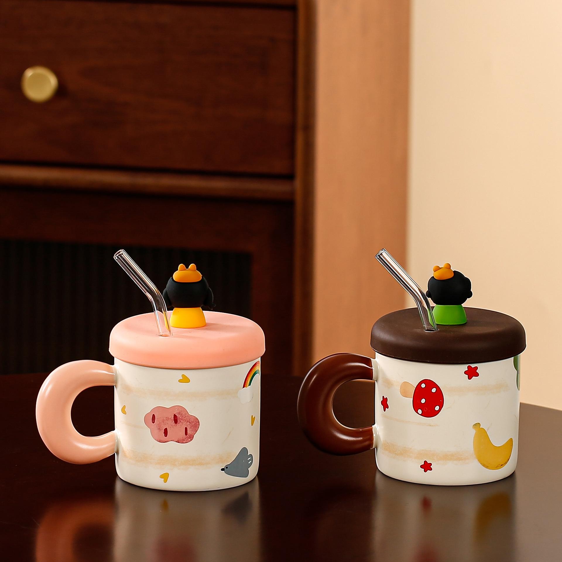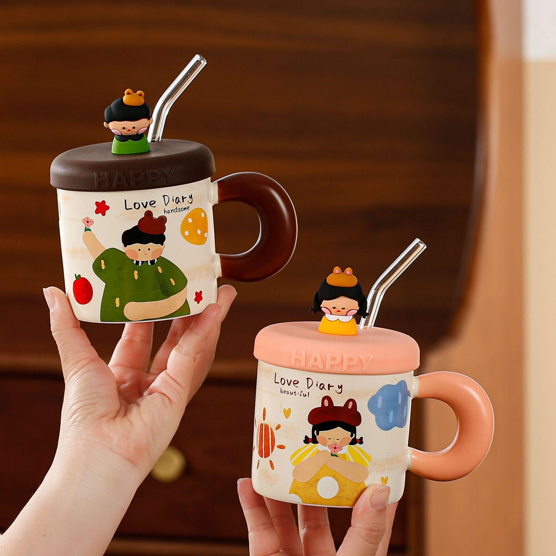 Taza de cerámica con tapa y tubo de succión de dibujos animados para regalo pequeño, ideal para parejas de niñas, taza de agua de alto valor de color, juego para el hogar