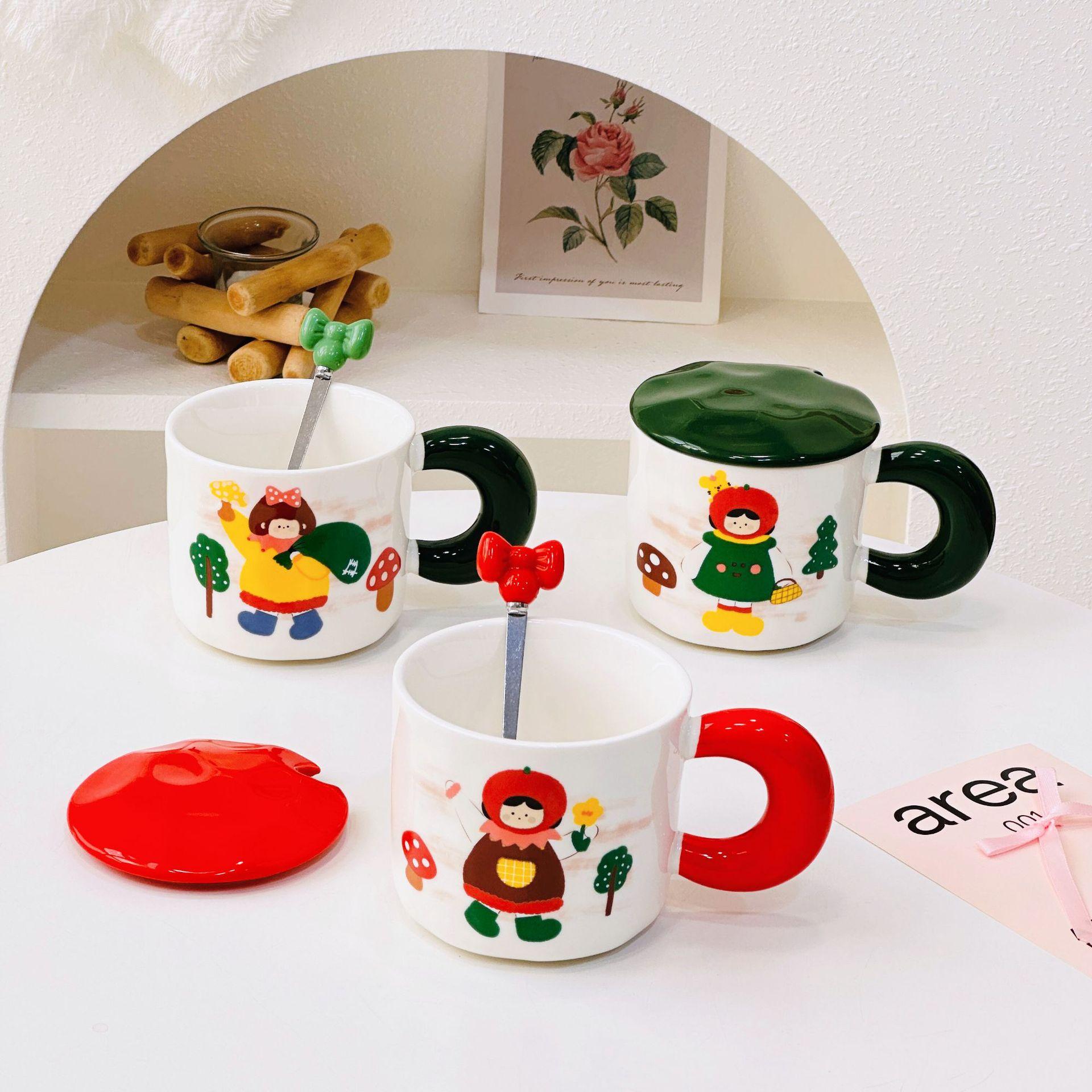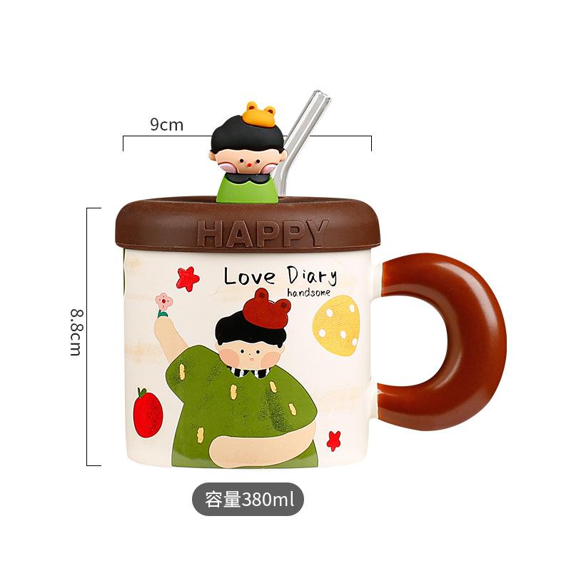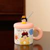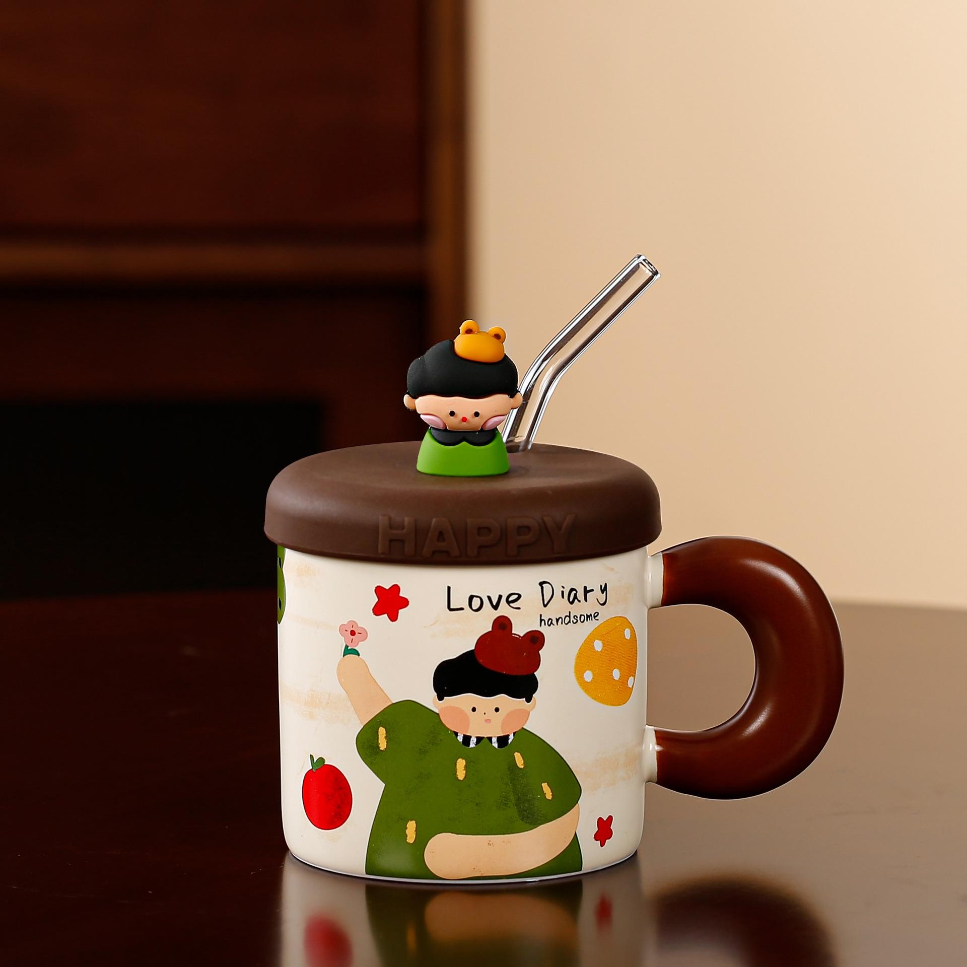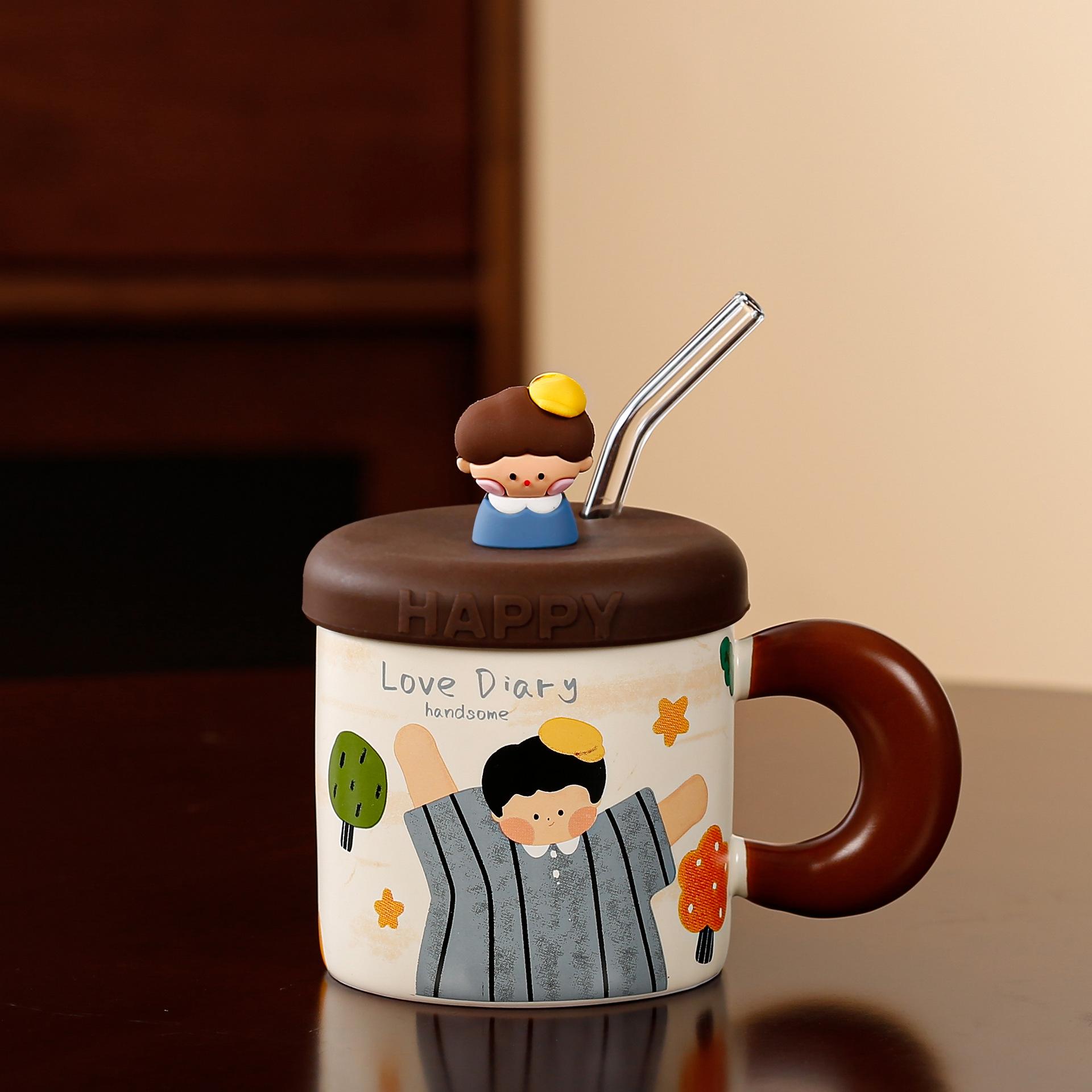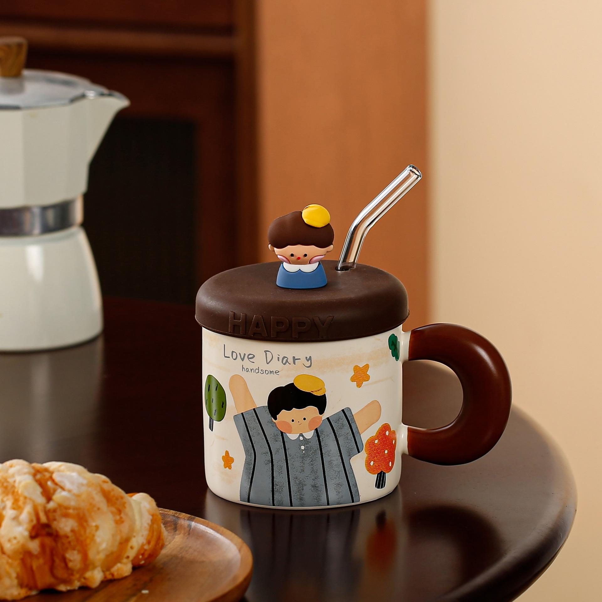 Taza de cerámica con tapa y tubo de succión de dibujos animados para regalo pequeño, ideal para parejas de niñas, taza de agua de alto valor de color, juego para el hogar