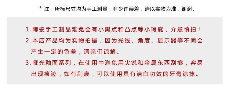 Defectos: La diferencia de color puede ser causada por lotes de producción. Es normal que los trabajadores de cerámica tengan defectos manuales ocasionales como pequeñas manchas negras o burbujas durante el proceso de producción. No afectará el uso. Por favor, tenga cuidado si le importa.