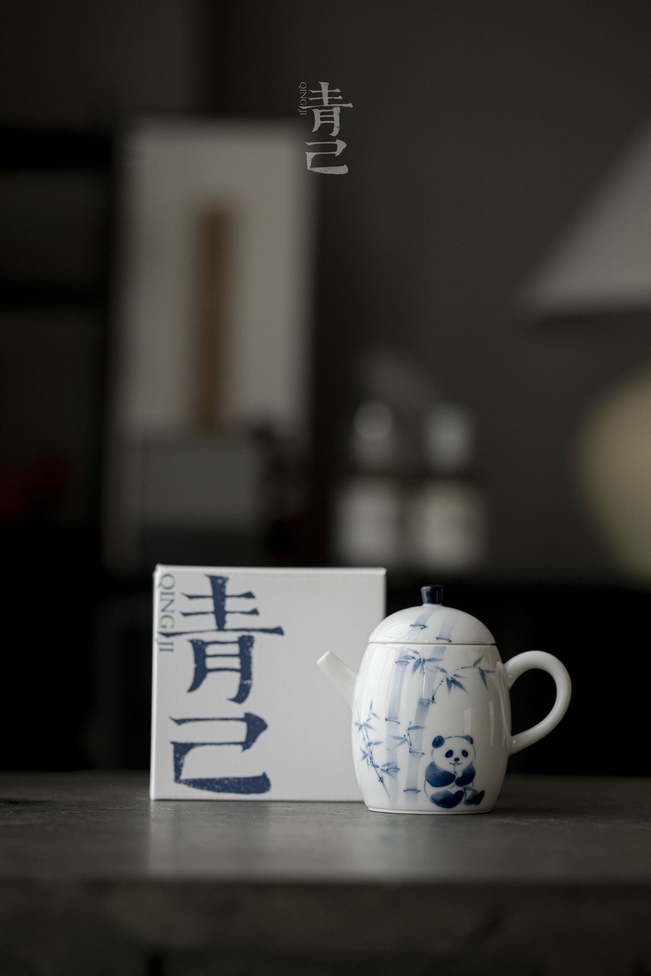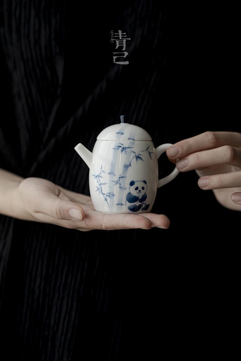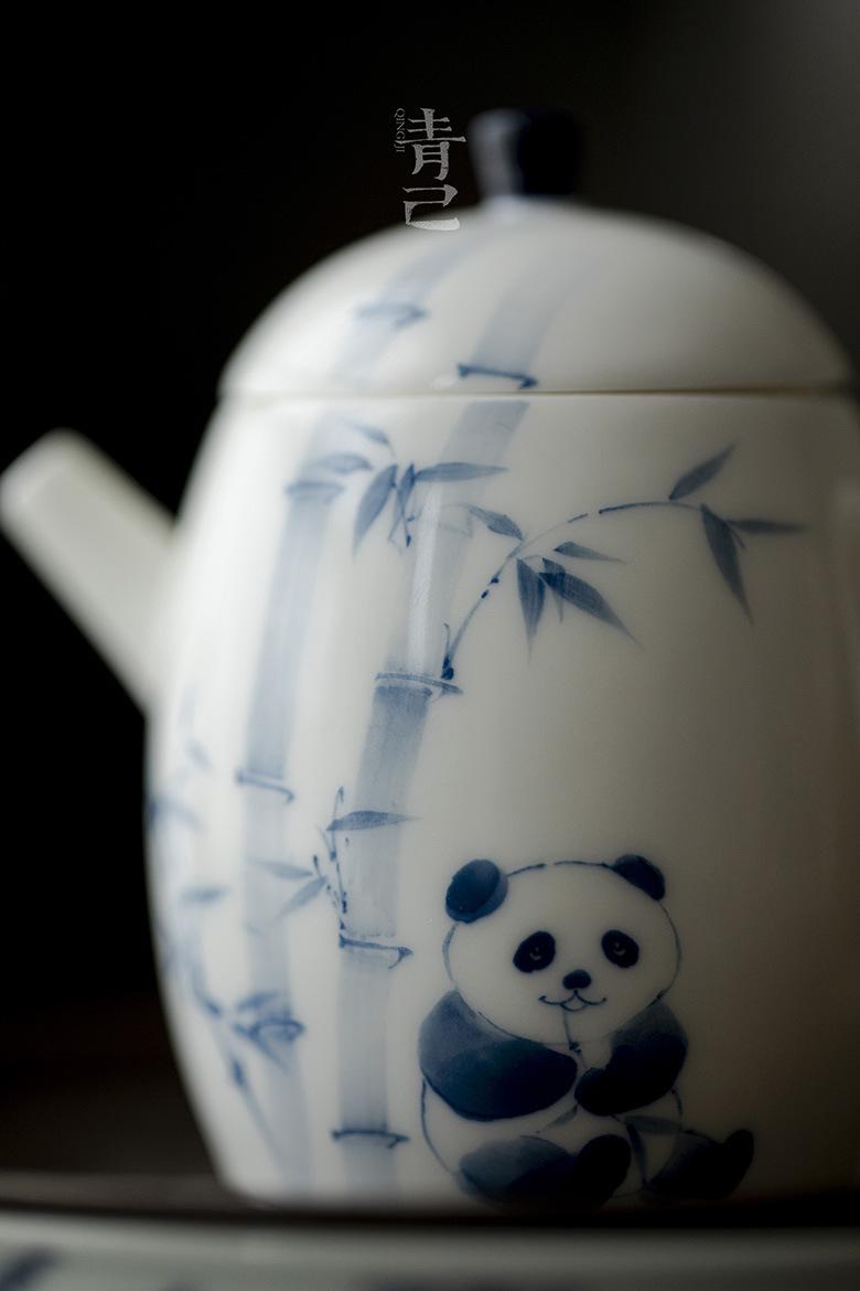 Tetera de panda pintada a mano Qingji, juego de té kung fu de cerámica para el hogar, tetera individual azul y blanca con filtro de orificio de bola