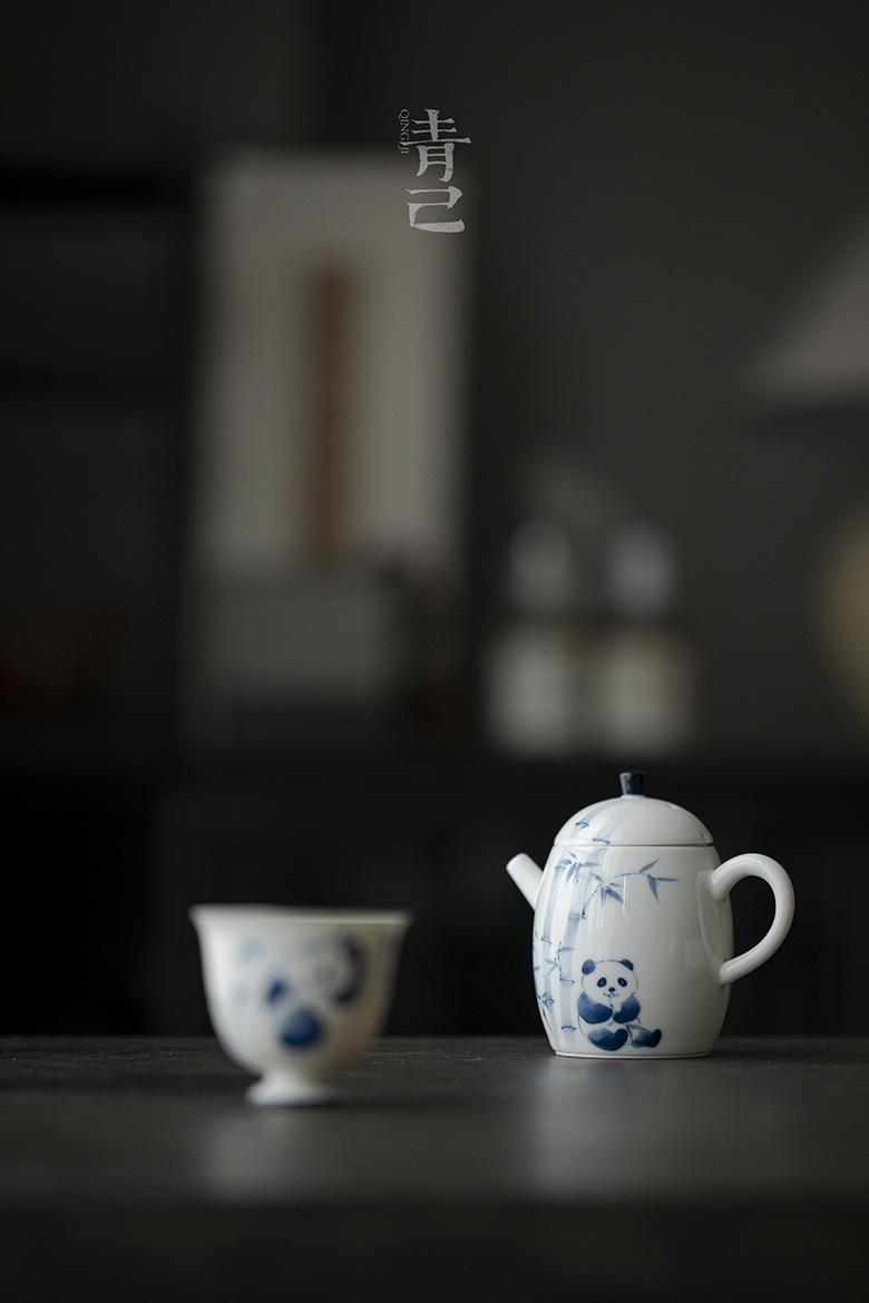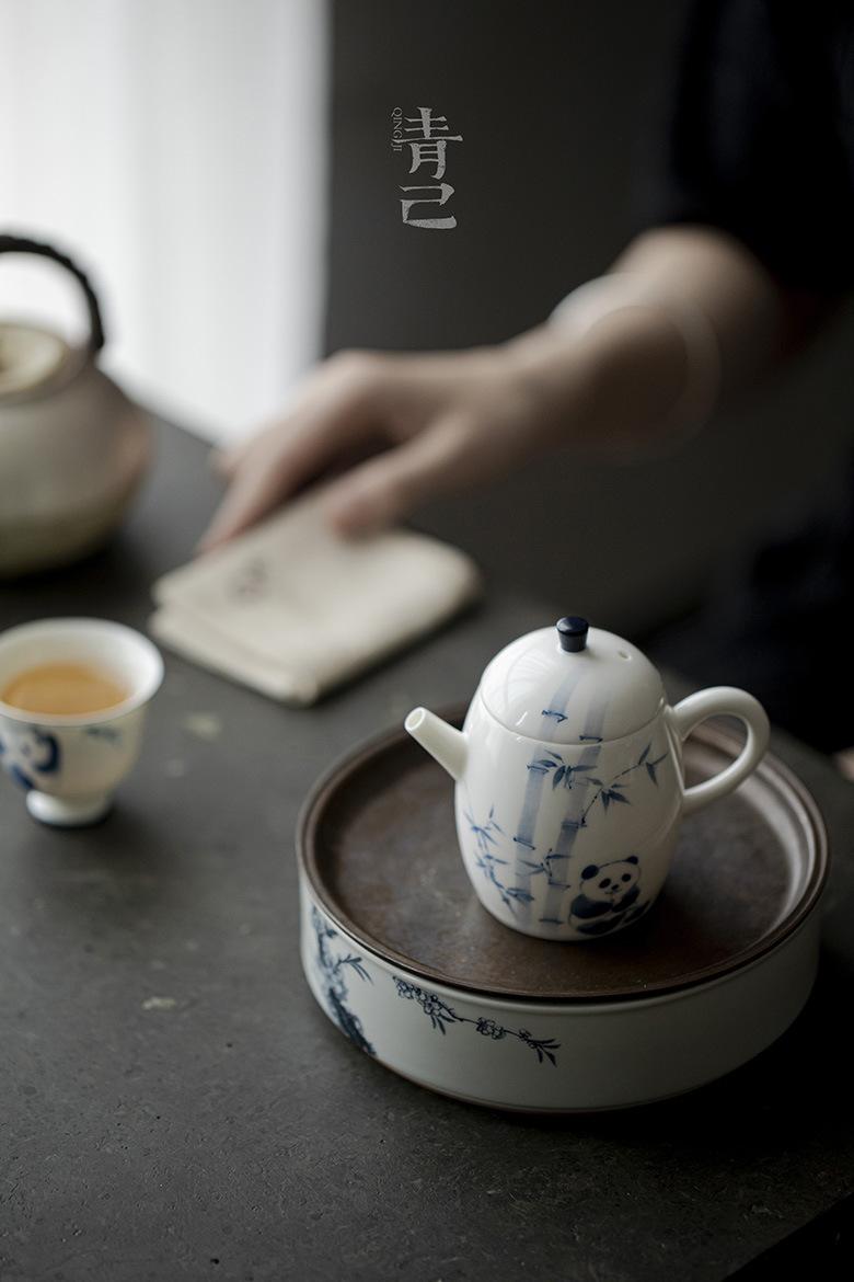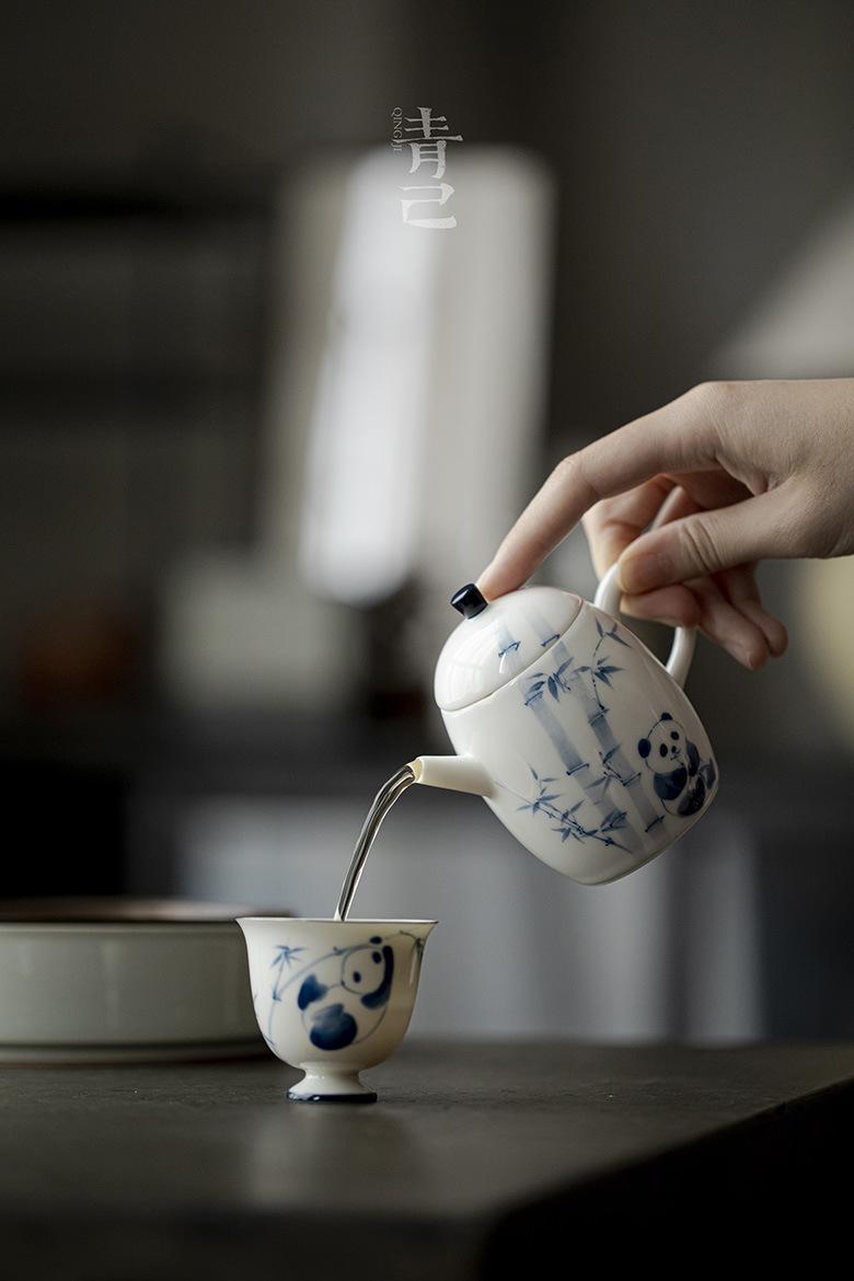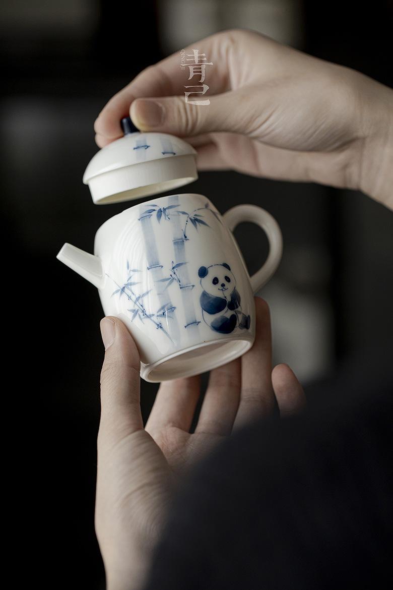 Tetera de panda pintada a mano Qingji, juego de té kung fu de cerámica para el hogar, tetera individual azul y blanca con filtro de orificio de bola