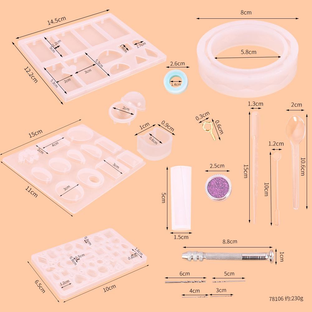 12 moldes de pegamento, una bolsa negra de 270*200 de alto, 22 clavos dorados y plateados, 1 pinza, 5 cucharas, 5 pajitas, 5 palitos para remover, 1 caja de polvo dorado púrpura, 1 broca, brocas de 1 mm, 1.5 mm, 2 mm, 3 mmAlrededor de 73