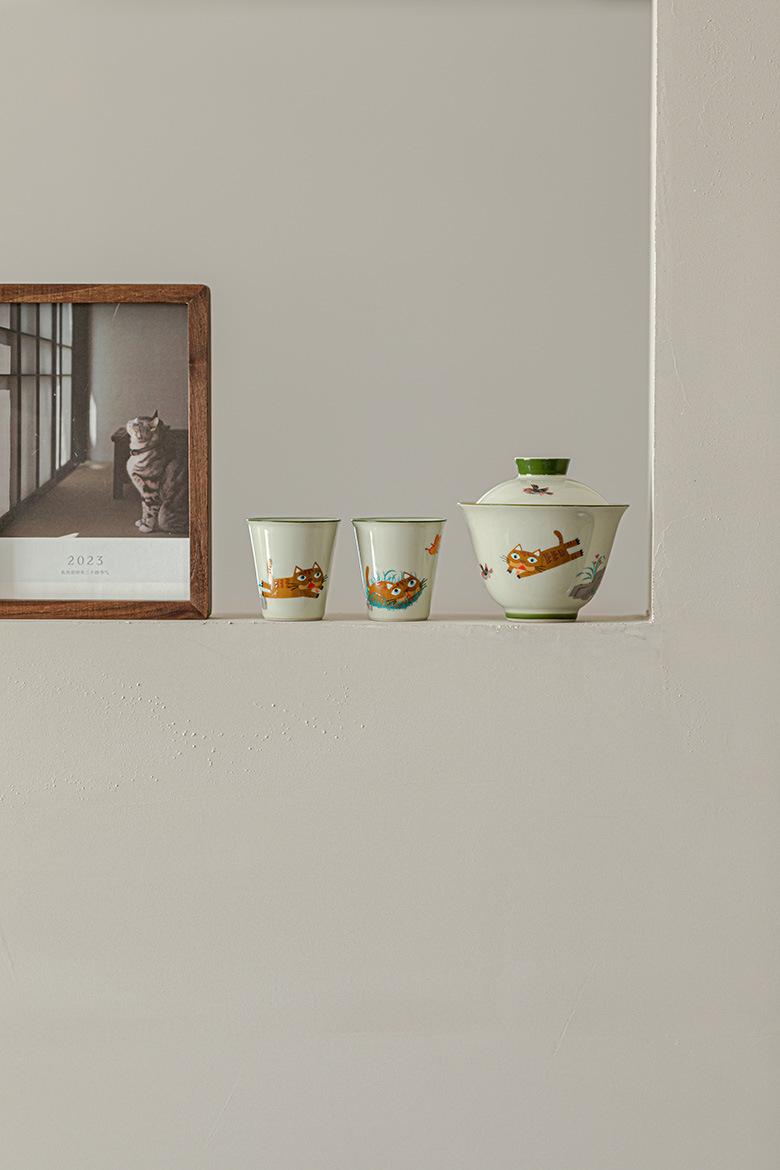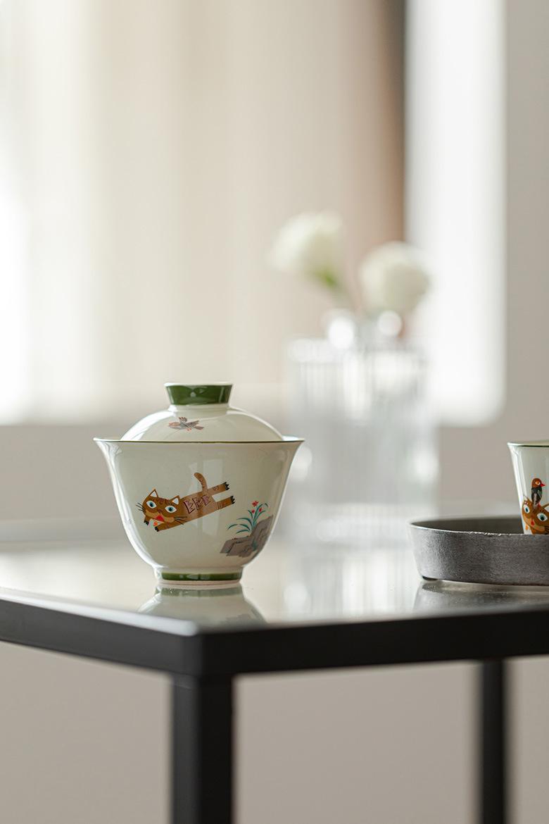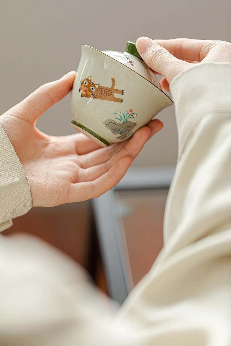 Tazón de cerámica verde secreto con tapa de gato de la serie de diseño Moji Lu Qingde, juego de té de kung fu, tazón de té para el hogar