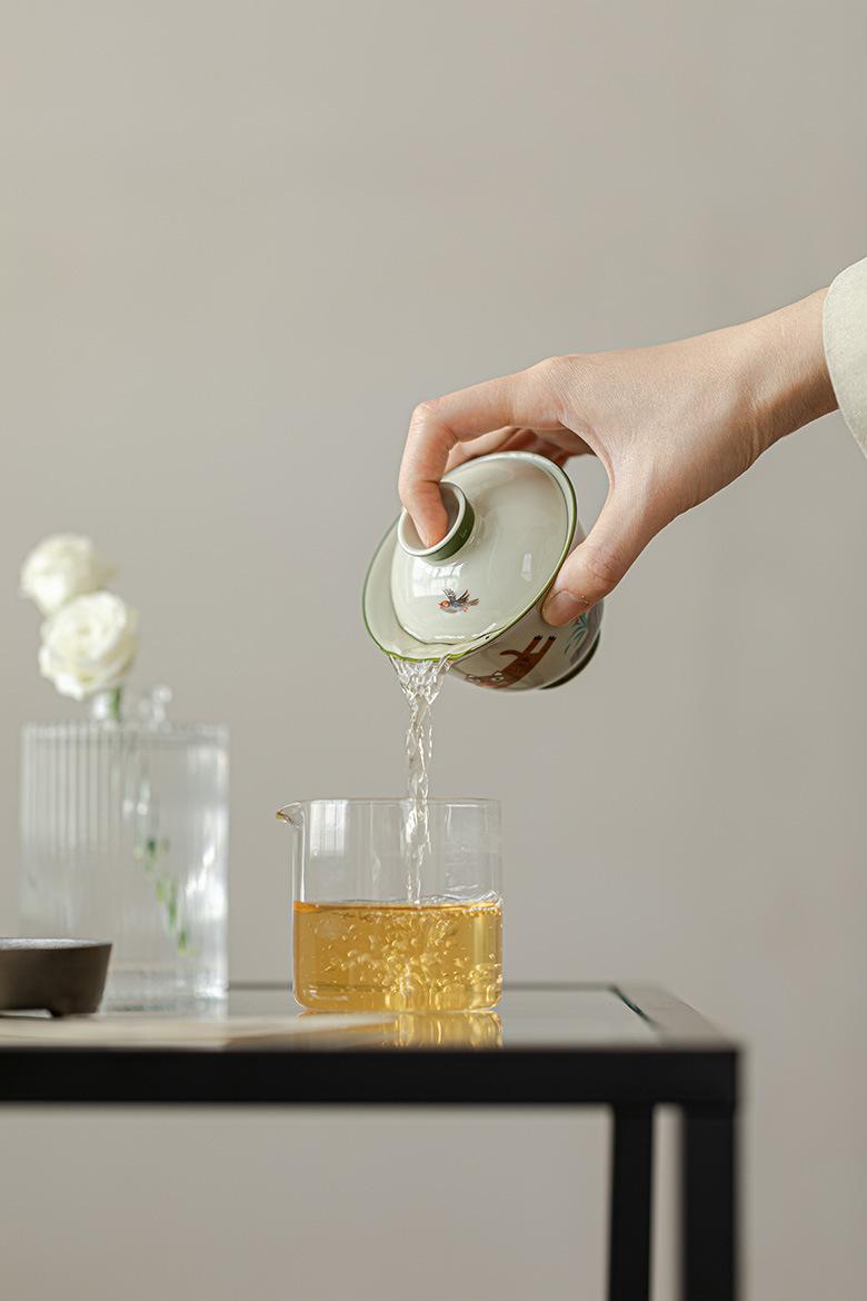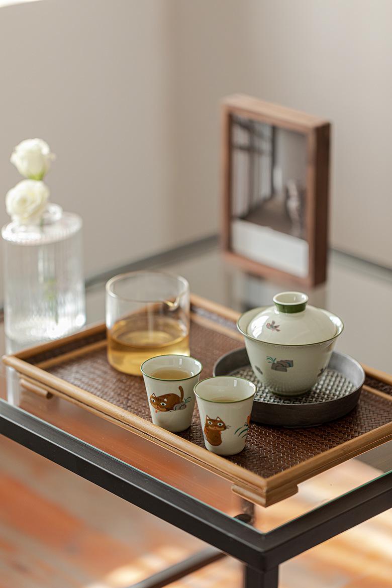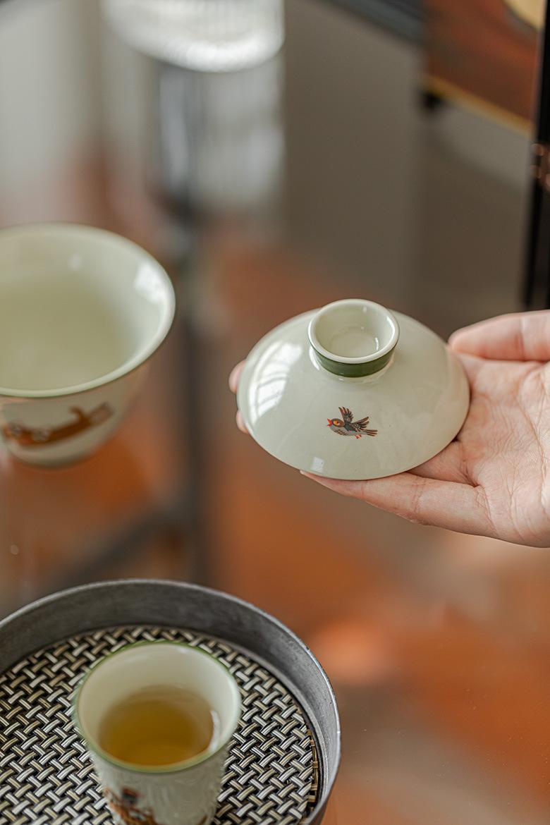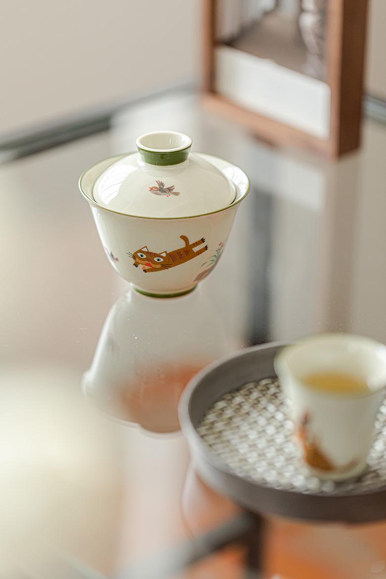Tazón de cerámica verde secreto con tapa de gato de la serie de diseño Moji Lu Qingde, juego de té de kung fu, tazón de té para el hogar