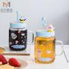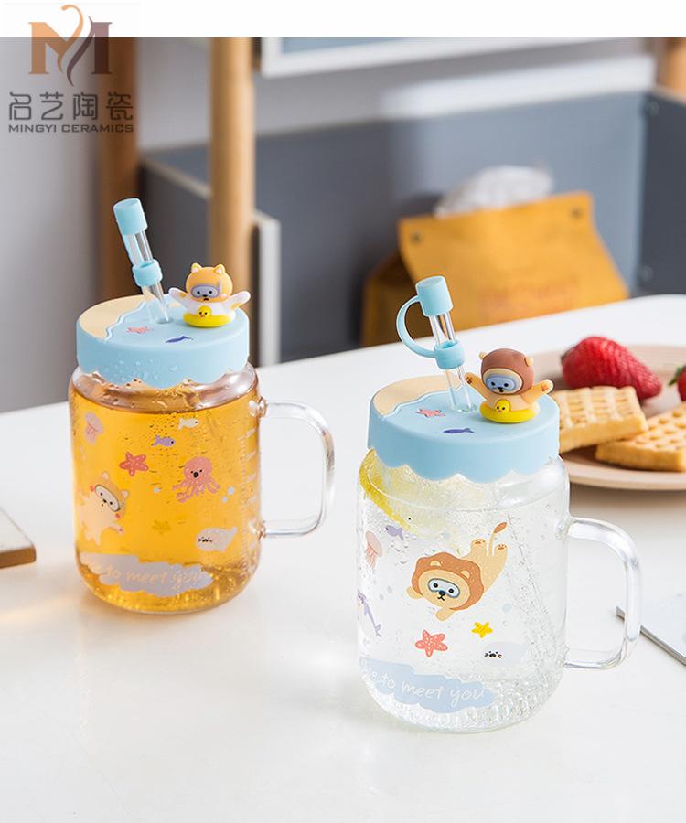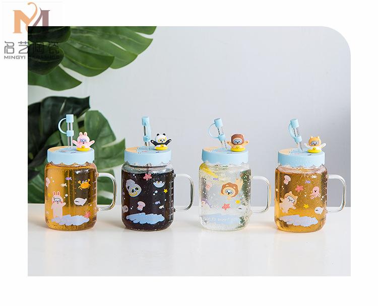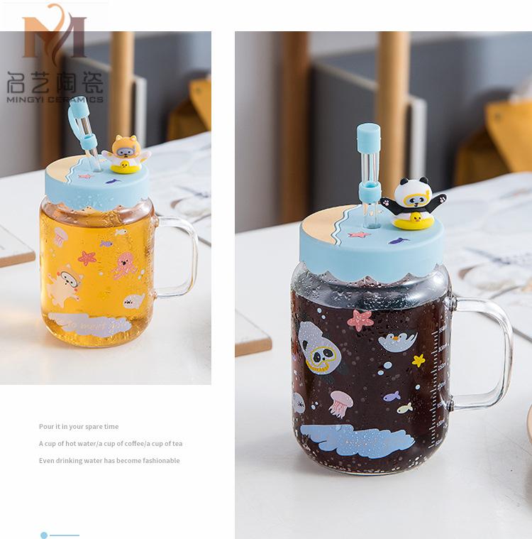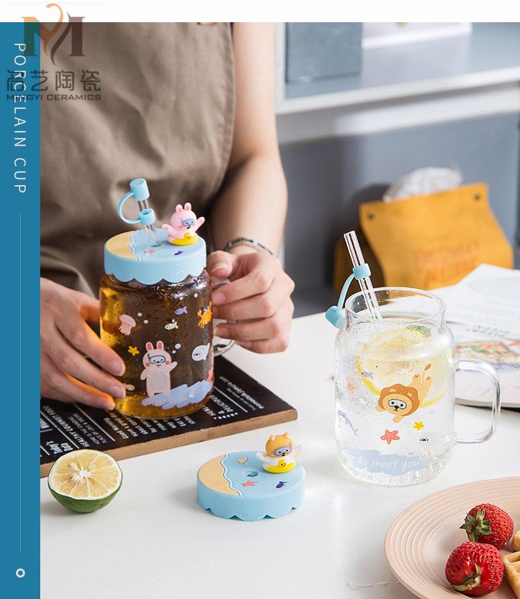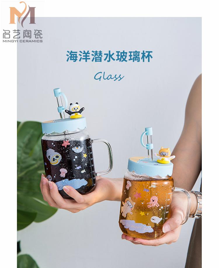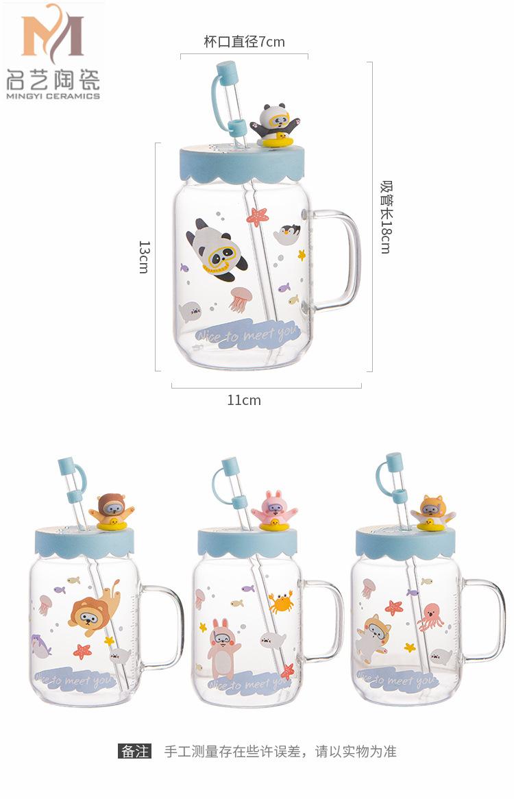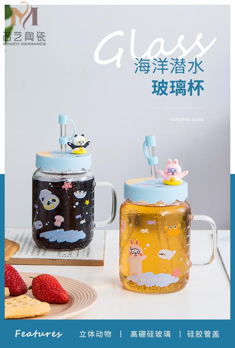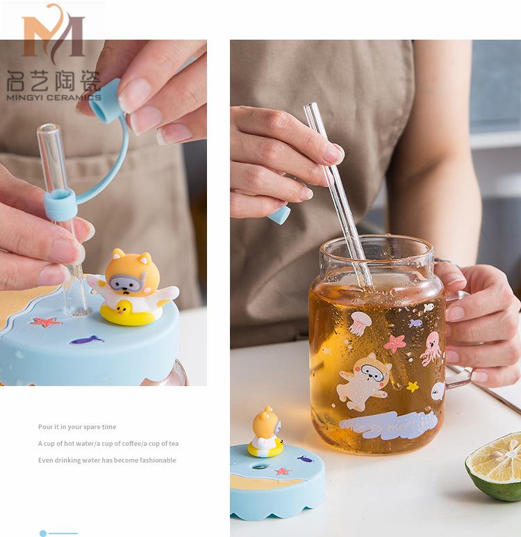 Vaso de agua infantil con tapa de silicona y pajita de la serie Ocean Series, de vidrio, con diseño de dibujos animados, ideal para leche.