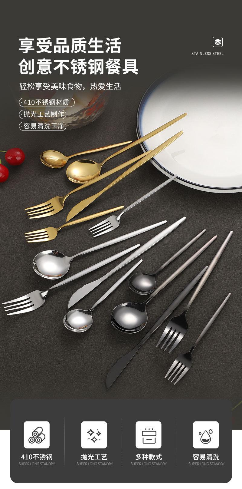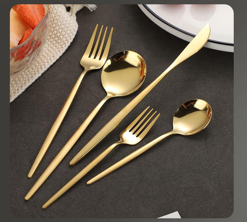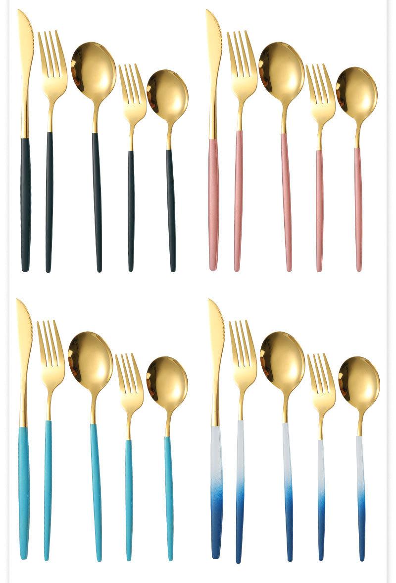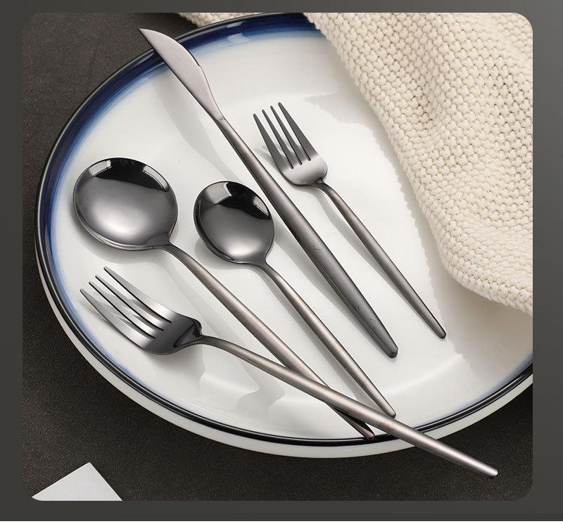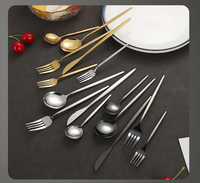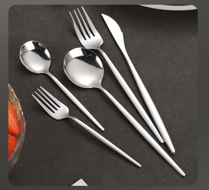Juego de vajilla occidental: cuchillo portugués, tenedor y cuchara, cinco piezas principales: cuchillo para carne de acero inoxidable, tenedor y cuchara, cuchara de postre de punta fina.