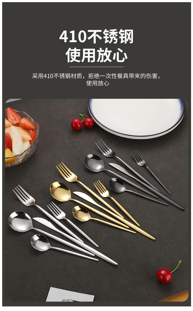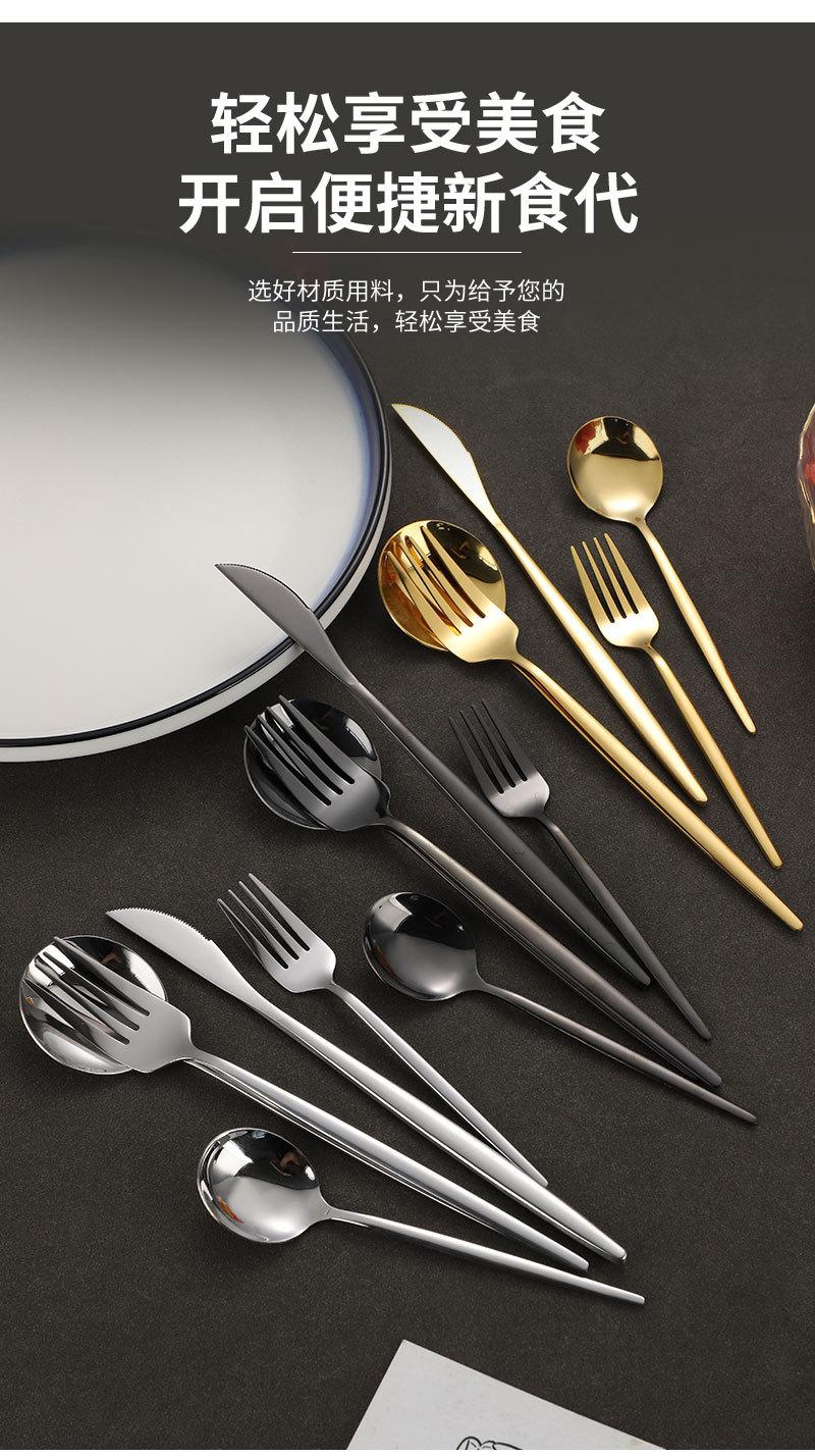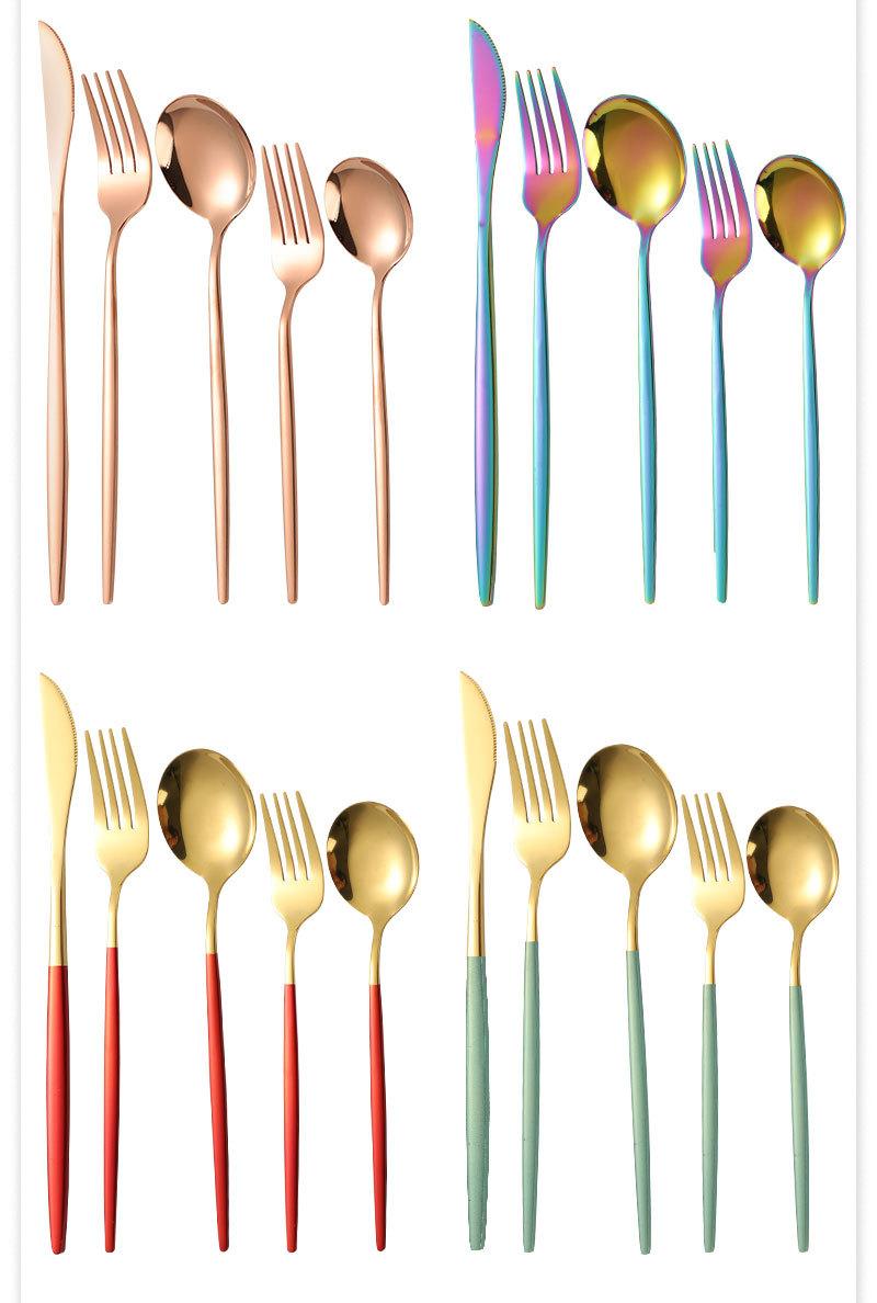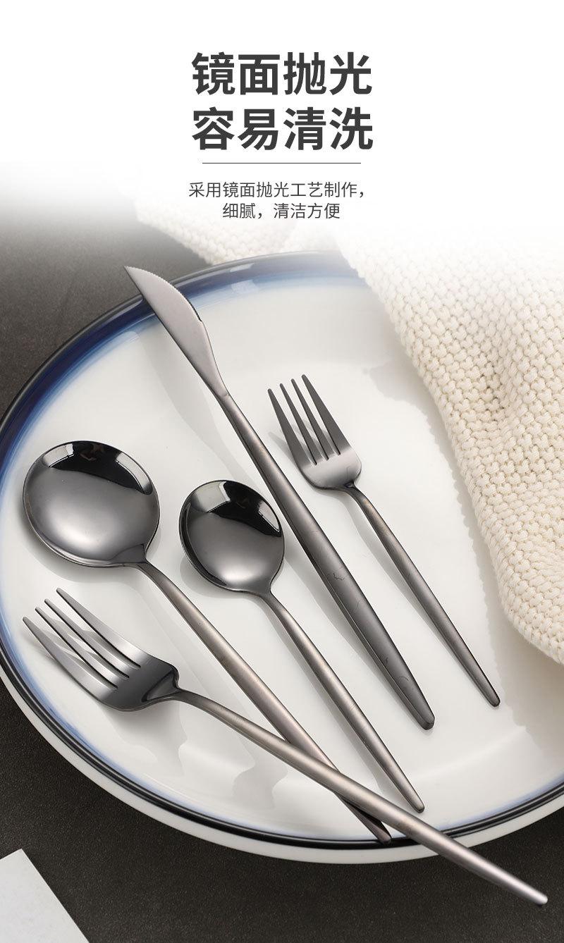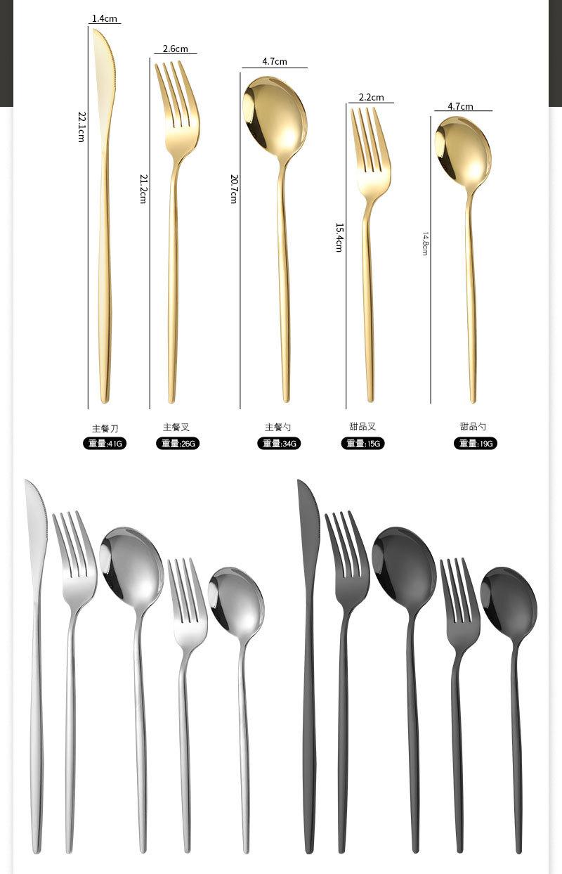 Juego de vajilla occidental: cuchillo portugués, tenedor y cuchara, cinco piezas principales: cuchillo para carne de acero inoxidable, tenedor y cuchara, cuchara de postre de punta fina.