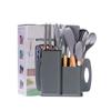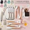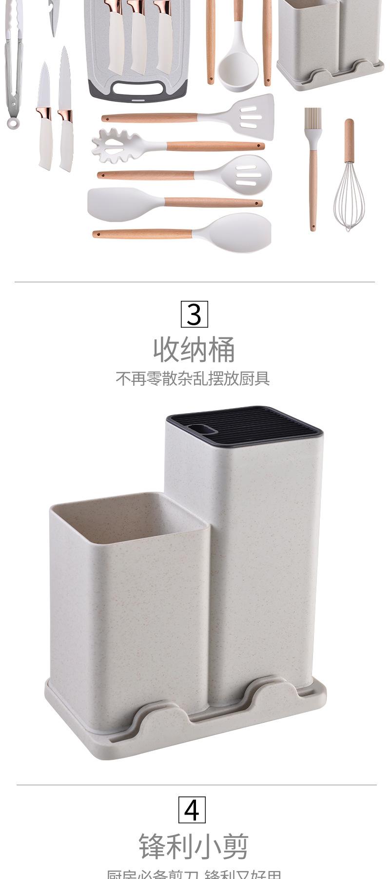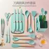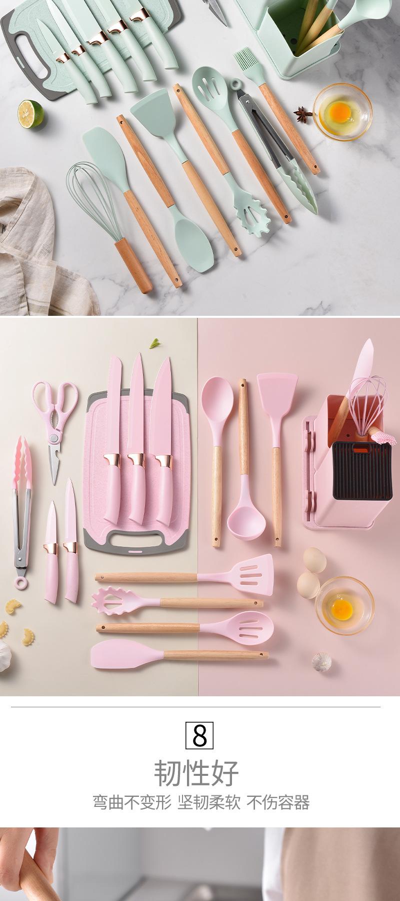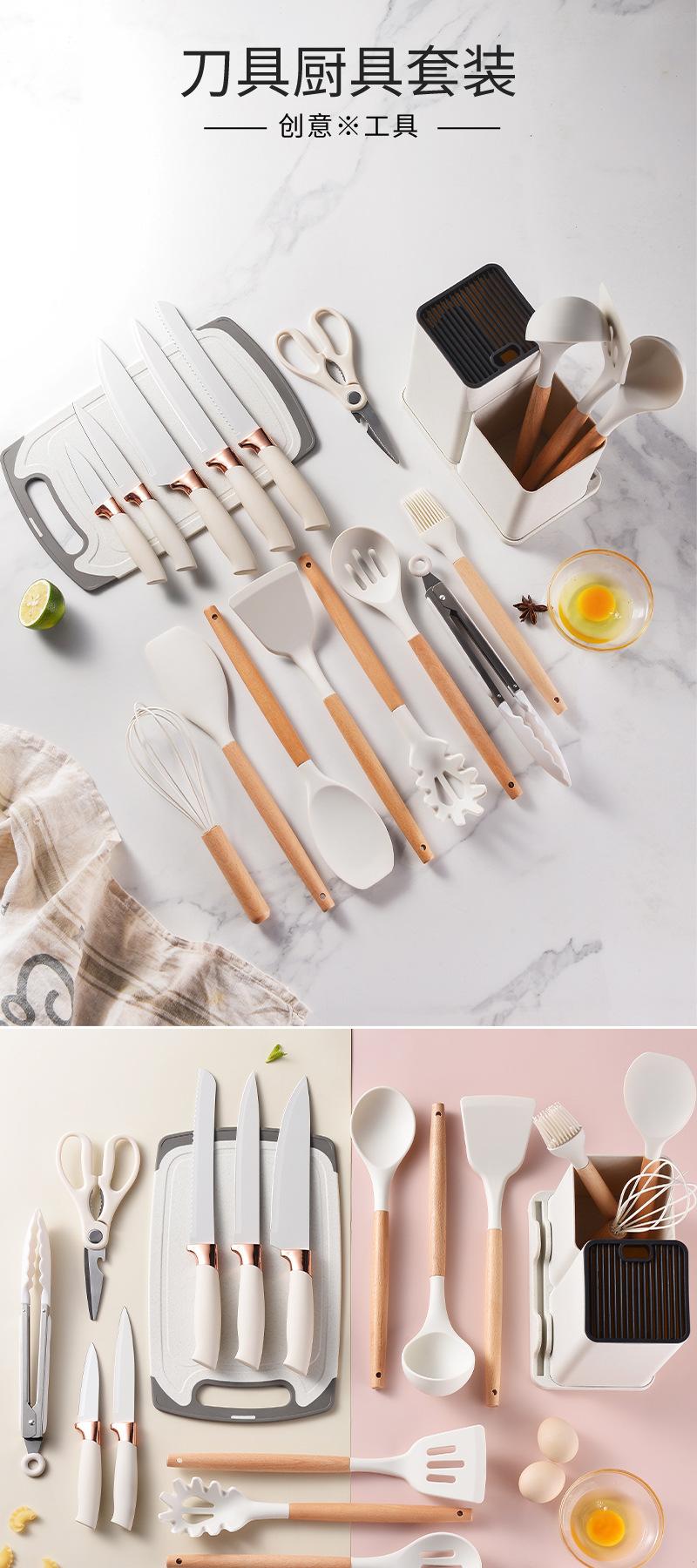 Juego de utensilios de cocina de silicona transfronterizos, 19 piezas, juego de combinación de cortadores, mango de madera, pala, cuchara, juego de cuchillos de acero inoxidable con cubo de almacenamiento
