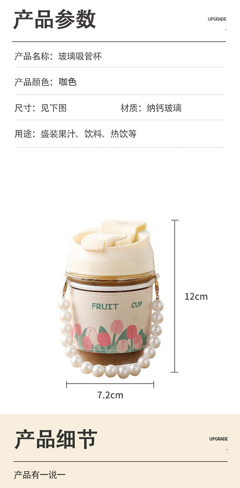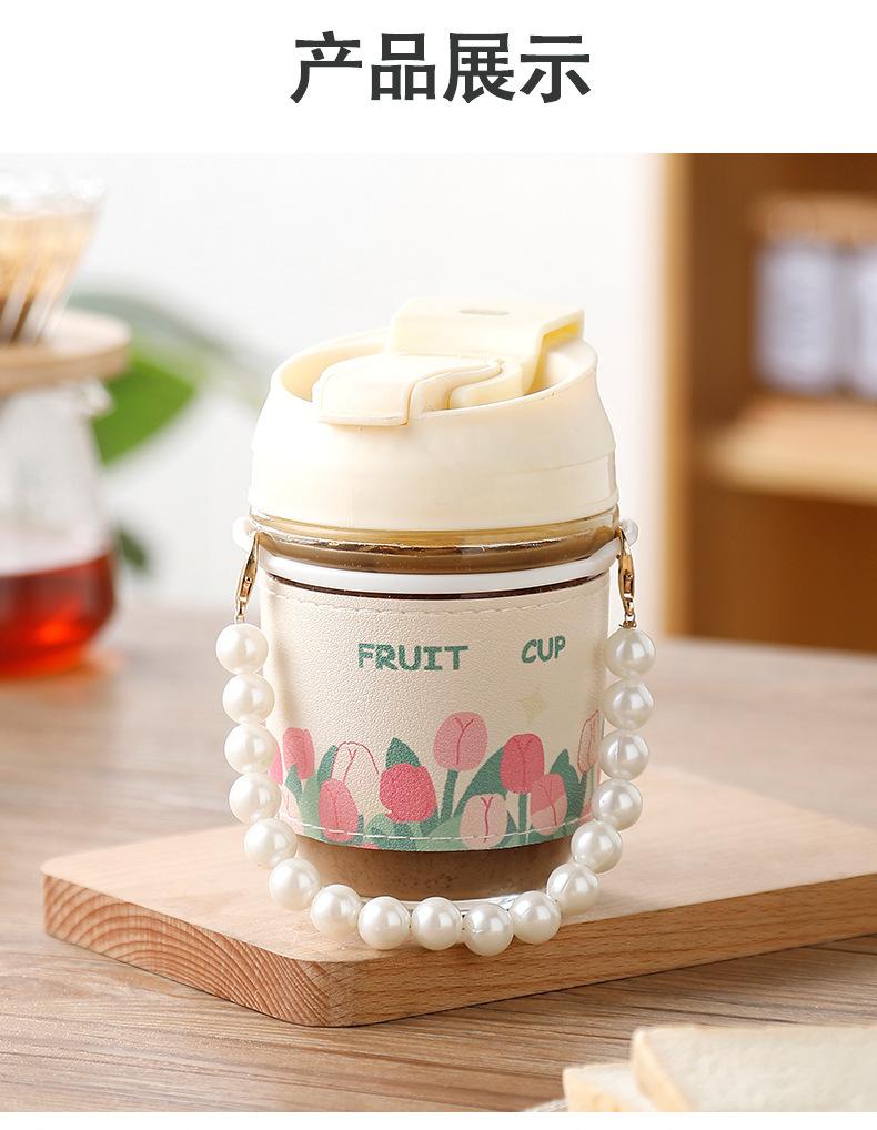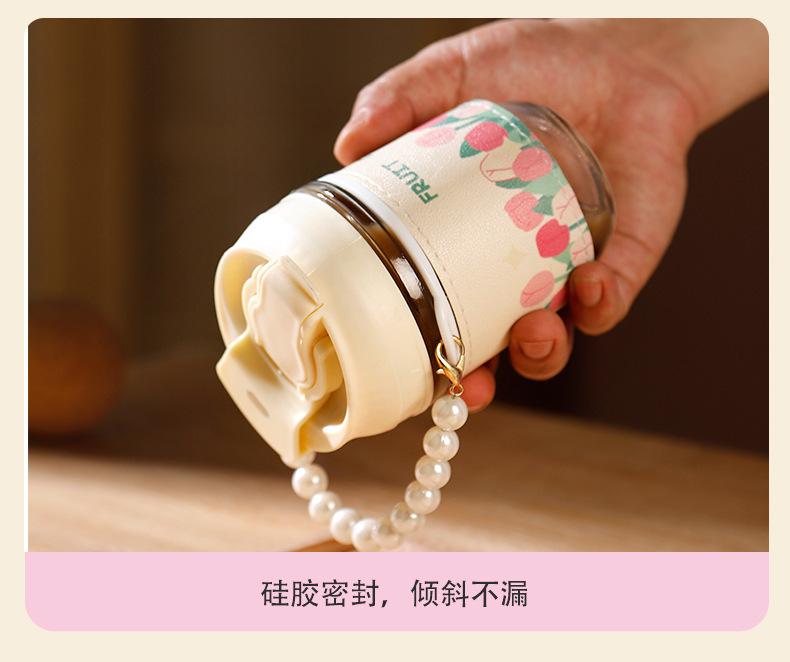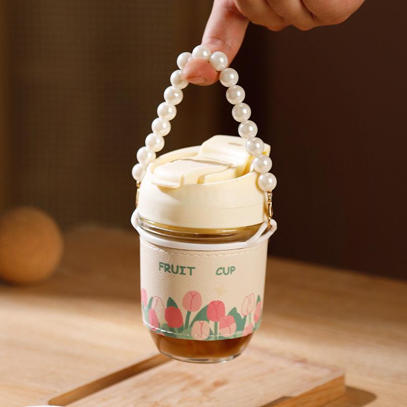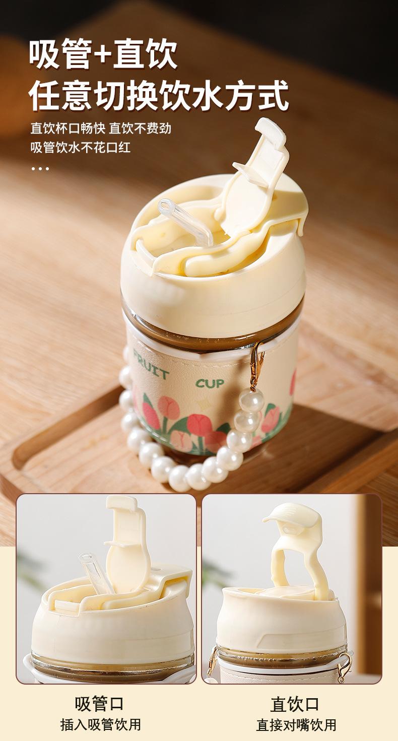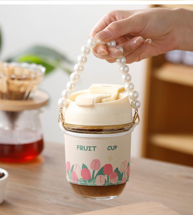 Vaso de Cristal con Perlas de Moda Vaso de Souvenir Vaso de Cristal con Pajita y Tapa Vaso Portátil para Bebidas de Café