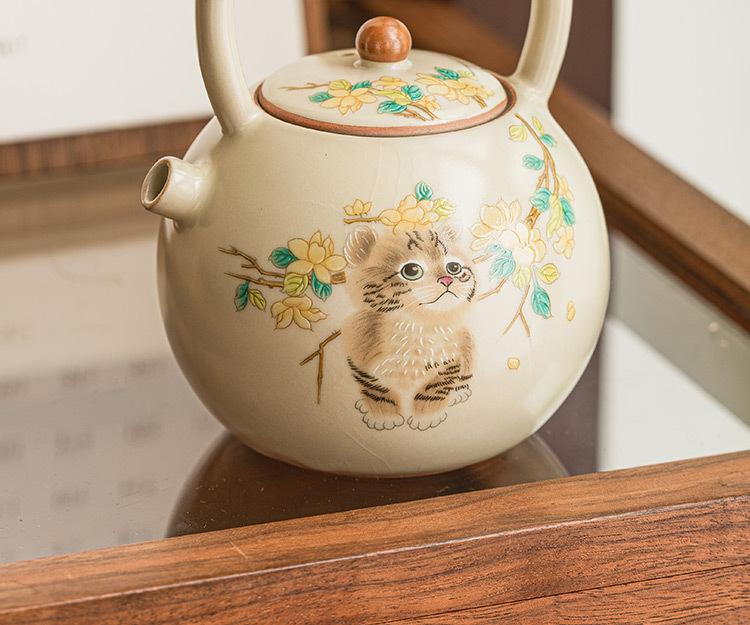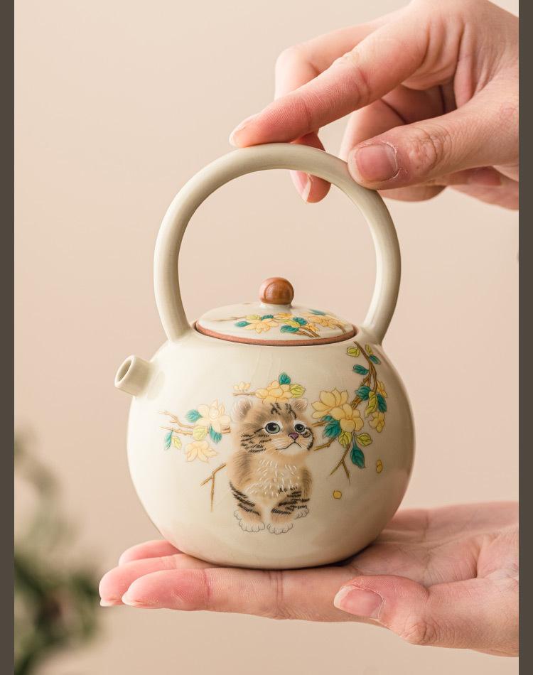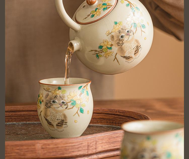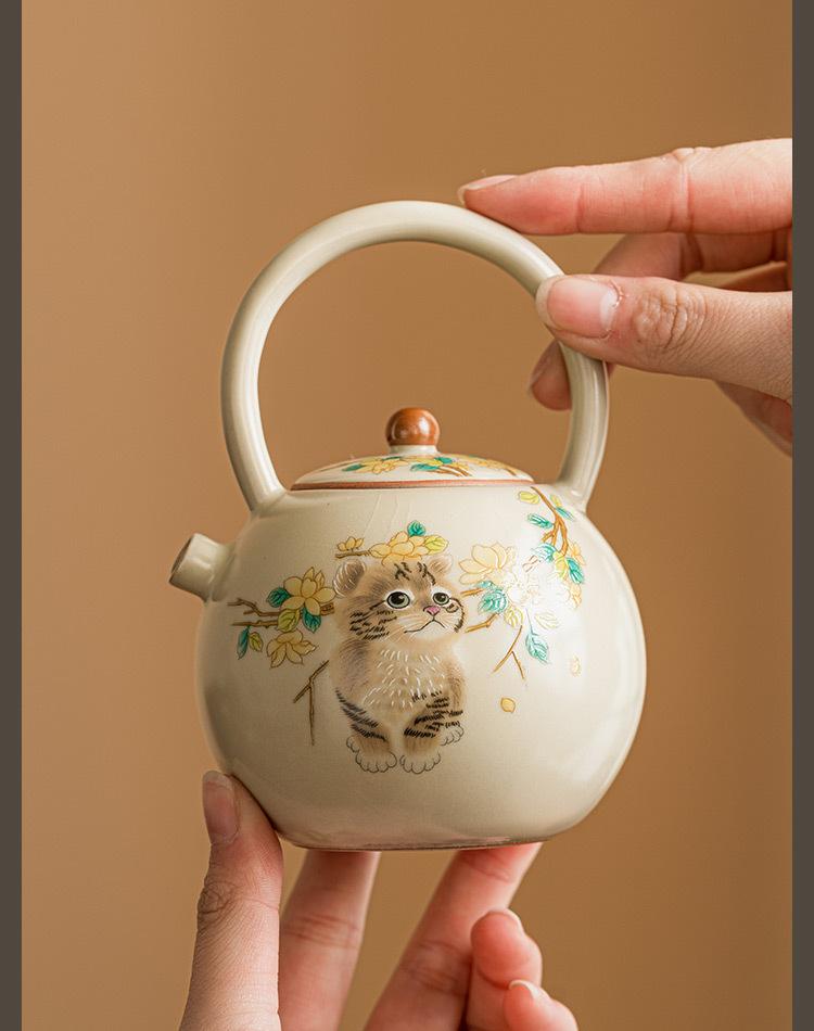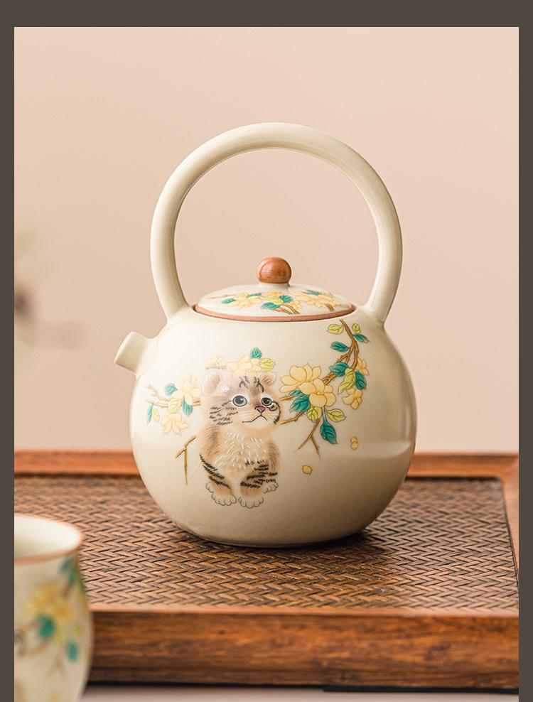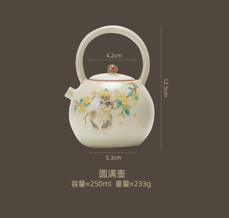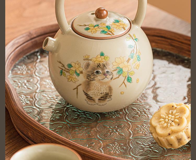 Horno Ru gato lindo tetera de elevación de haz perfecta juego de té traje para el hogar elaboración de té tetera pequeña tetera individual con tapa cerámica pieza abierta se puede levantar