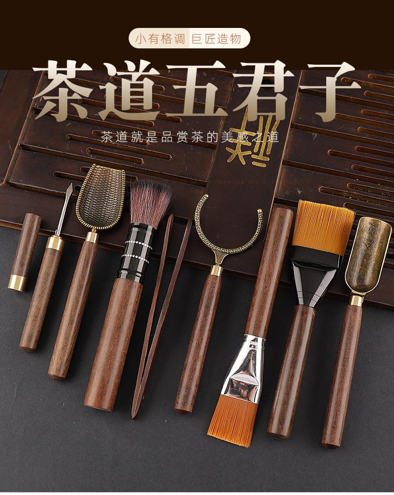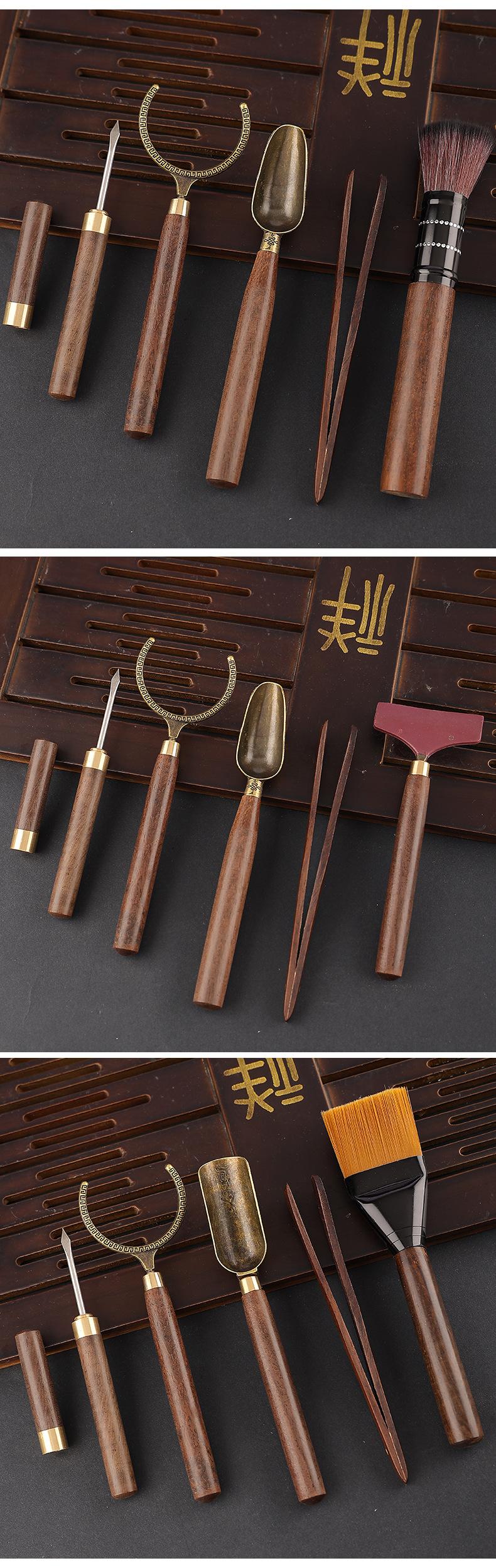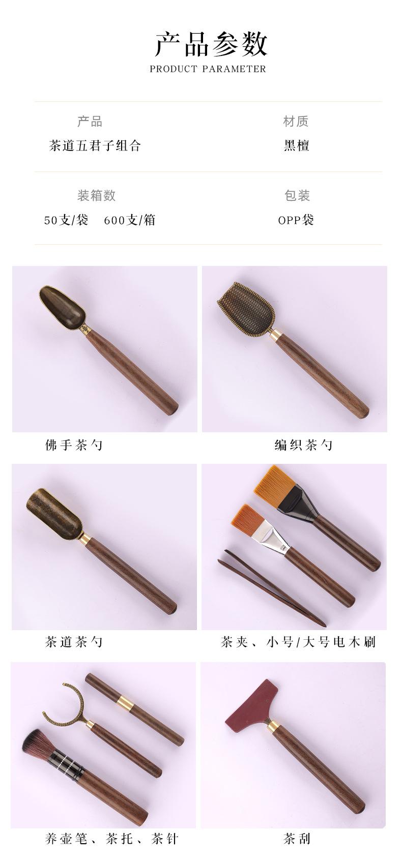 Compra Juego completo al por mayor de accesorios para la ceremonia del té de ébano con pinzas para té de cinco caballeros, cuchillo, cuchara, taza, tenedor, tetera y bolígrafo. al por mayor en Joom.pro