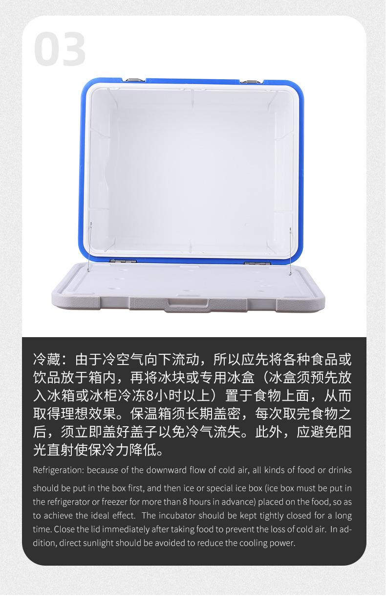 3Refrigeración: Dado que el aire frío fluye hacia abajo, primero debe poner todo tipo de alimentos o bebidas en la caja, y luego poner cubitos de hielo o cajas de hielo especiales (las cajas de hielo deben meterse en el refrigerador o congelador con antelación)8La incubadora debe mantenerse bien cerrada durante mucho tiempo. Después de sacar los alimentos, la tapa debe cerrarse inmediatamente para evitar la pérdida de aire frío. Además, debe mantenerse alejada de la luz solar directa para reducir el efecto de enfriamiento.