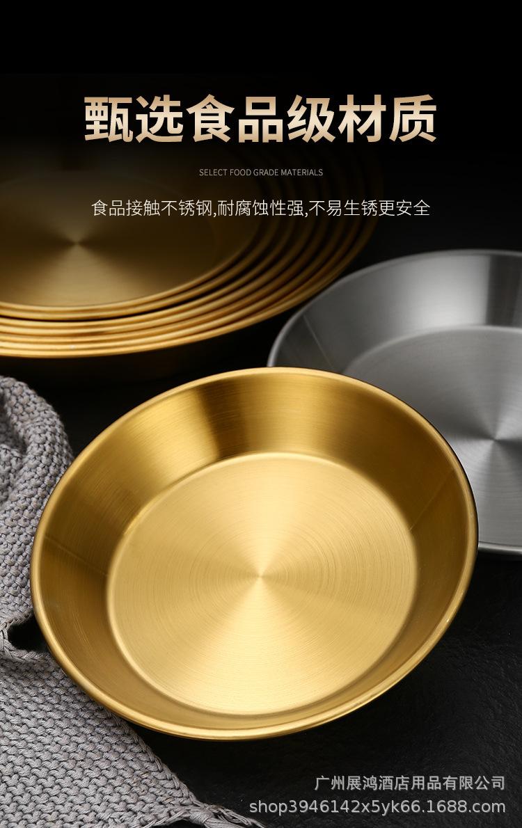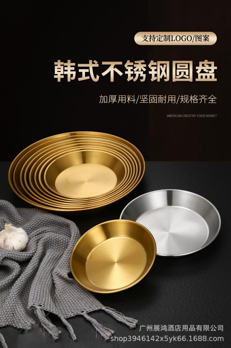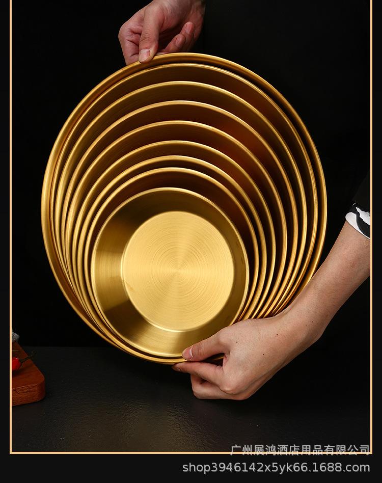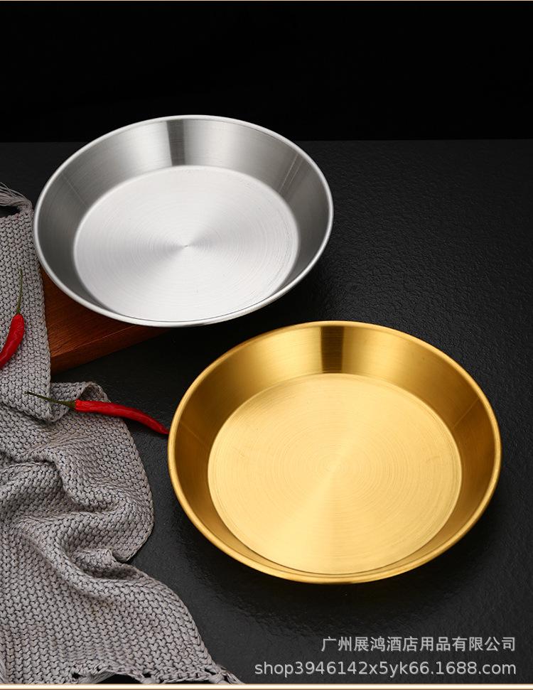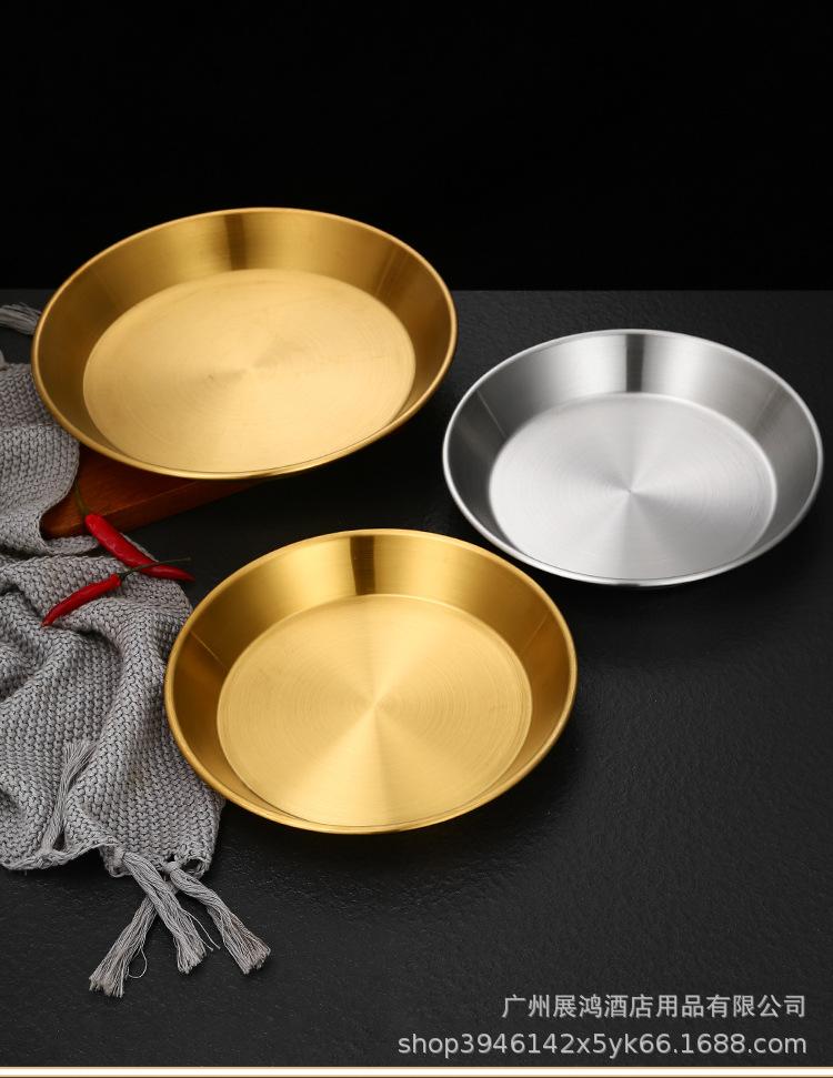 Plato de mariscos al estilo coreano, plato de acero inoxidable, disco de fondo plano, plato de pizza comercial, plato para barbacoa, bandeja redonda dorada