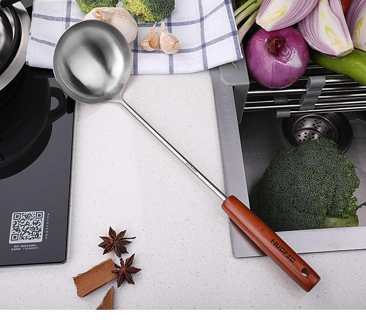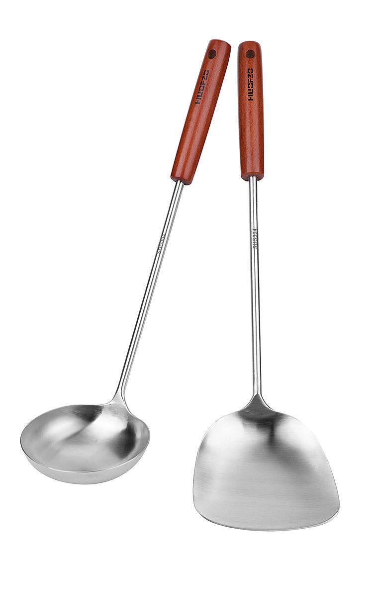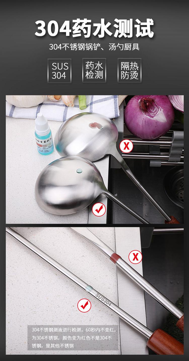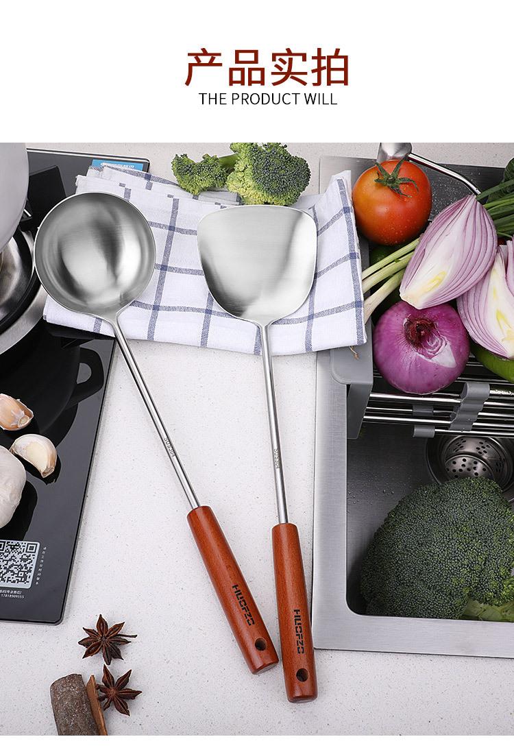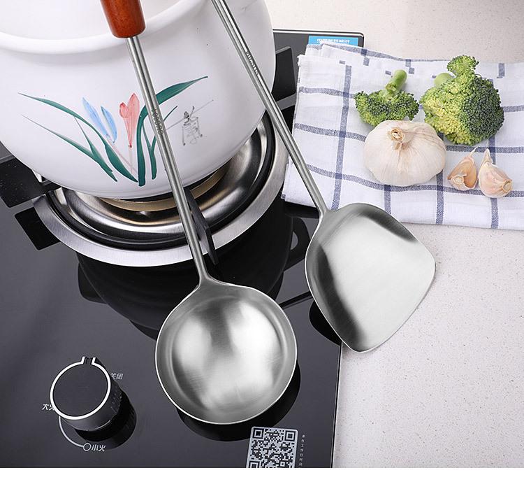 Juego de cuchara y pala de cocina de acero inoxidable 304 para cocinar, con mango de madera para el hogar, cuchara para sopa, pala para cocinar en la cocina.