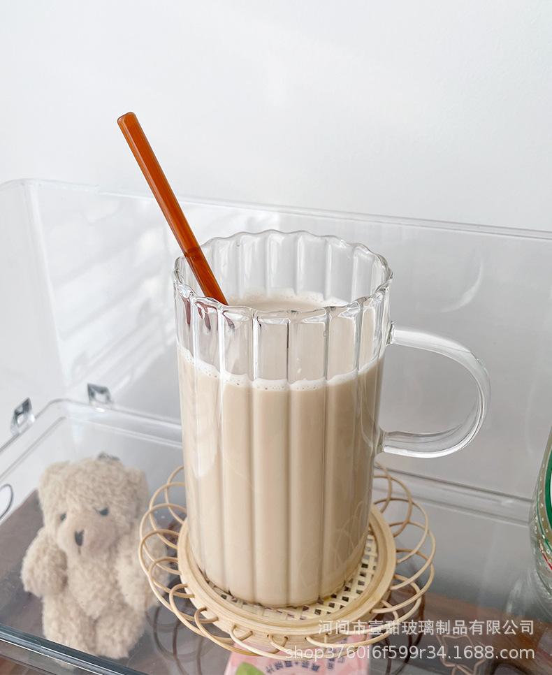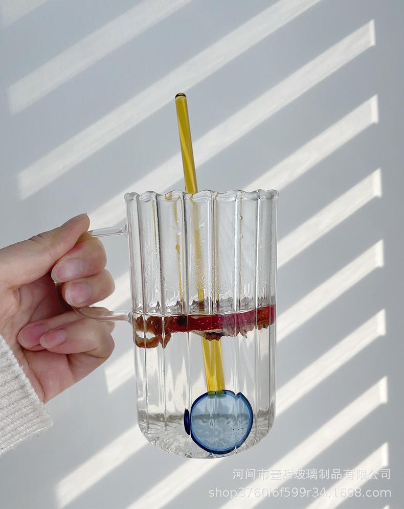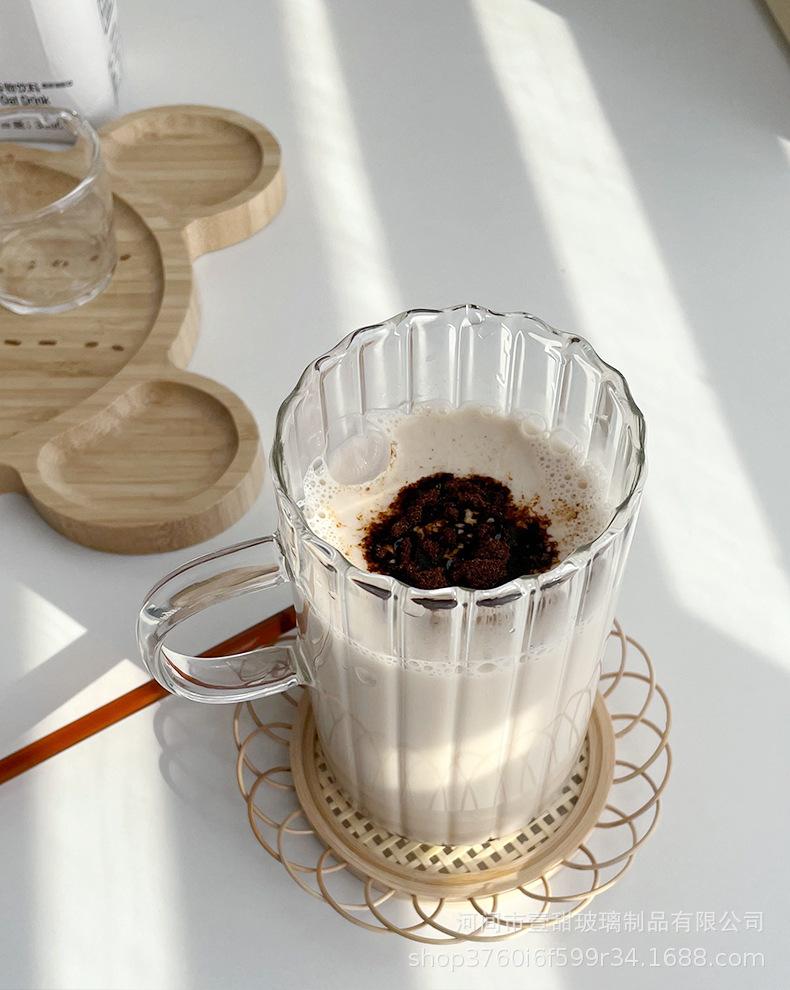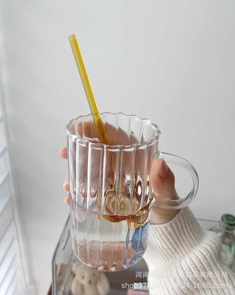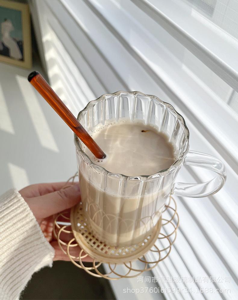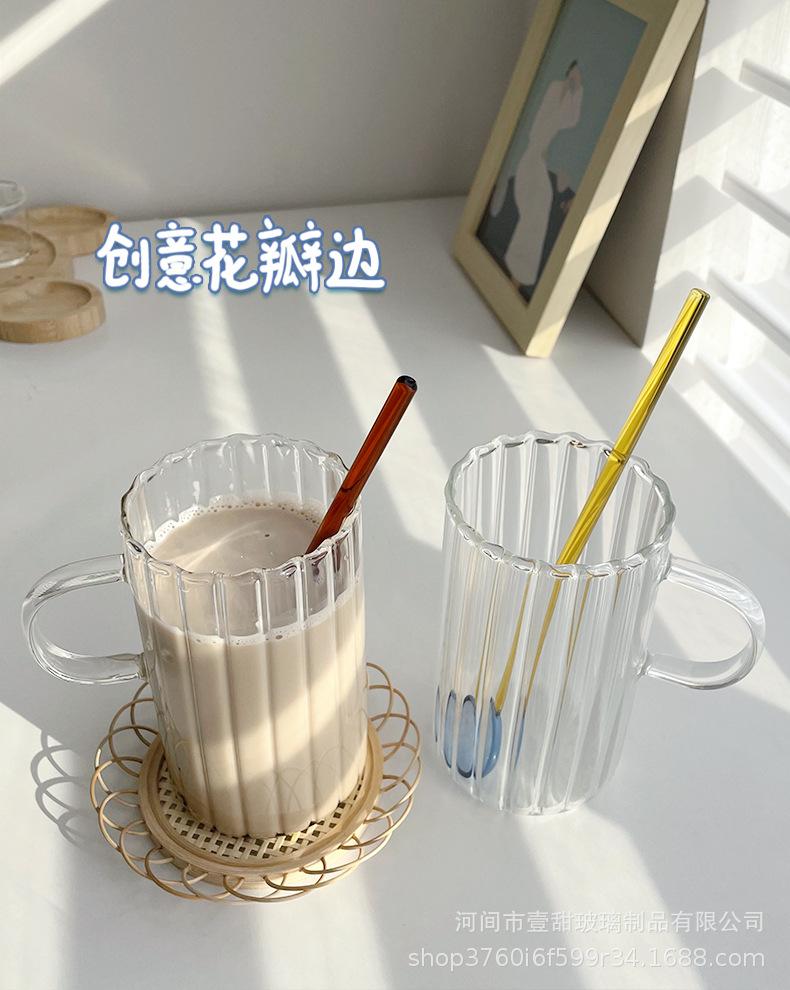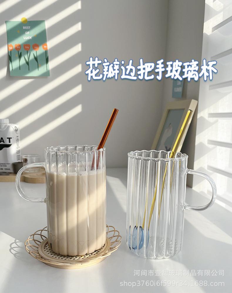 Taza de café, leche y agua de cristal con correa lateral de pétalos creativos de estilo ins y diseño vertical simple y de aspecto alto.