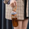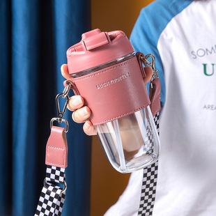 Taza de café de doble pared para beber directamente con pajita, taza de plástico tritán, creativa funda de cuero con correa, portátil, sencilla, para fotos callejeras, taza de agua