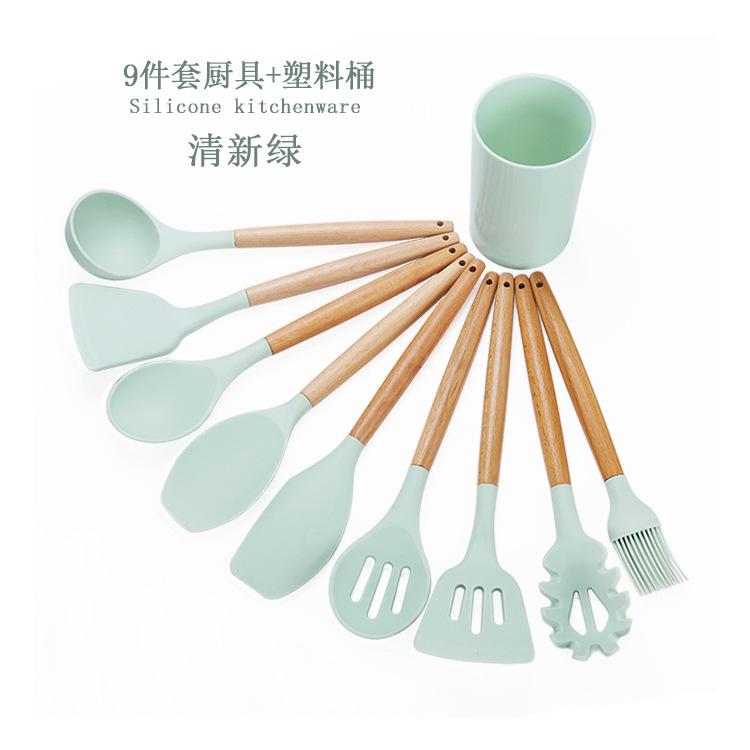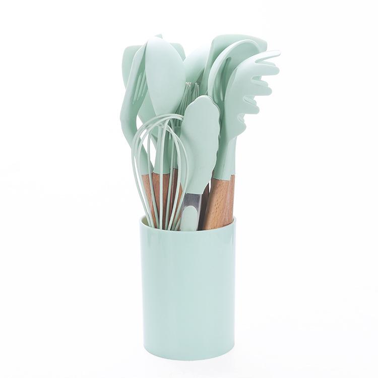 El juego de utensilios de cocina con espátula antiadherente más vendido de Amazon, con barril de almacenamiento y mango de madera, de silicona, color verde fresco, 11 piezas
