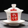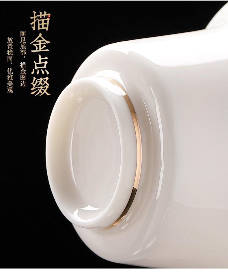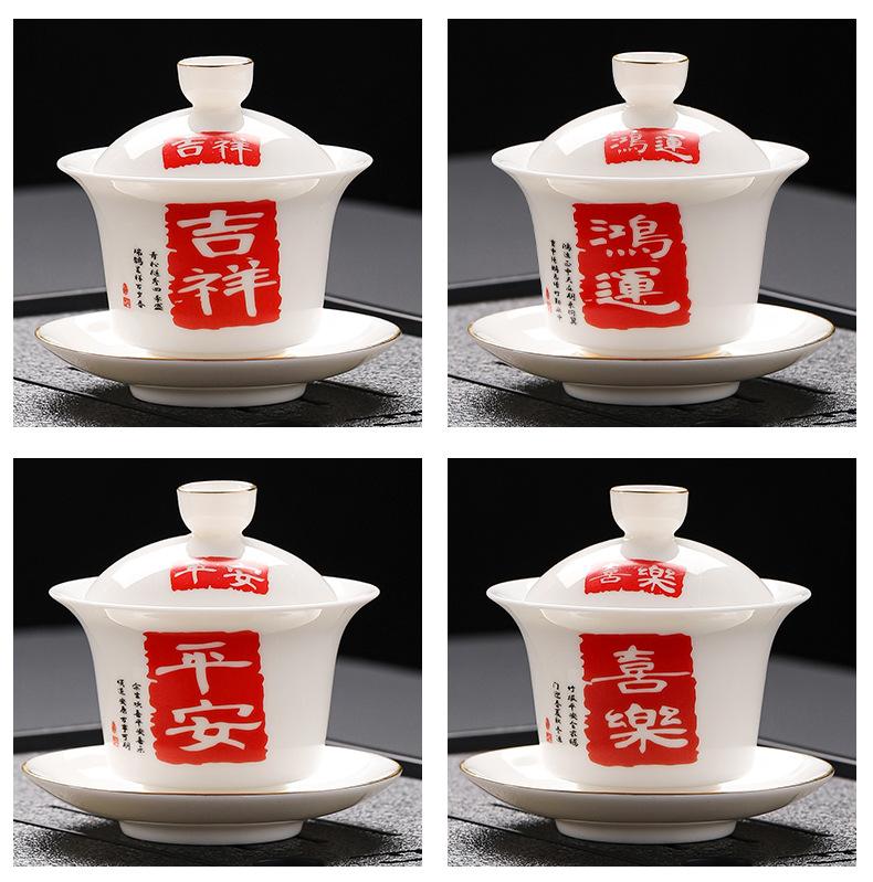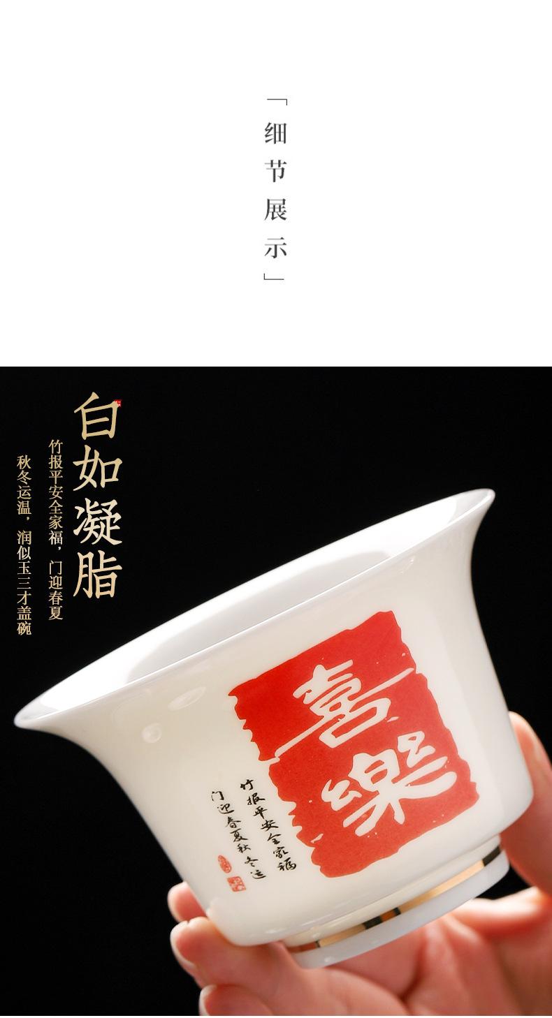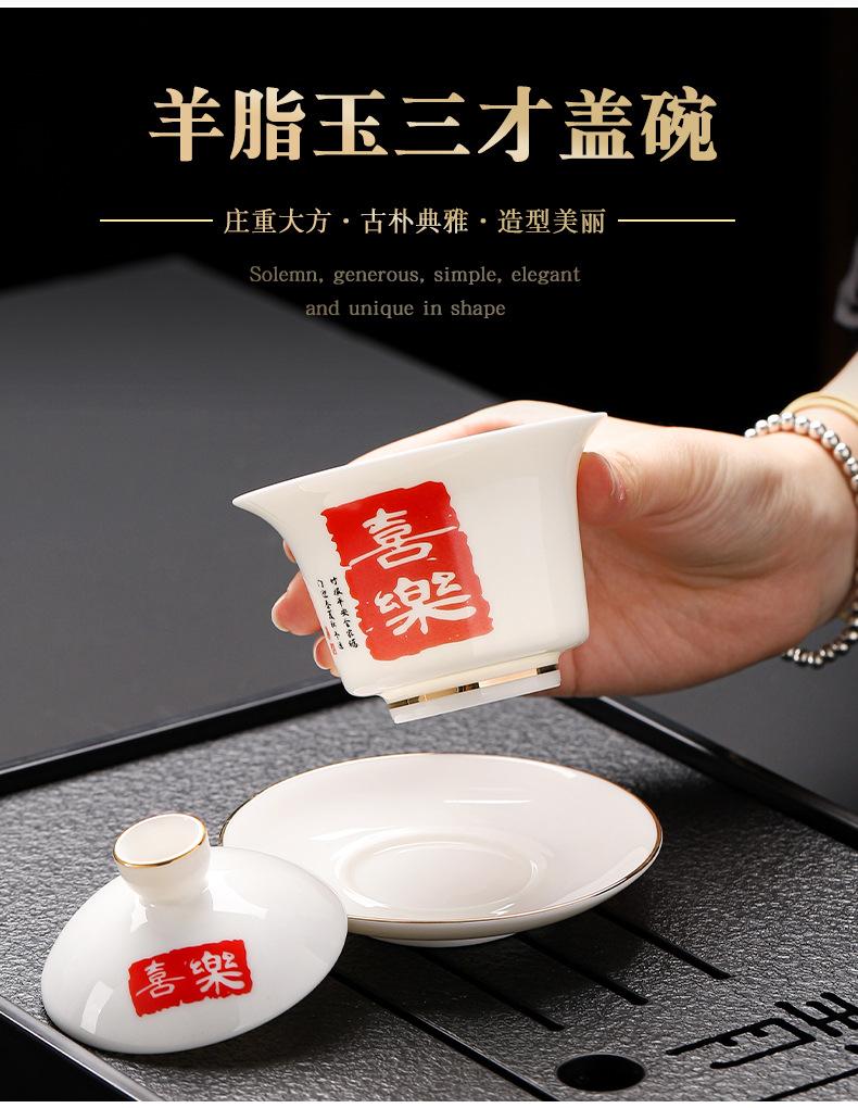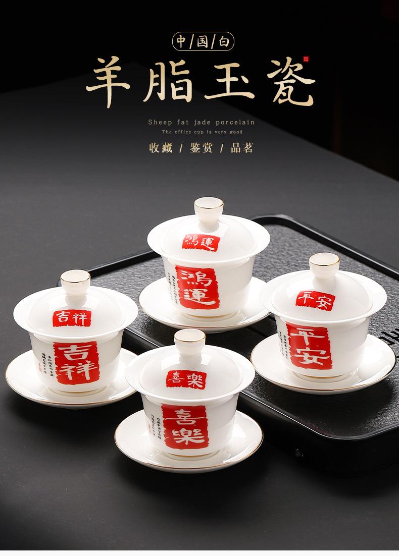 Cuenco de jade con grasa de oveja, cuenco de porcelana blanca con pintura dorada y tres tapas de Cai, juego de té de kung fu, suministros para el salón de té, juego de té para el hogar, cuenco de té