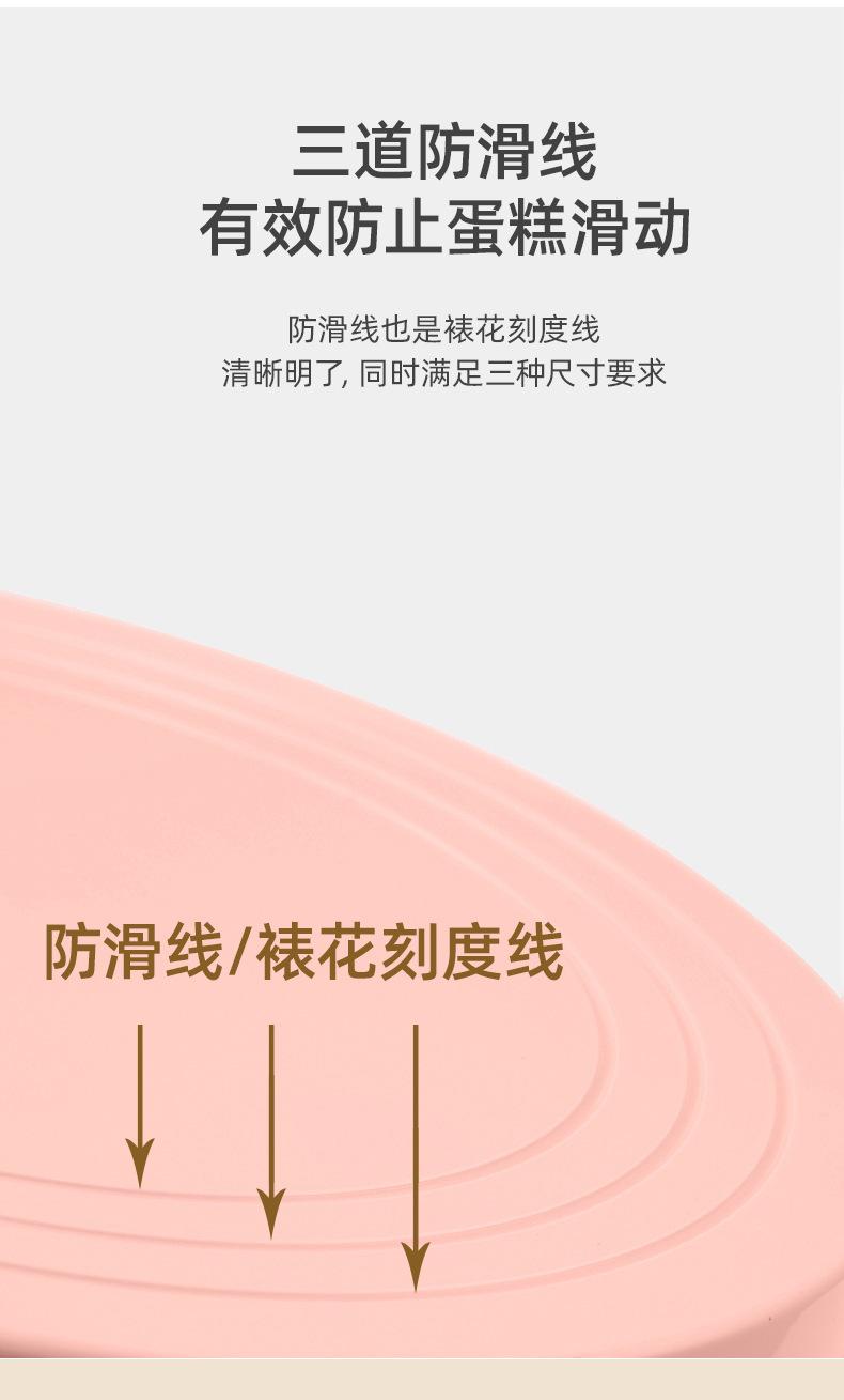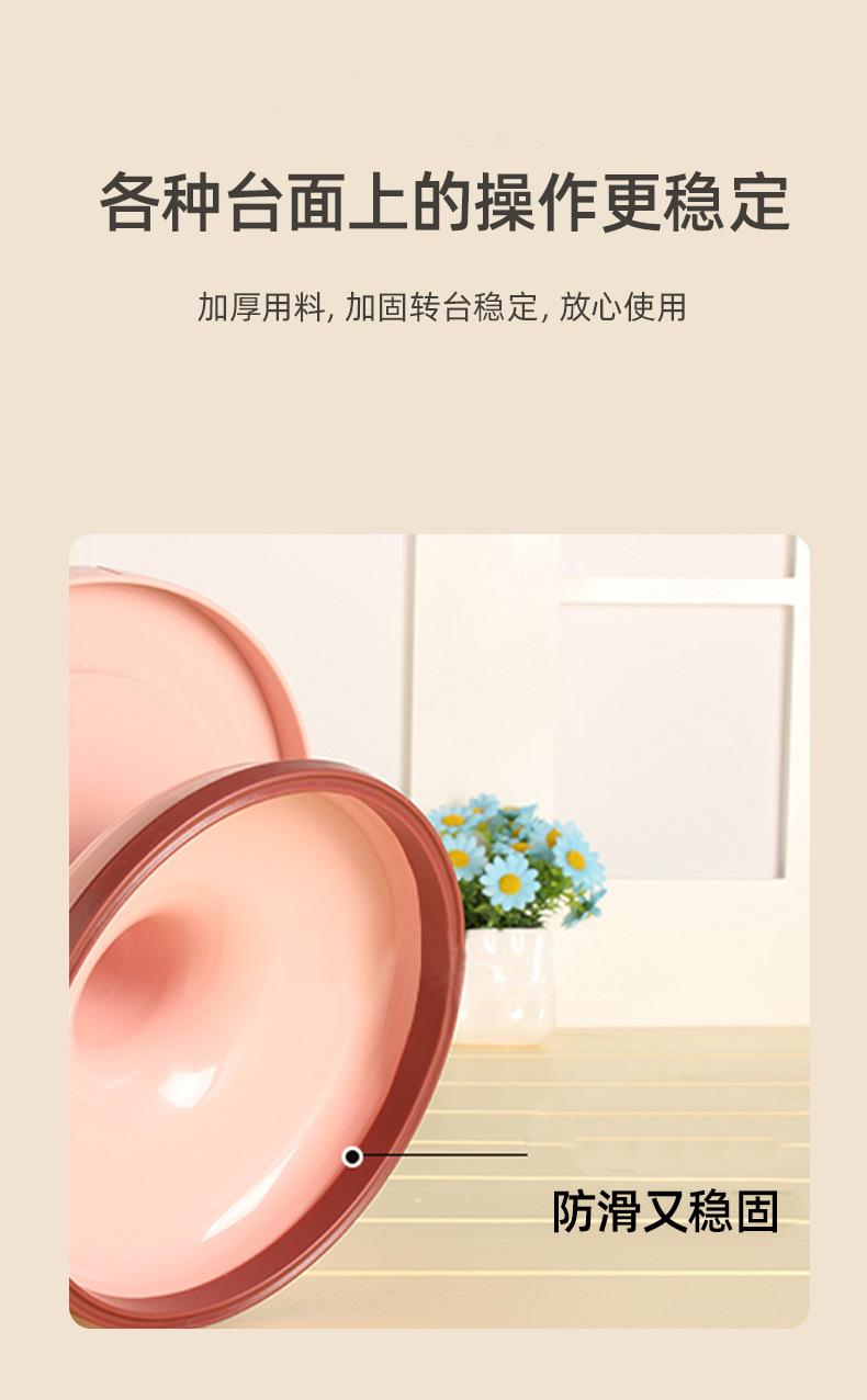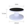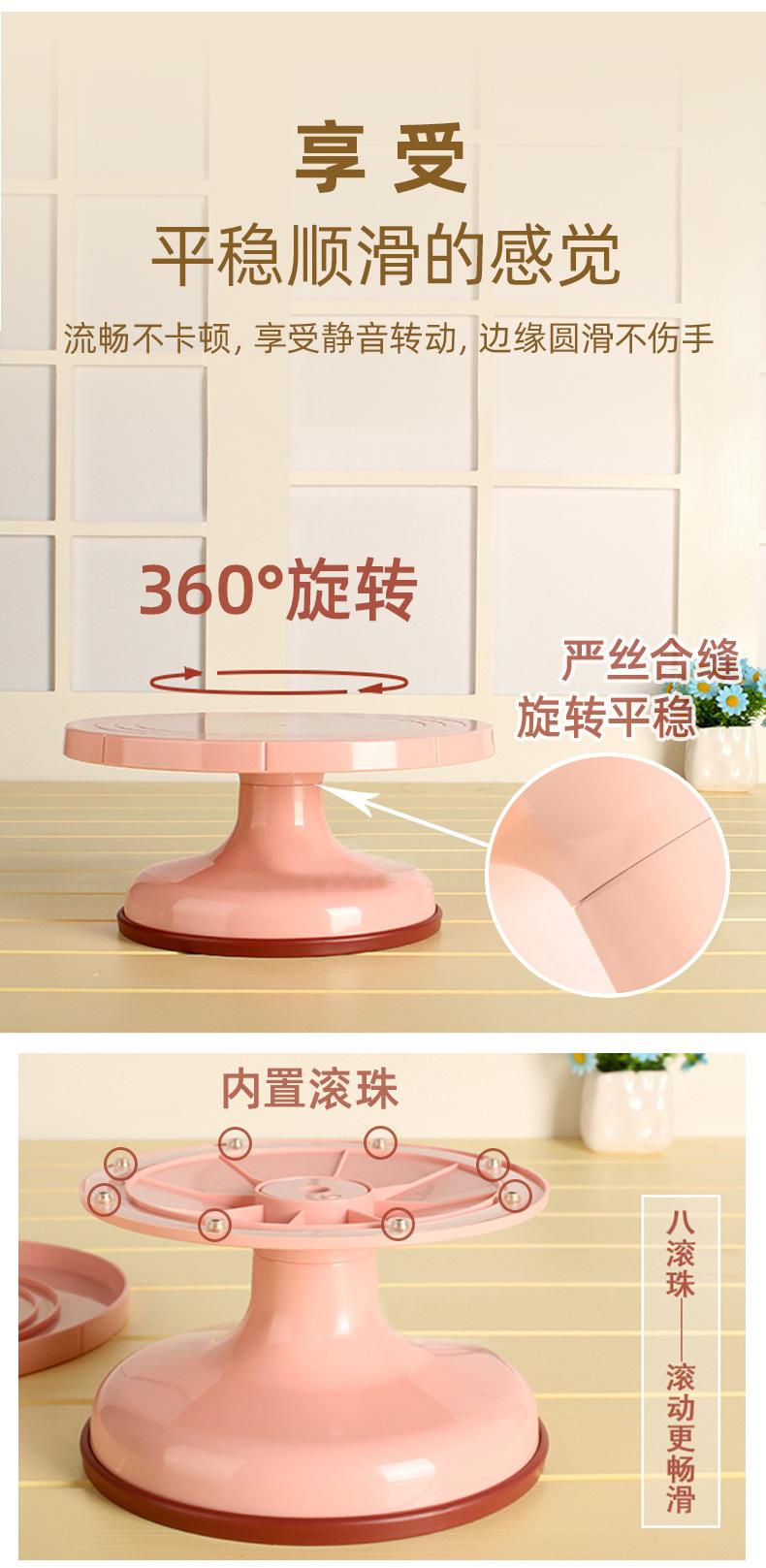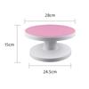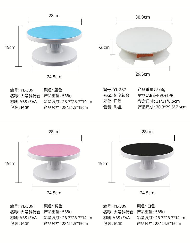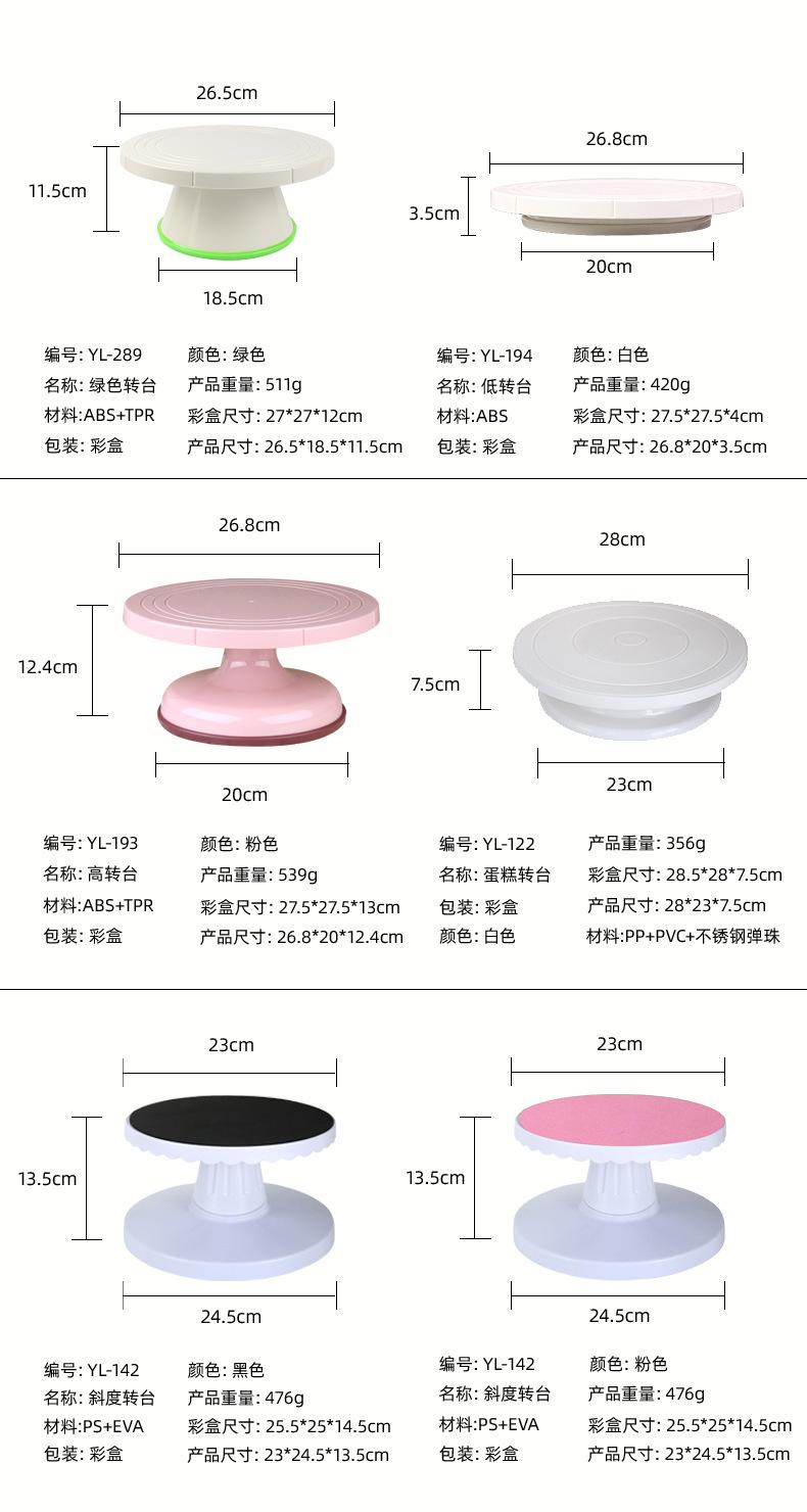 El material es similar a la melamina, resistente a los arañazos y soporta temperaturas de hasta 80 grados. Una almohadilla antideslizante en la parte posterior aumenta la estabilidad del plato giratorio. Es apto para decoraciones de pasteles de menos de 30 cm. La escala de superficie es de 18 cm, 20 cm, 23 cm y 25 cm, lo que facilita su uso, ya que gira con suavidad y sin vibraciones. La almohadilla antideslizante en la parte inferior facilita su manejo.