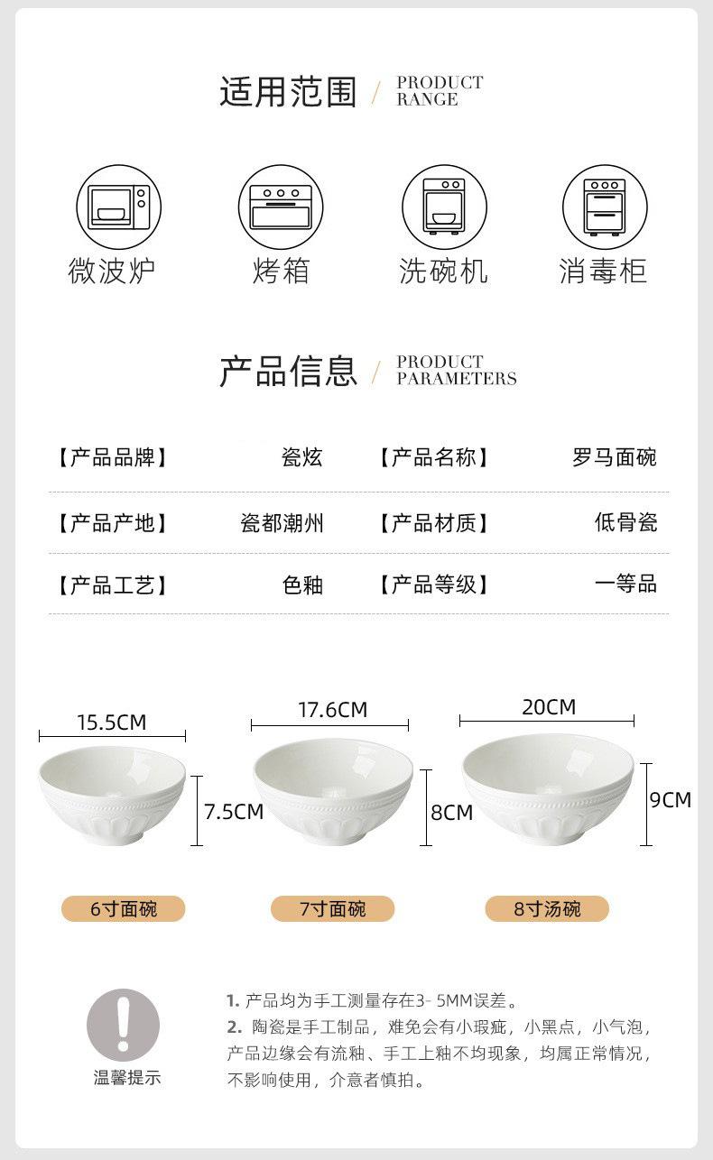 Rome 6 inch bowl (15.5cm * 7.5cm), Rome 7 inch bowl (17.6cm * 8cm), Rome 8 inch soup bowl (20cm * 9cm)